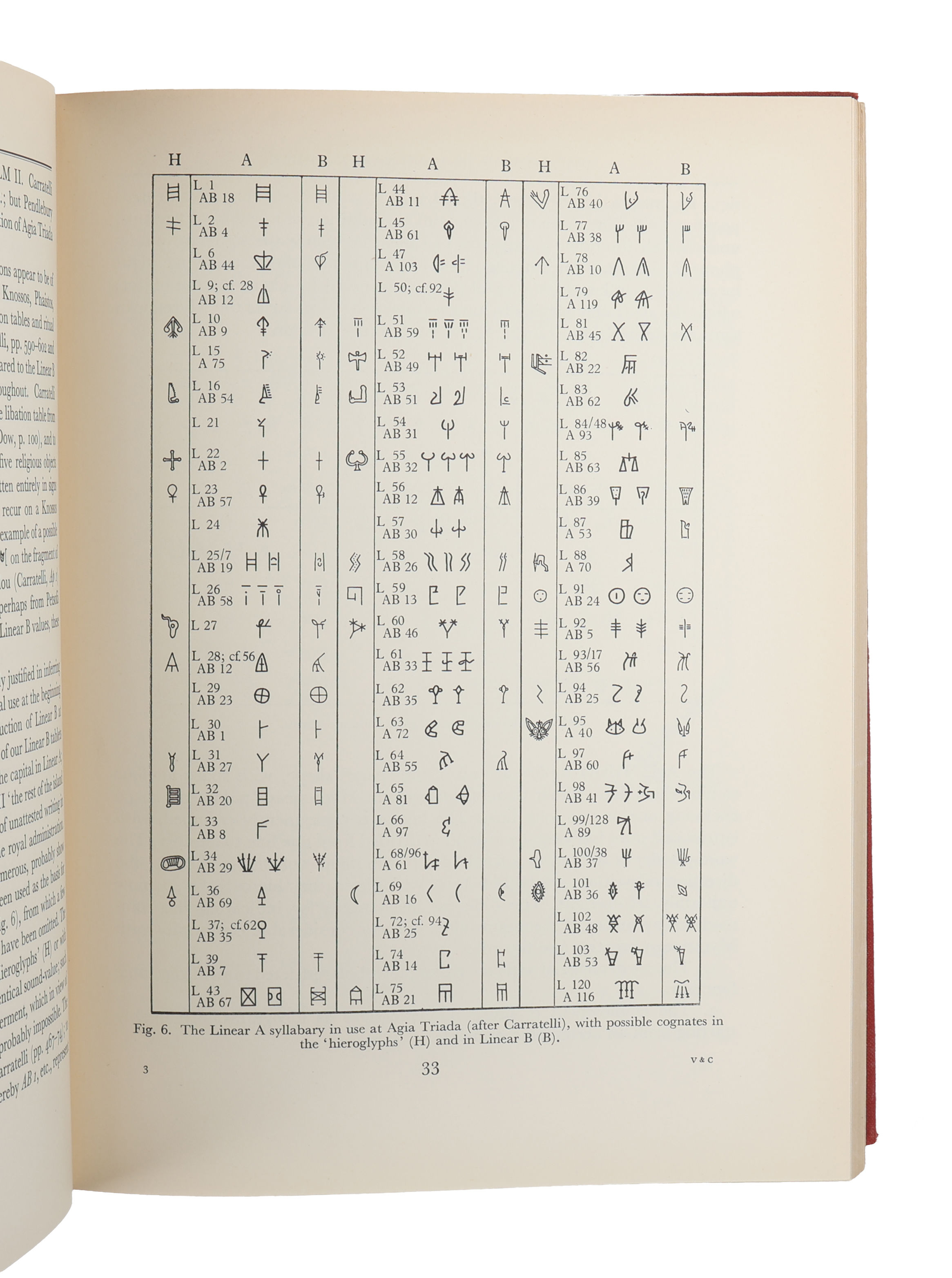 First edition of Ventris and Chadwick's exceedingly important work which constitutes the very first practical translation of Linear B (a syllabic script that was used for writing Mycenaean Greek - the earliest form of the Greek language) and certainly the earliest thorough discussion of Linear B translation. The decipherment of Linear B was not only of great interest to scholars and researchers, but also profoundly influenced European cultural history and affected how to define 'The Cradle of Europe': It demonstrated a Greek-speaking Minoan-Mycenaean culture on Crete, and presented Greek in writing some 600 years earlier than what was thought at the time.Linear B was initially deciphered by Ventris and Chadwick between 1951 and 1953. They published they first theories is 1952 in a short paper, a work which is still surrounded by much controversy; the present work is the first to contain what is generally accepted as the first thoroughly satisfying deciphering of Linear B. In a BBC radio program in 1952 Ventris concluded that the tablets (the ones translated in the present work) were Greek, and that there finally seemed to be a logical explanation to the mysterious signs: "One of the most interested listeners to the broad cast was a young Cambridge philologist specializing in Greek, John Chadwick. At the time, the Ventris theory was just the latest in a long line of supposed "solution", every one of which had failed. But Chadwick, who had himself failed to read the tablets on the assumption that they were Greek, was interested. On July 9, Chadwick wrote to [Ventris], congratulating him on the solution. They formed a close association and together wrote a report of the decipherment [Their 1952-paper]. It gave a decidedly confusing explanation of the decipherment. And it did not gather up all the loose ends." (Kahn, The Code Breakers, P. 933.)."At the time [in the early 50ies] the Linear B tablets from Knossos in the island of Crete were considered to be the earliest documents in the Greek language. Now the ancient Greeks have been claimed by Hellenists from the late 18th century onwards to be the founders of European civilization, all other peoples with an Indo-European linguistic heritage being excluded for some reason or another. In the description mankind's history, the absence or presence of the art of writing is even used for making the rather haphazard distinction between prehistory and history. So one can very well imagine why the island of Crete in offering hospitality to the first writing Greeks was proclaimed [...] the cradle of Europe." (Binsbergen, Black Athena Comes of Age, Pp. 102-3.).
