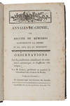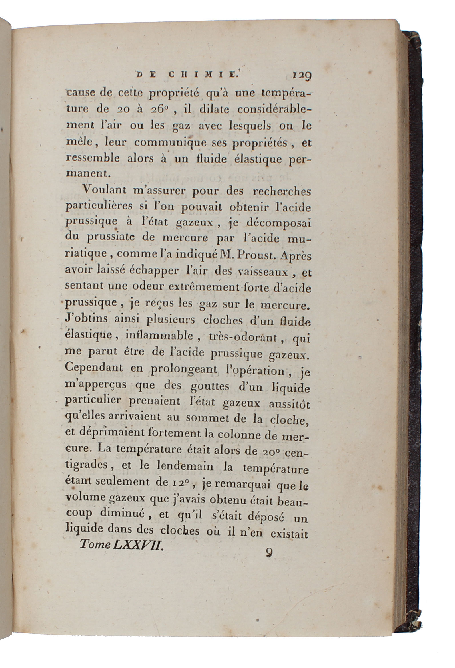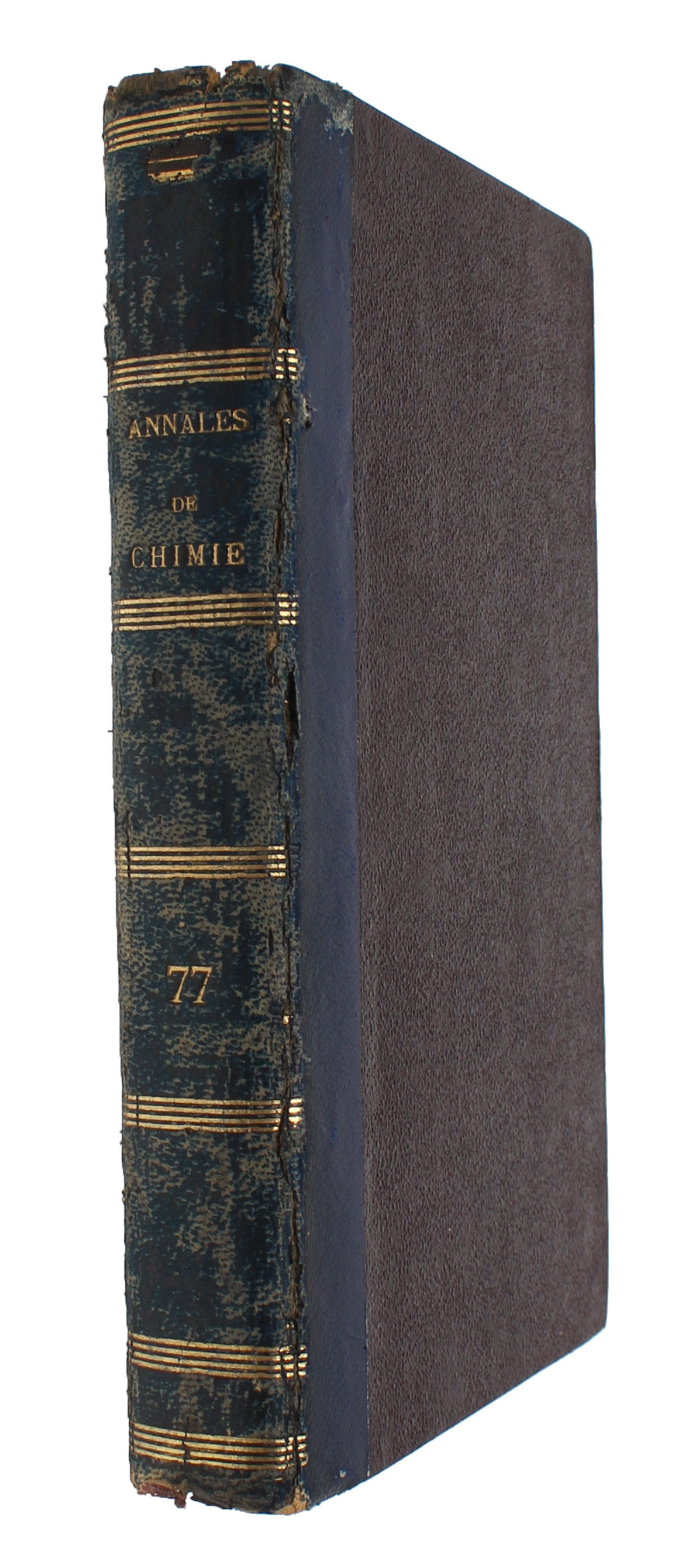 Paris, J. Klostermann fils, 1811. Contemp. hcalf. Spine gilt and with gilt lettering. Wear to top of spine. Slightly rubbed. Stamp to verso of titlepage. In: "Annales de Chimie, ou Recueil de Mémoires concernant la Chemie" Tome 77. 344 pp. and 5 engraved folded plates. Some scattered brownspots. (Entire volume offered). Duportel's paper: pp. 178-224 a. pp. 225-258. and 5 large plates describing different destillation apparatus.