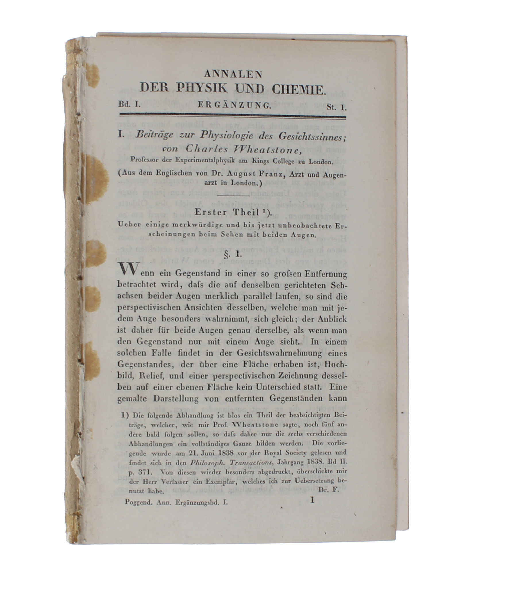 First appearance in German of this classic paper in physiological optics in which Wheatstone discovered the stereoscopic vison of the human eye.Stereopsis was first described by Wheatstone in 1838 (published first in the Transactions). In 1840 he was awarded the Royal Medal of the Royal Society for his explanation of binocular vision, a research which led him to make stereoscopic drawings and construct the stereoscope. He showed that our impression of solidity is gained by the combination in the mind of two separate pictures of an object taken by both of our eyes from different points of view. Thus, in the stereoscope, an arrangement of lenses or mirrors, two photographs of the same object taken from different points are so combined as to make the object stand out with a solid aspect. Sir David Brewster improved the stereoscope by dispensing with the mirrors, and bringing it into its existing form with lenses."As the inventor of the stereoscope, later developed by Brewster, Wheatstone found himself - to his own surprise - the first since Leonardo da Vinvi to discuss depth perception in terms of the different image received by the eye..."(DSB XIV, p. 290).Garrison & Morton No. 1498. Also with K.E. von baer "ueber das Klima von Sitcha und den russischen besitzungen an der Nordwestküste von Amerika", pp. 129-154.