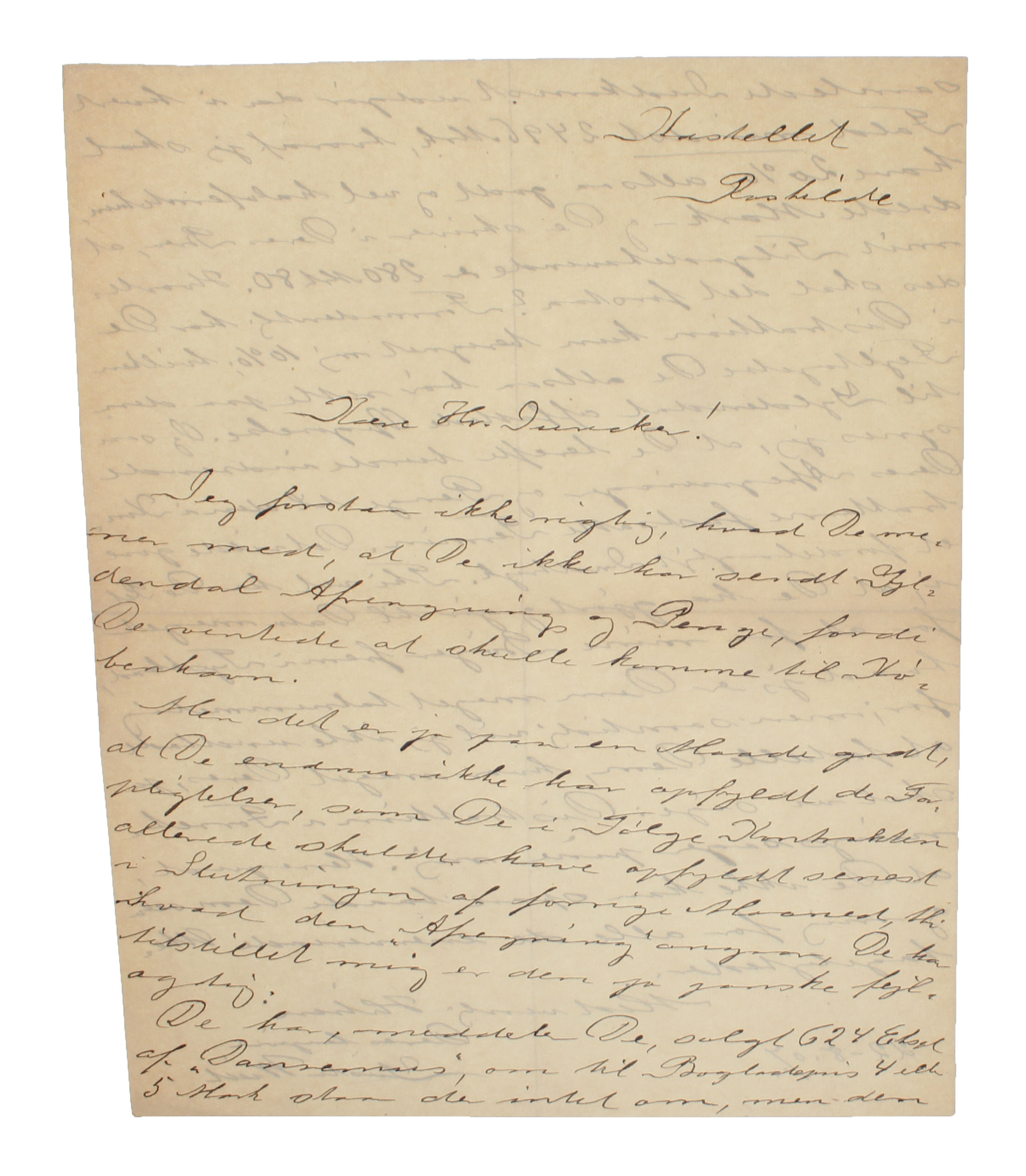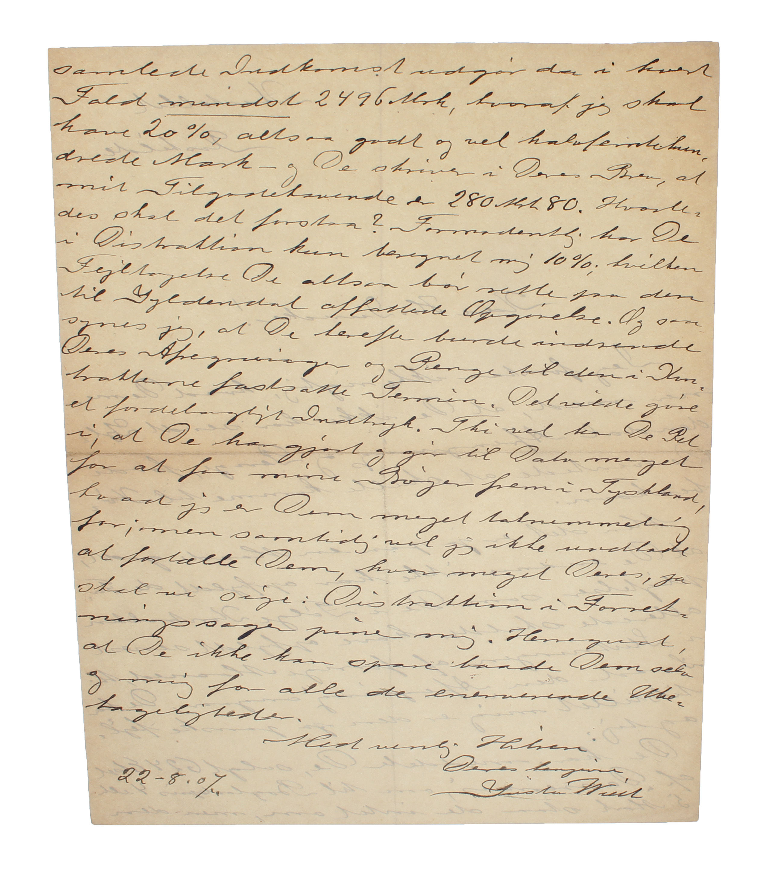 Kastellet, Roskilde, 1907. Lille 4to. 2 sider. Juncker har ikke afregnet salg af Wieds bøger hurtigt nok, både overfor Gyldendal og overfor ham selv. Wied laver regnestykker over gælden og slutter brevet med "...men samtidig vil jeg ikke undlade at fortælle Dem, hvor meget Deres, ja skal vi sige: Distraktion i Forretningssager pine mig. Herregud, at De ikke kan spare baade Dem selv og mig for alle de enerverende Ubehageligheder."