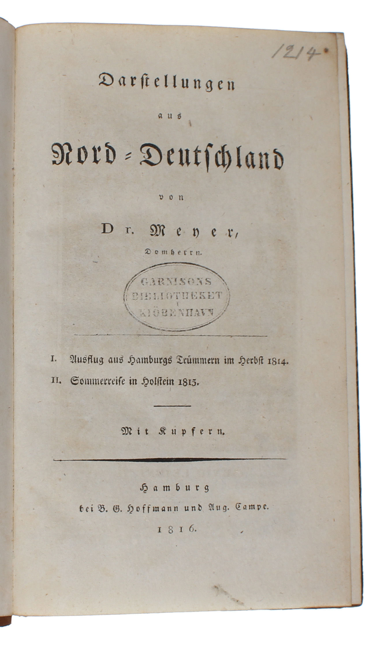 Hamburg, Hoffmann & Campe, 1816. Contemp. hcalf. Gilt spine.Gilt lettering. A tear in fronthinge at lower compartment, taped. Stamp on title-page. Engraved frontispiece. VIII,398,(2) pp., 4 engraved plates (1 folding). A few scattered brownspots.