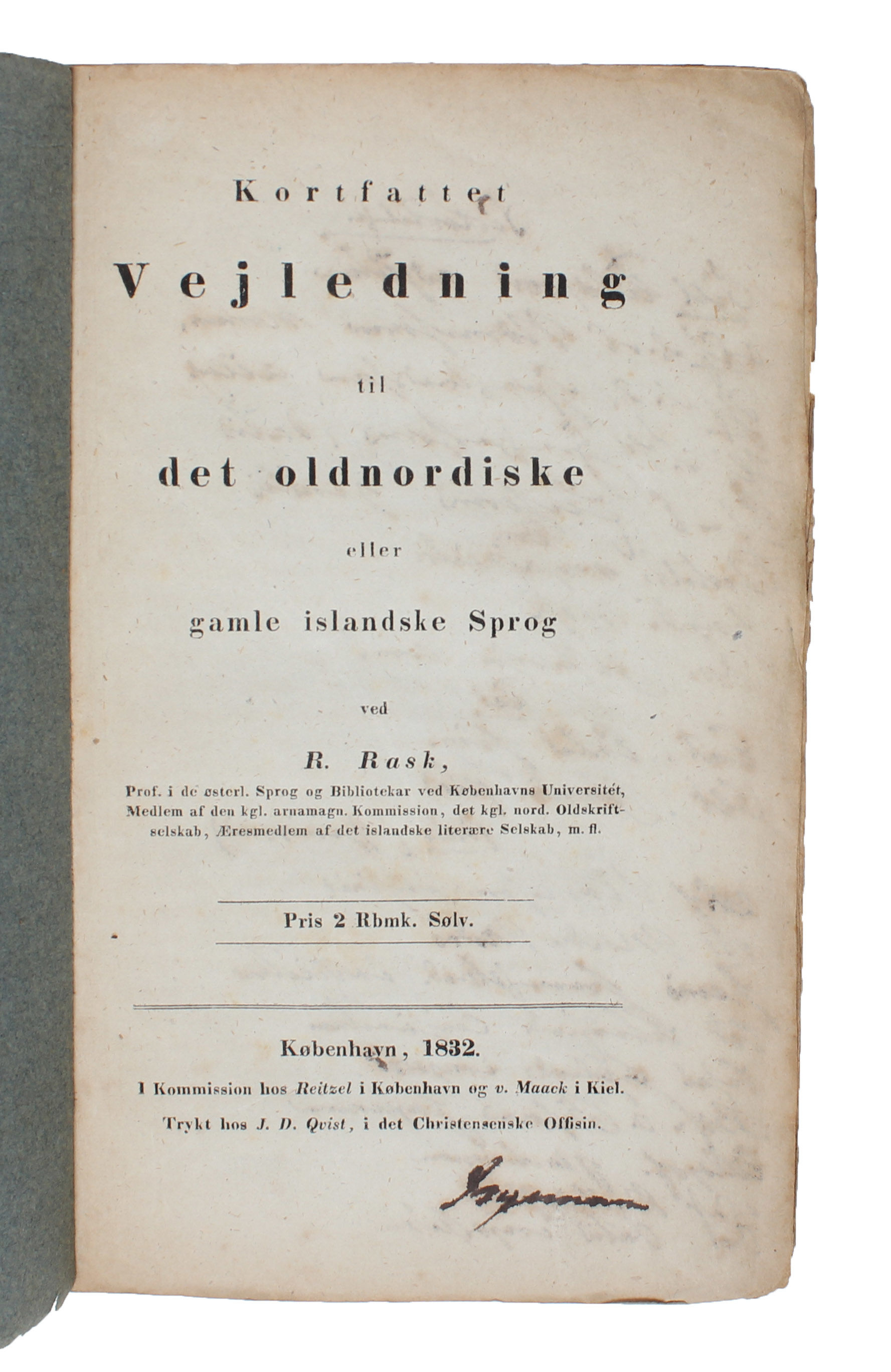 First edition of Rask's short introduction to Old Norse. Hjelmslev I, 197.