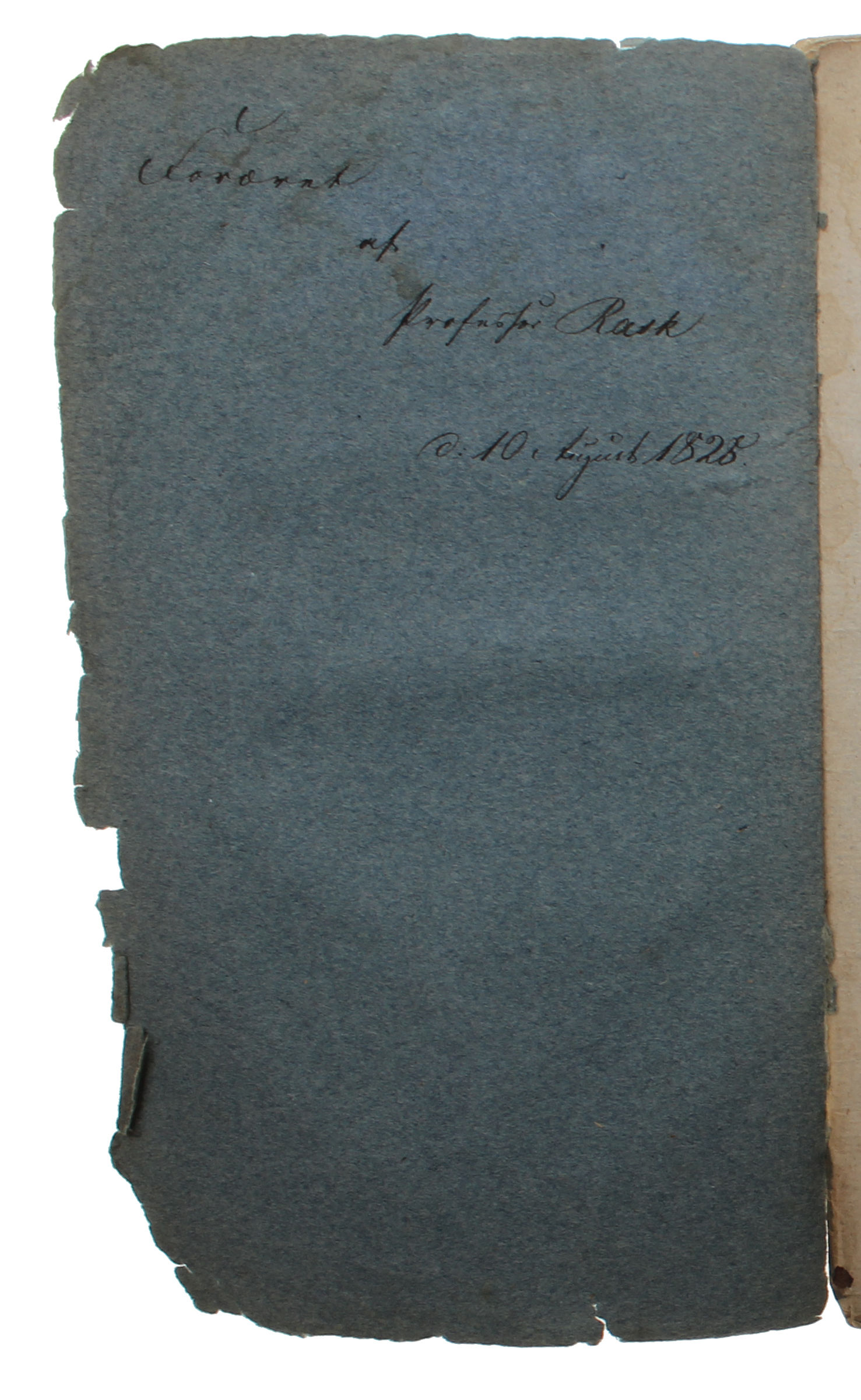København, Schultz, 1827. 8vo. Uncut in the original blank blue wrapper (back one missing). Upper half of spine missing. Ownership signature to title page. Waterstains to the first few leaves. Contemporary underlinings in text. Handwritten note to inside of front wrapper: "Foræret / af / Professor Rask / d. 10e August 1828" (Given by Professor Rask 10 August 1828).