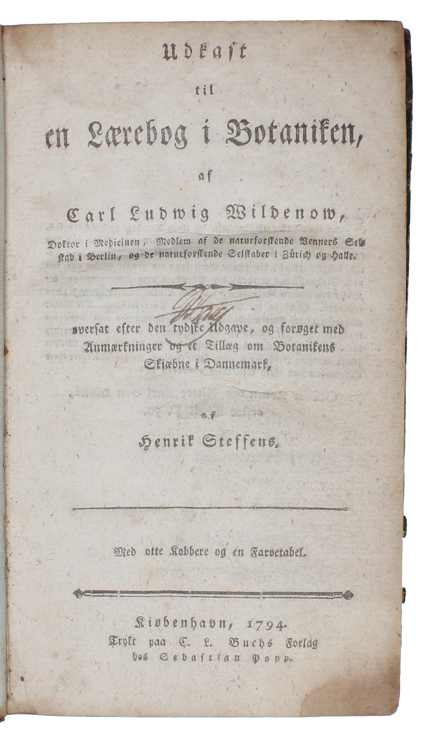 Første danske oversættelse af Carl Ludwig Wildenows hovedværk om botanikken. Forøget med anmærkninger om botanikken i Danmark af Henrik Steffens.