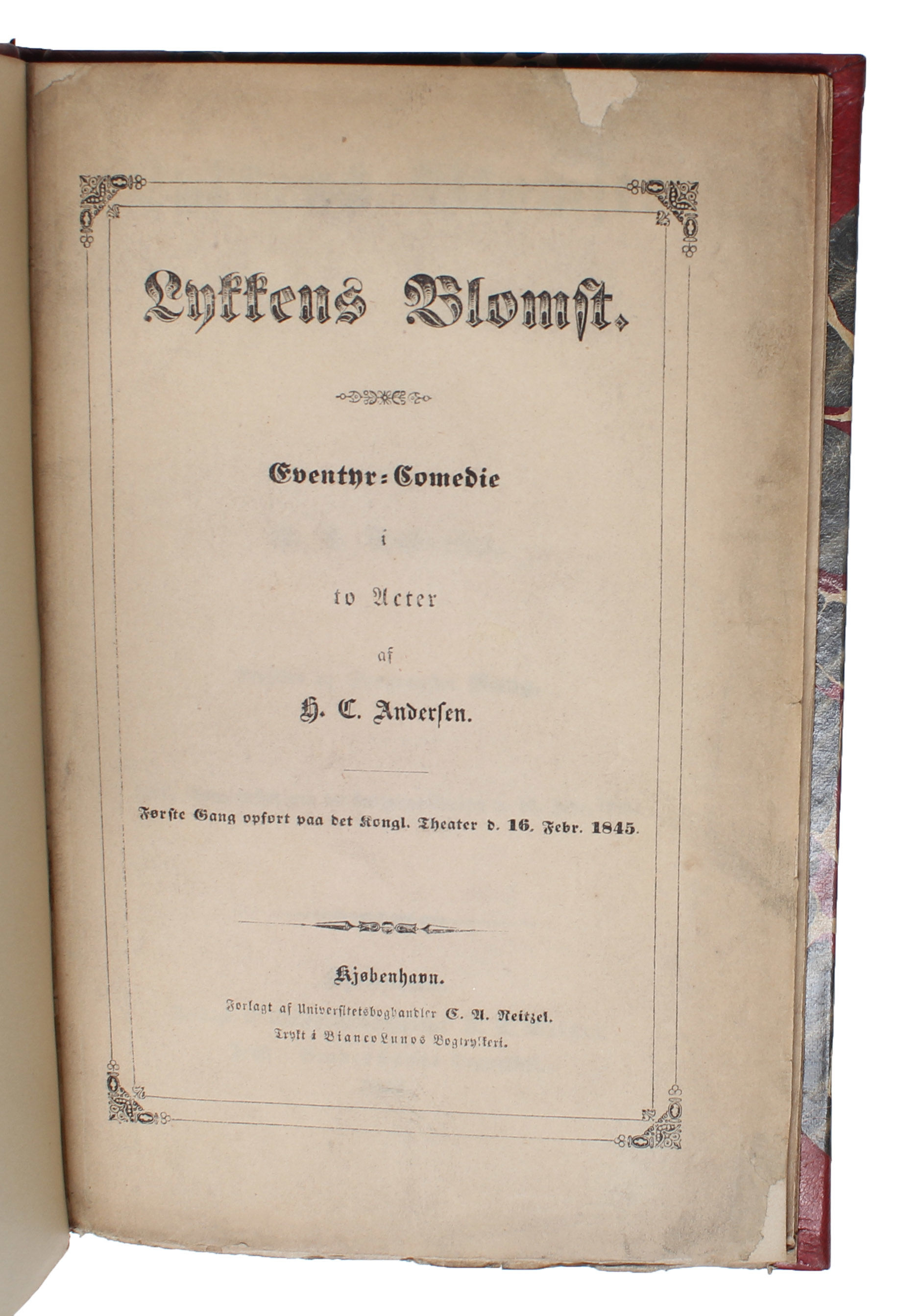 London, Richard Bentley, 1847. 8vo. Uncut in the original somewhat worn printed paper binding. Boards rubbed. Rebacked in white cloth, with the remnant of the original spine pasted on. Title page printed in red. Year of publication removed from title page. Internally clean. Housed in a recent clamshell box. IV,(2),100 pp. The rare first printing of Andersen's 'Christmas Greeting'. Upon his visit to England in 1847, Andersen issued the present publication to express his gratitude towards his English friends. In the short preface, addressed to Charles Dickens, Andersen states that he produced seven short stories during his visit (five of which were printed here for the first time): "Whilst occupied with a greater work, there sprung forth - as the flowers spring forth in the forest - seven short stories." Of the seven short stories contained in the volume, the following appear here for the first time: "The Old House" ("Det gamle Huus"), "The Drop of Water" ("Vanddraaben"), "The Happy Family" ("Den lykkelige Familie"), "The Story of a Mother" ("Historien om en Moder"), "The False Collar" ("Flipperne"). The present copy belonged to the Danish writer Elias Bredsdorff (1912-2002), Reader in Scandinavian Studies at the University of Cambridge. Bredsdorff passed on the copy to the renowned Andersen collector Erik Dal.