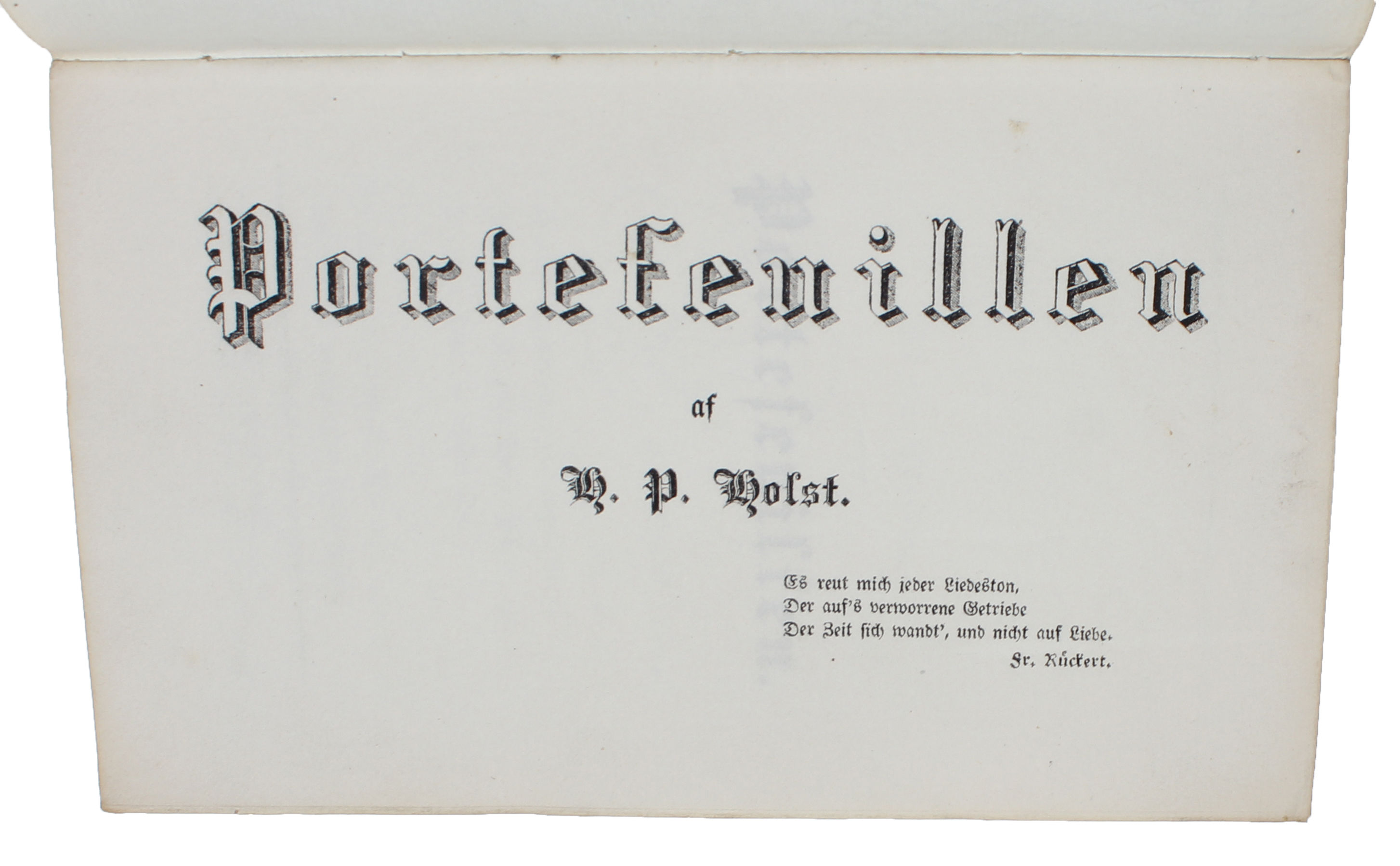 Originaludgaven af Holst og kuriøst trykte "Portefeuillen", med sit "omvendte" titelblad, her i et udstyr, vi aldrig har set mage til og med egenhændig dedikation fra Holst til den danske skolemand Chr. Agerskou.Dedikationen på forsatsbladet lyder: "Herr Chr. Agerskou / med / Venskab og Hengivenhed / fra / Forfatteren."