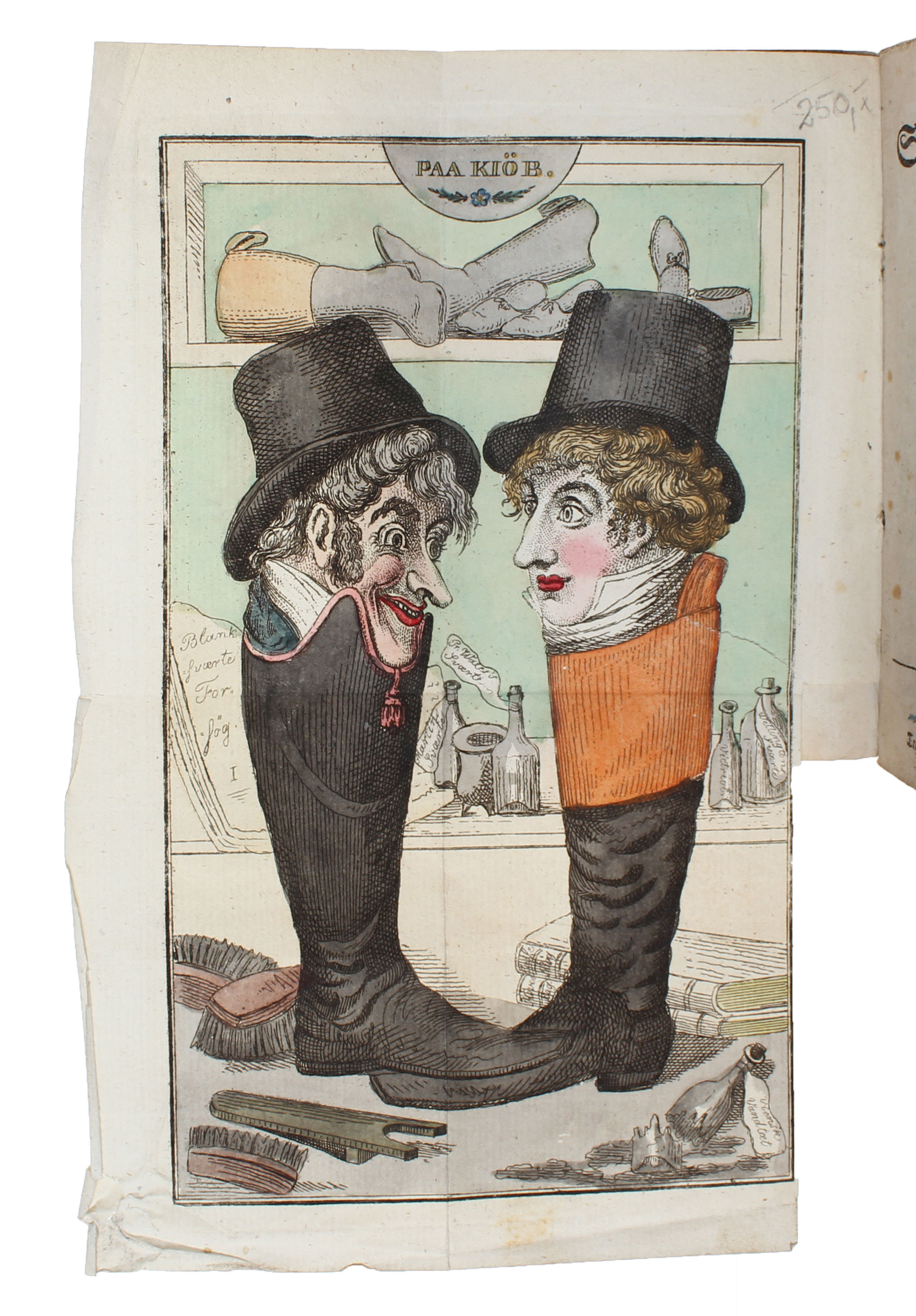 Et særdeles nydeligt eksemplar af første hæfte af Skjemt og Satire med den kendte karikerede afbildning af Baggesen, der træder Oehlenschläger over tæerne.Baggesen - Oehlenschläger - fejden optog i tiden størstedelen af Danmarks litterater. Den litterære verden inddeltes i dem, der var for Baggesen, og dem, der var for Oehlenschläger. Bibl. Dan. IV, 528.
