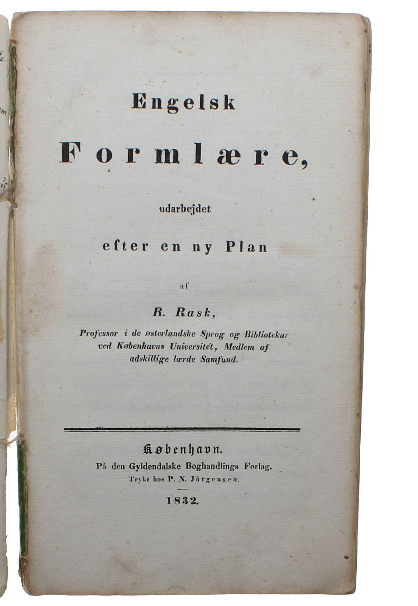 A beautiful gift copy of the first edition of Rask's 'English Morphology', inscribed by his half-brother Hans Kristian Rask to the Danish theologian and professor Jens Møller (1779-1833). Møller is best known for his biographical works. Hjelmslev I, 200.