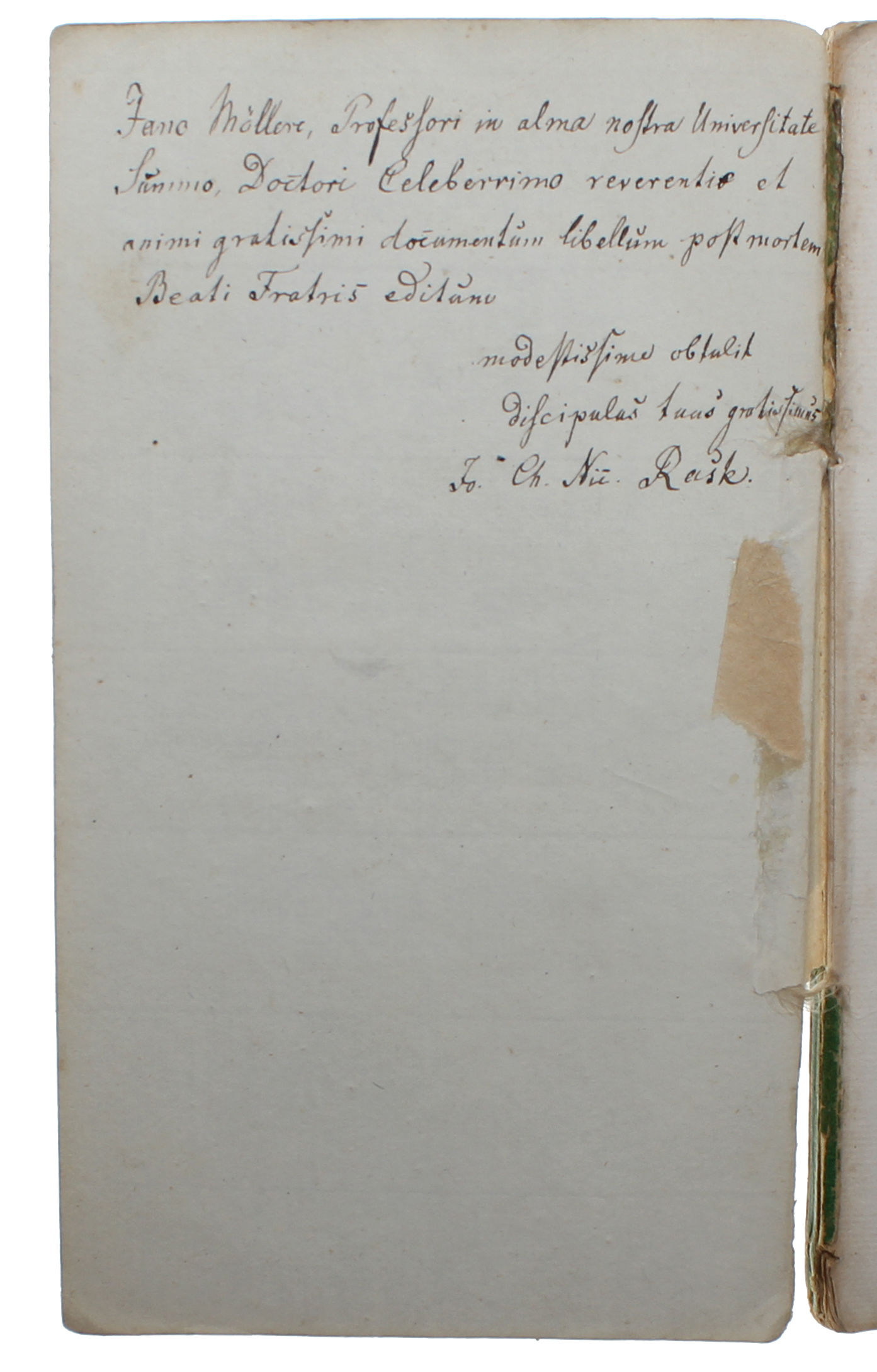 København, Gyldendal, 1832. 8vo. Bound in the original gift boards covered in green glazed paper. Wear and tears to spine. Front board slightly loose. Internally clean. Printed on good paper. With a long inscription in Latin to the inside of front board from Rasmus Rask's half-brother to the Danish theologian Jens Møller: "Jano Möller, Professori in alma nostra universitate / summo, Doctori Celeberrimo reverentiæ et / animi gratissimi documentum libellum postmortem / Beati Fratris editum / modestissime obtulit / discipulus tuus gratissimus / Jo. Ch. Nic. Rask." (4),112 pp.