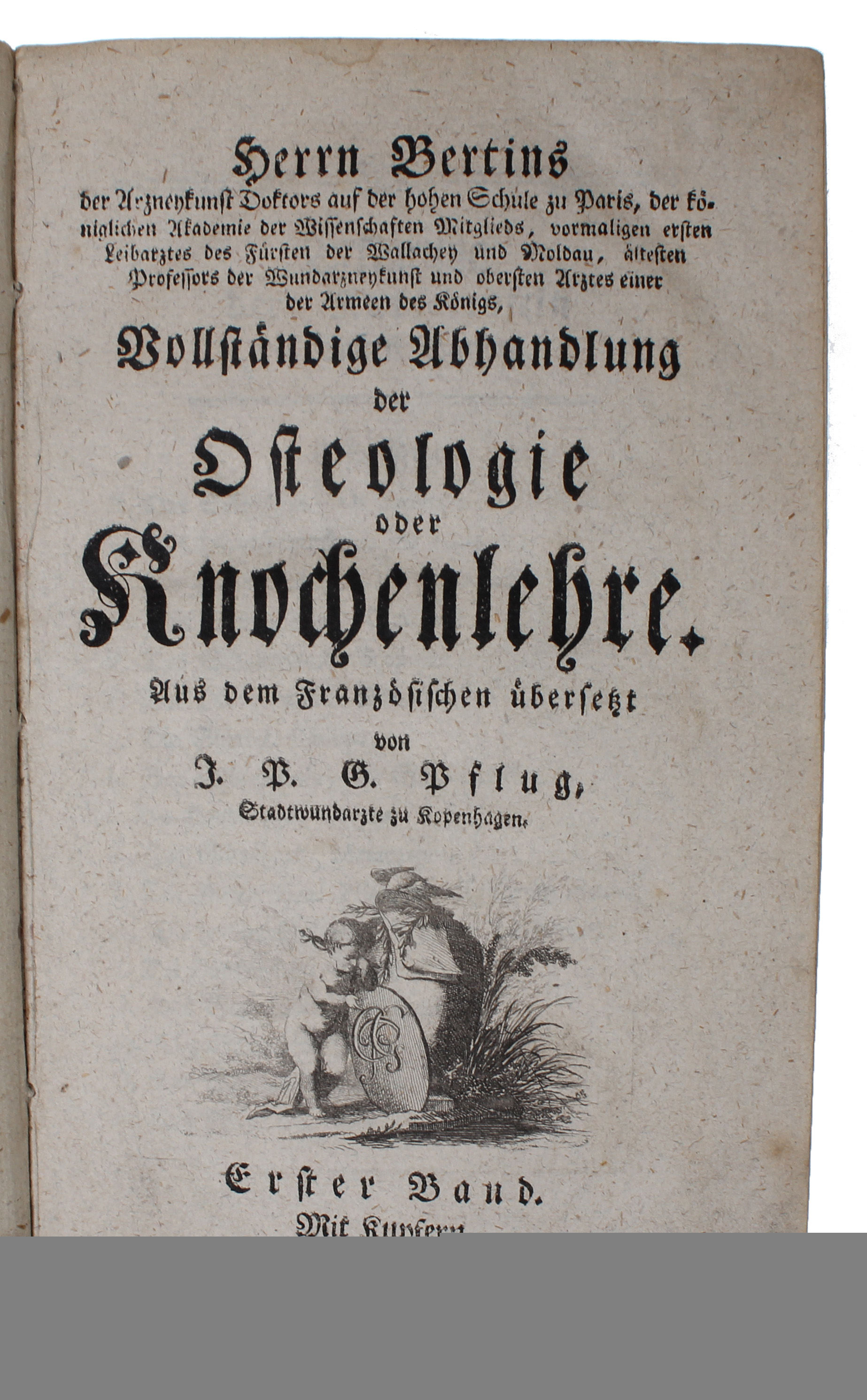 German translation of Bertin's Traité D'ostéologie (1754). Exupere Joseph Bertin (1712 - 1781) was a French anatomist born in Tremblay (Ille-et-Vilaine), Brittany. He was the father of cardiologist René-Joseph-Hyacinthe Bertin (1757-1828). He served as regent of the Académie Nationale de Médecine in Paris and was "first physician" to the royal army. He is remembered for his research on the renal system. His best known written work is in the field of osteology, Traité D'ostéologie (1754, 4 volumes).The columns of Bertin are named after him, as are "Bertin's ossicles" (sphenoidal conchae) and "Bertin's ligament" (iliofemoral ligament).