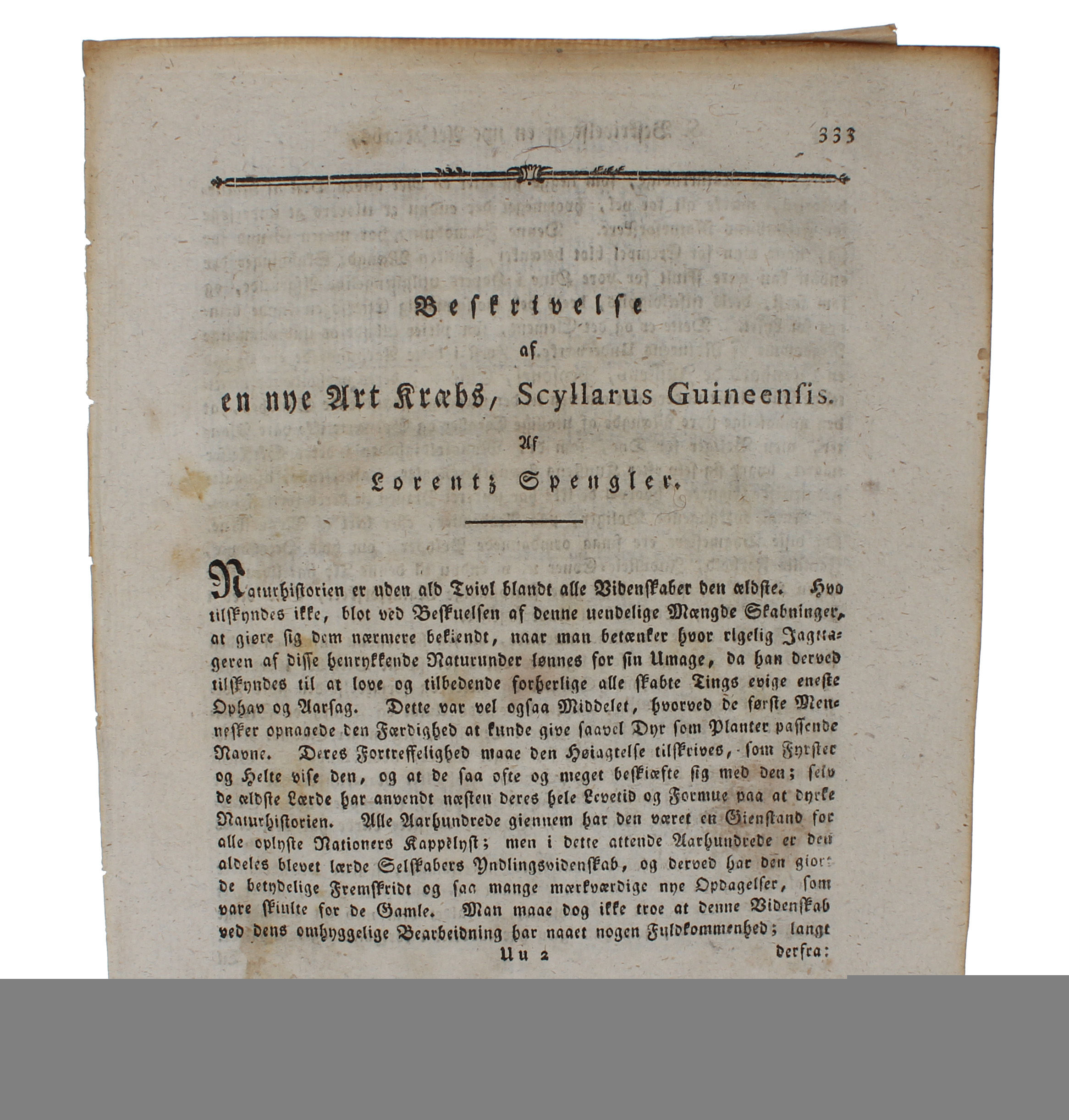 Beskrivelse af en nye Art Kræbs, Scyllarus Guineensis.(In "Nye Samling af det Kongelige Danske Videnskabers Selskabs Skrifter 5") - [FIRST DESCRIPTION OF THE SMALL SPANISH LOBSTER]
