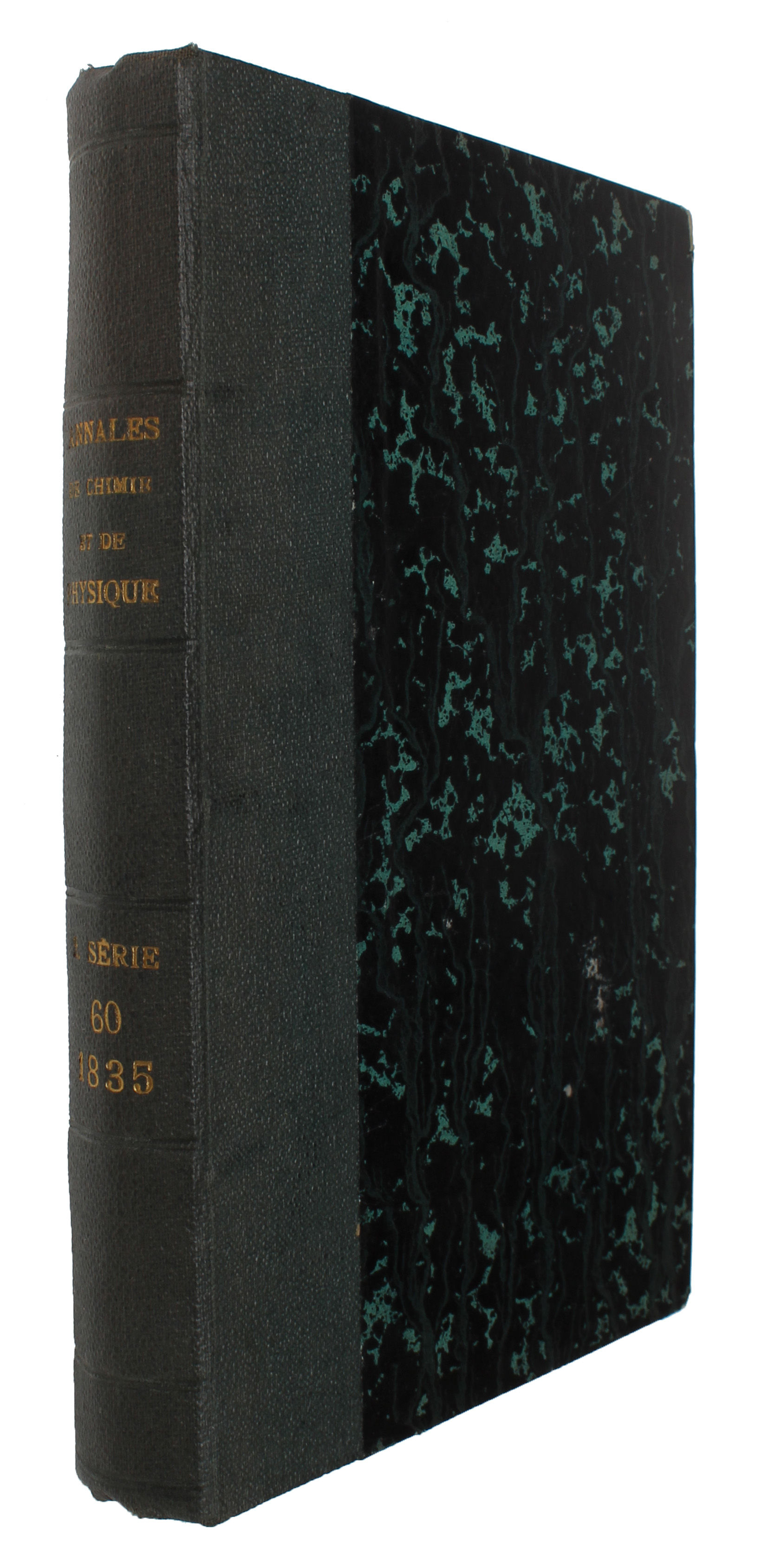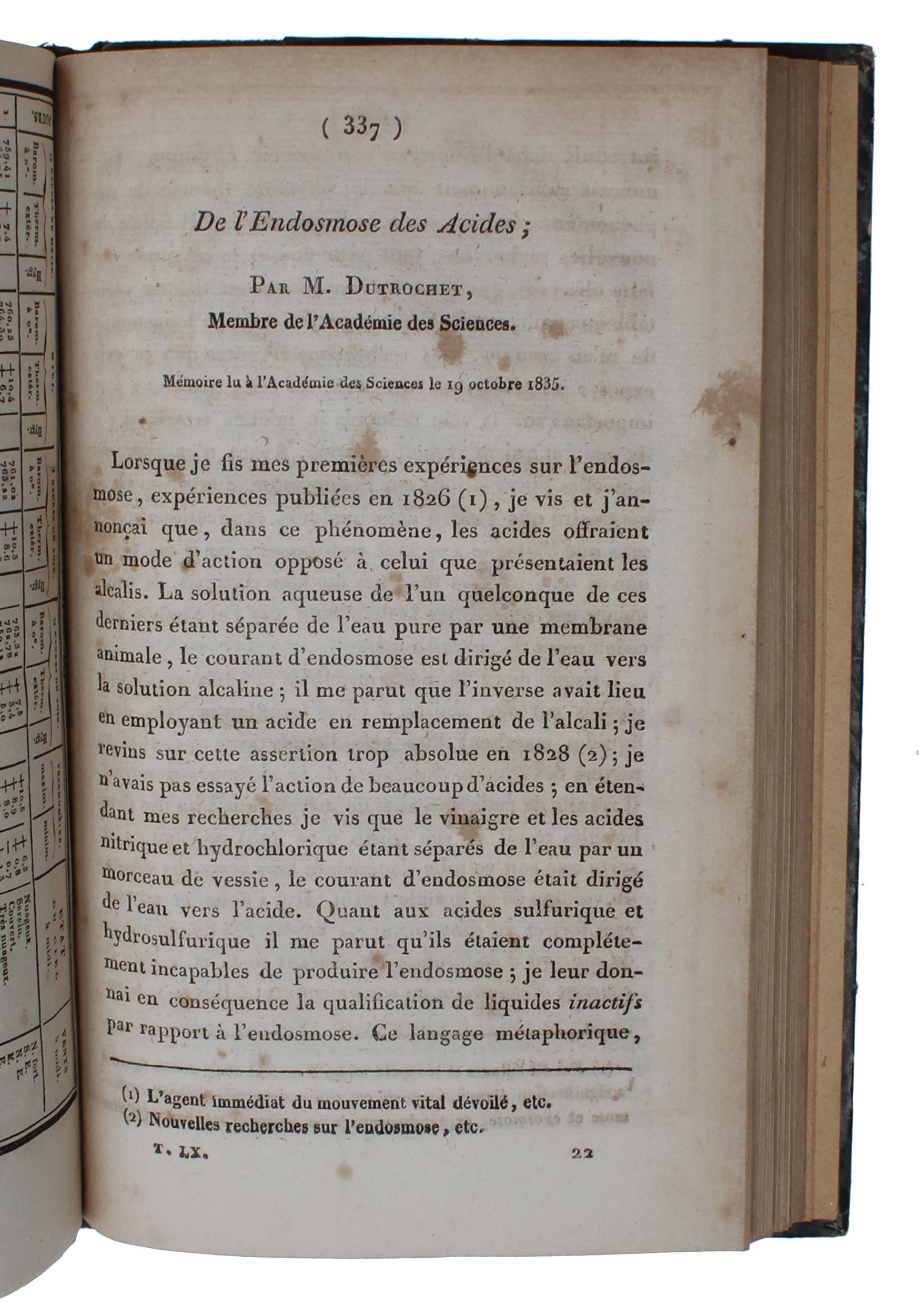 Paris, Crochard, 1835. 8vo. In contemporary half cloth with gilt lettering to spine. In: "Annales de Chimie et de Physique, Par MM. Gay-Lussac et Arago.", 2e Series, Tome 60. Entire volume offered. Some scattered brownspots, other fine with no institutional stamps. Dutrochet's paper: pp. 337-368. [Entire volume: 448 pp.].
