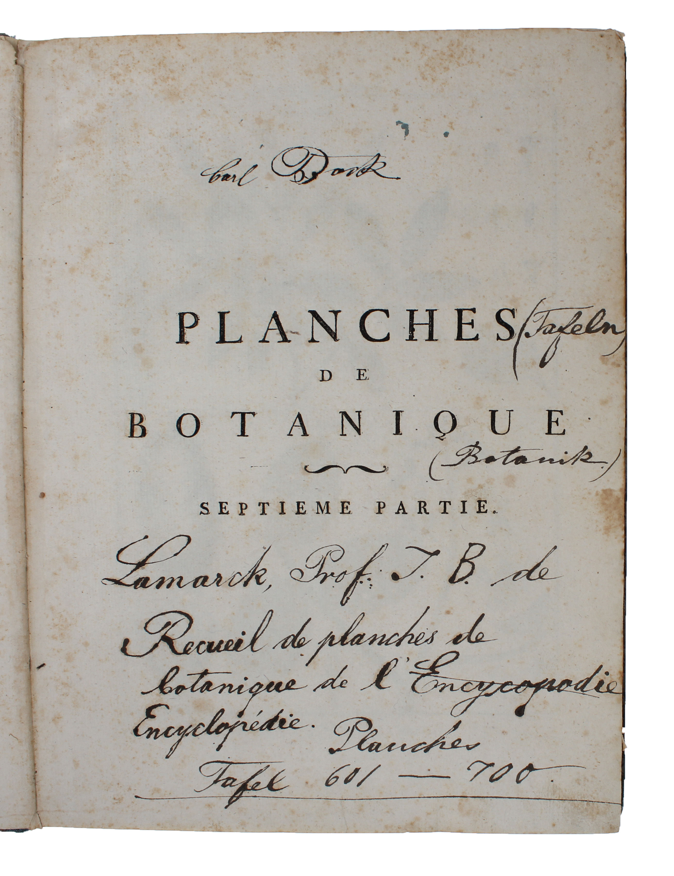 Between 1783 and 1792 Lamarck published three large botanical volumes (text and plates) for the "Encyclopédie méthodique par ordre des matières", a massive publishing enterprise begun by French publisher Charles-Joseph Panckoucke in the late 18th century.