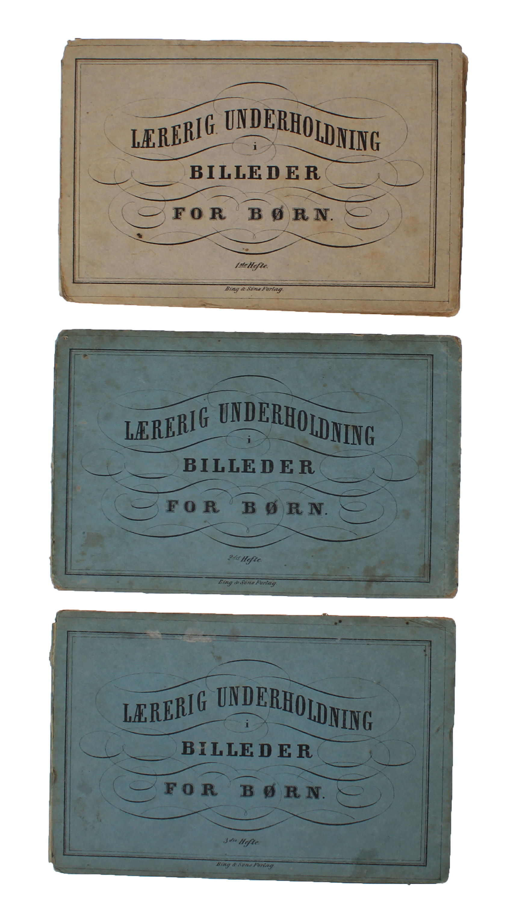 (København), Bing & Søns Forlag, u.år (ca. 1847). Tvær-8vo. (12,5 x 18,5 cm.). 3 originale kartonnager med titlen i litografi på forpermer. Rygge lidt løse. Indeholder 24 (hvert hefte med 8) litograferede plancher, som er sammenstillede i leporelloform visende folkeslag, folkedragter, erhverv m.v. Plancherne med lidt spredte brunpletter.