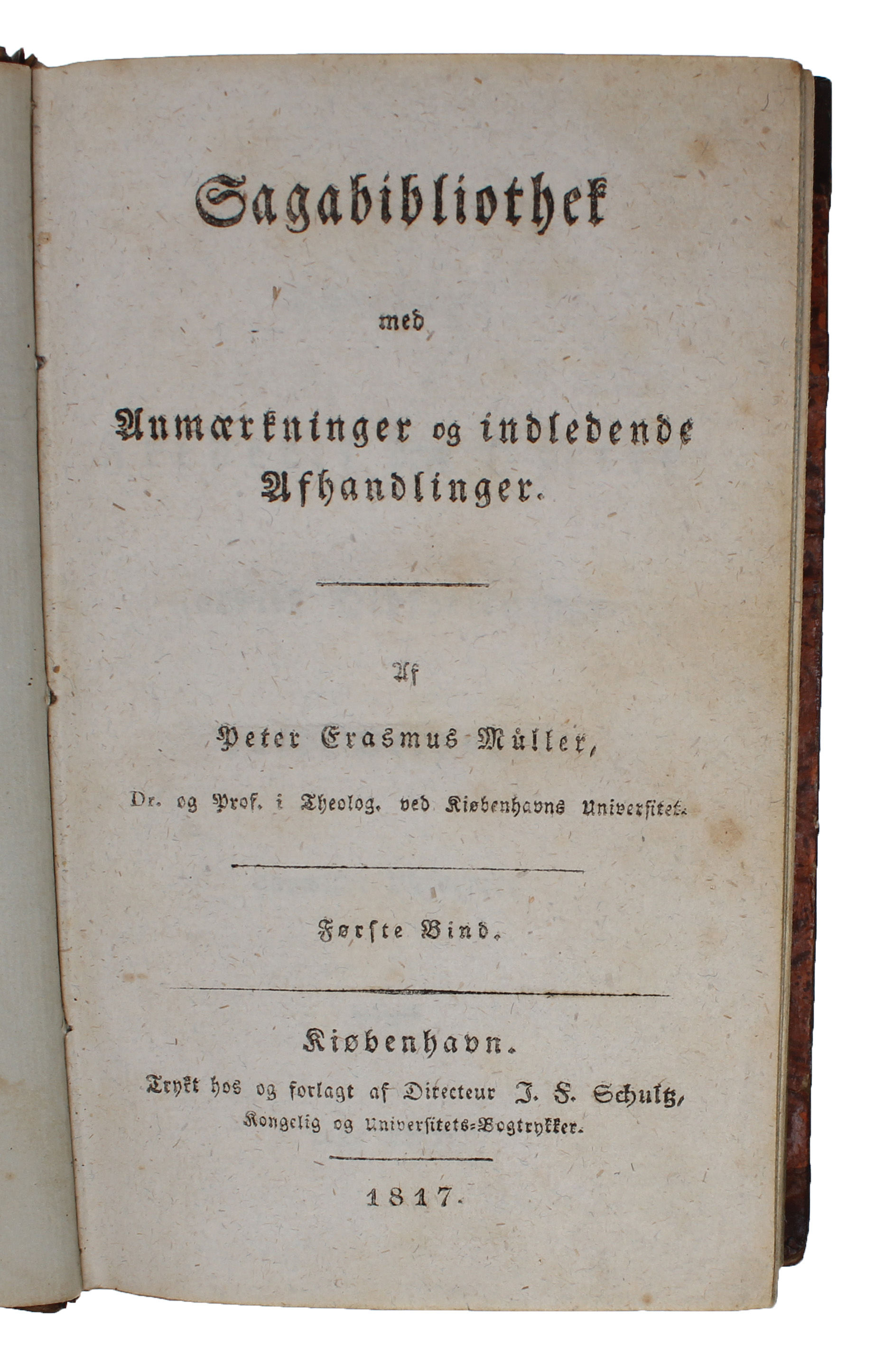 Særdeledes nydeligt eksemplar af Müllers Sagabibliothek. Indeholder første danske oversættelse af Færeyinga Saga (Thrønds og Sigmund Brestesens Saga). - Fiske I:p. 410.