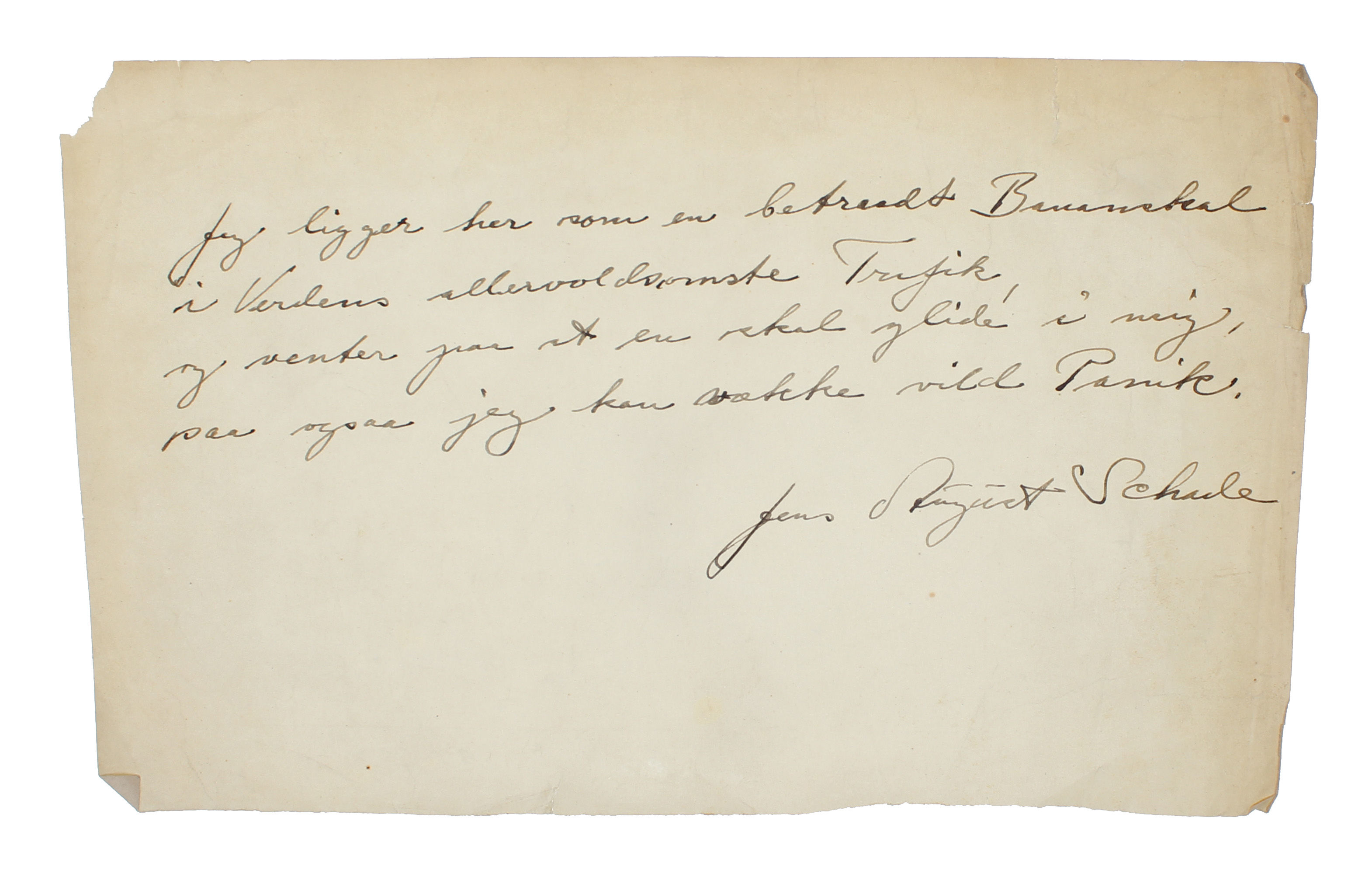 1 side 8vo med små ubetydelige rifter i kanterne. "Jeg ligger her som en betraadt Bananskræl / i Verdens allervoldsomste Trafik, / og venter paa at en skal glide i mig, / saa ogsaa jeg kan vække vild Panik. / Jens August Schade." Et nydeligt lille egenhændigt og signeret digt af Jens August Schade.