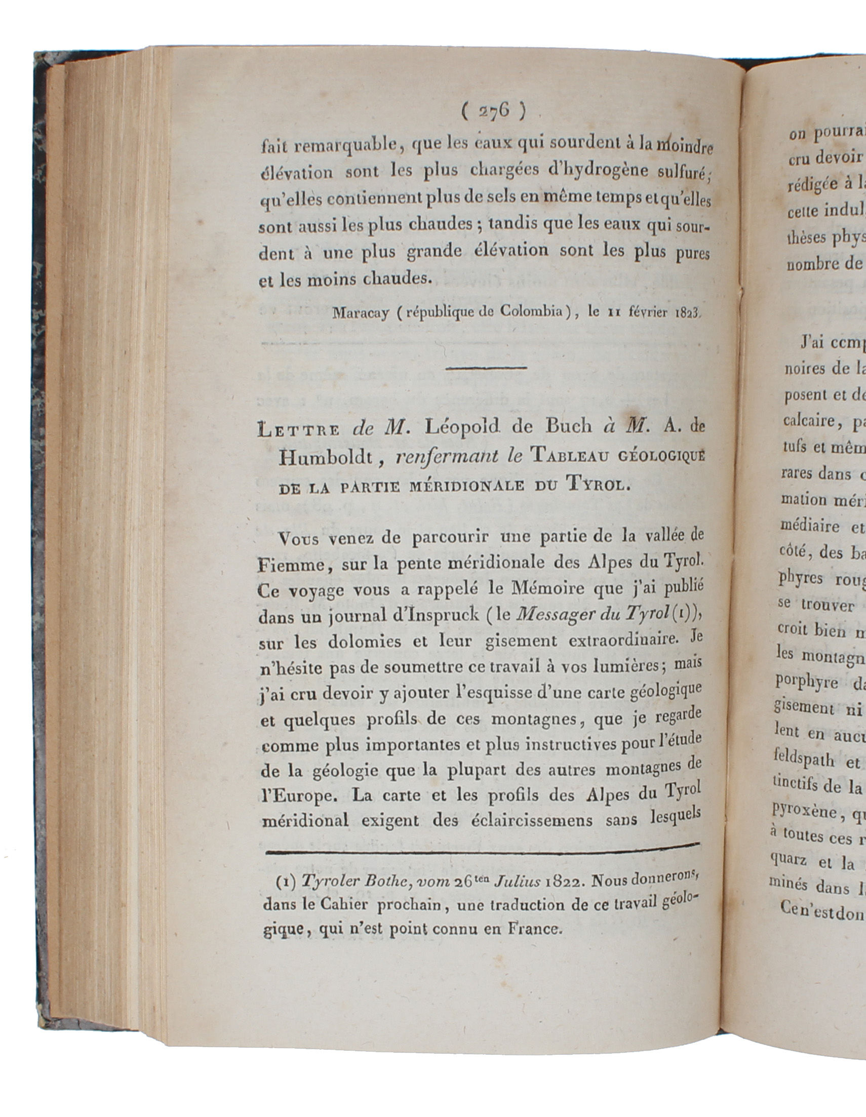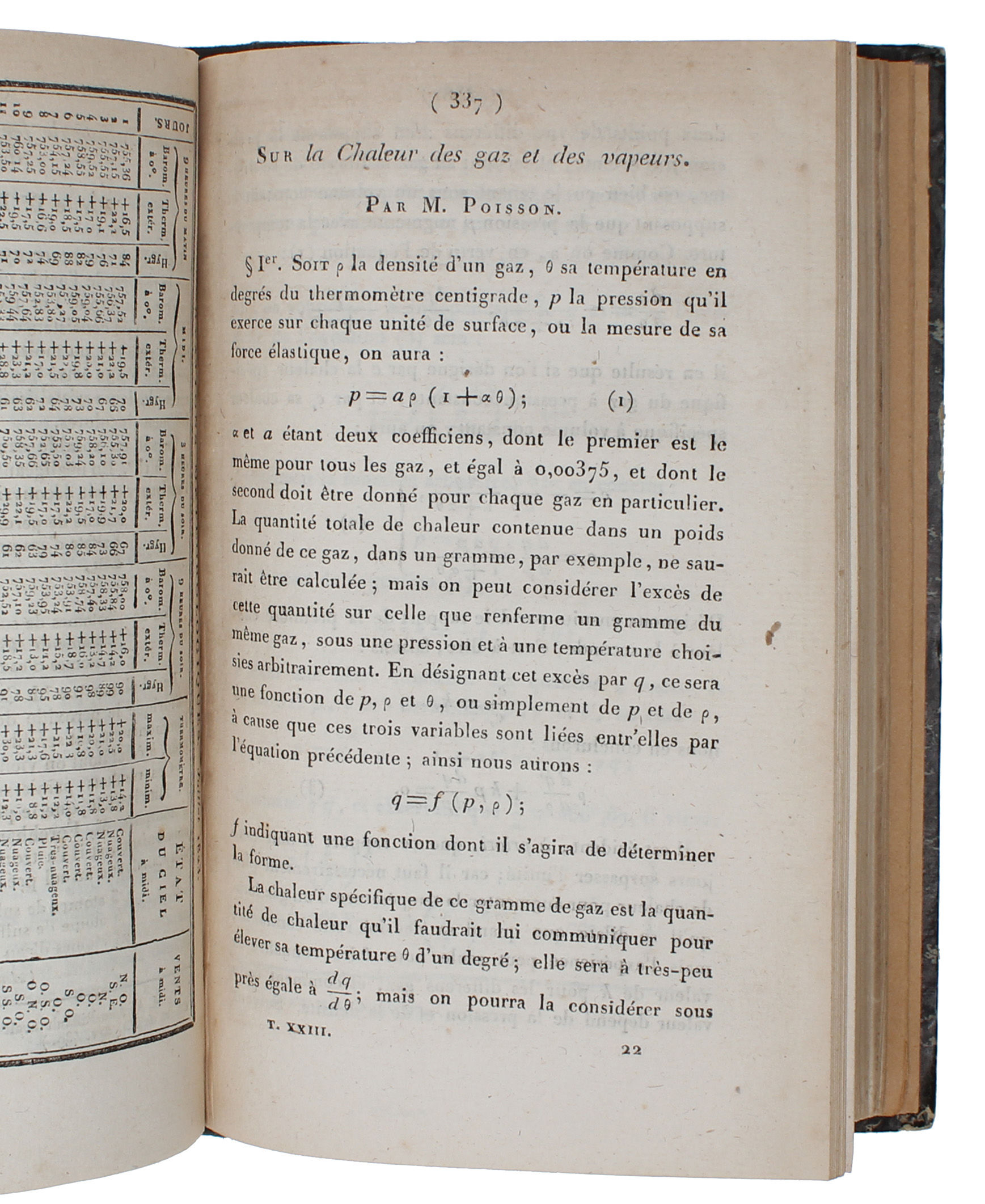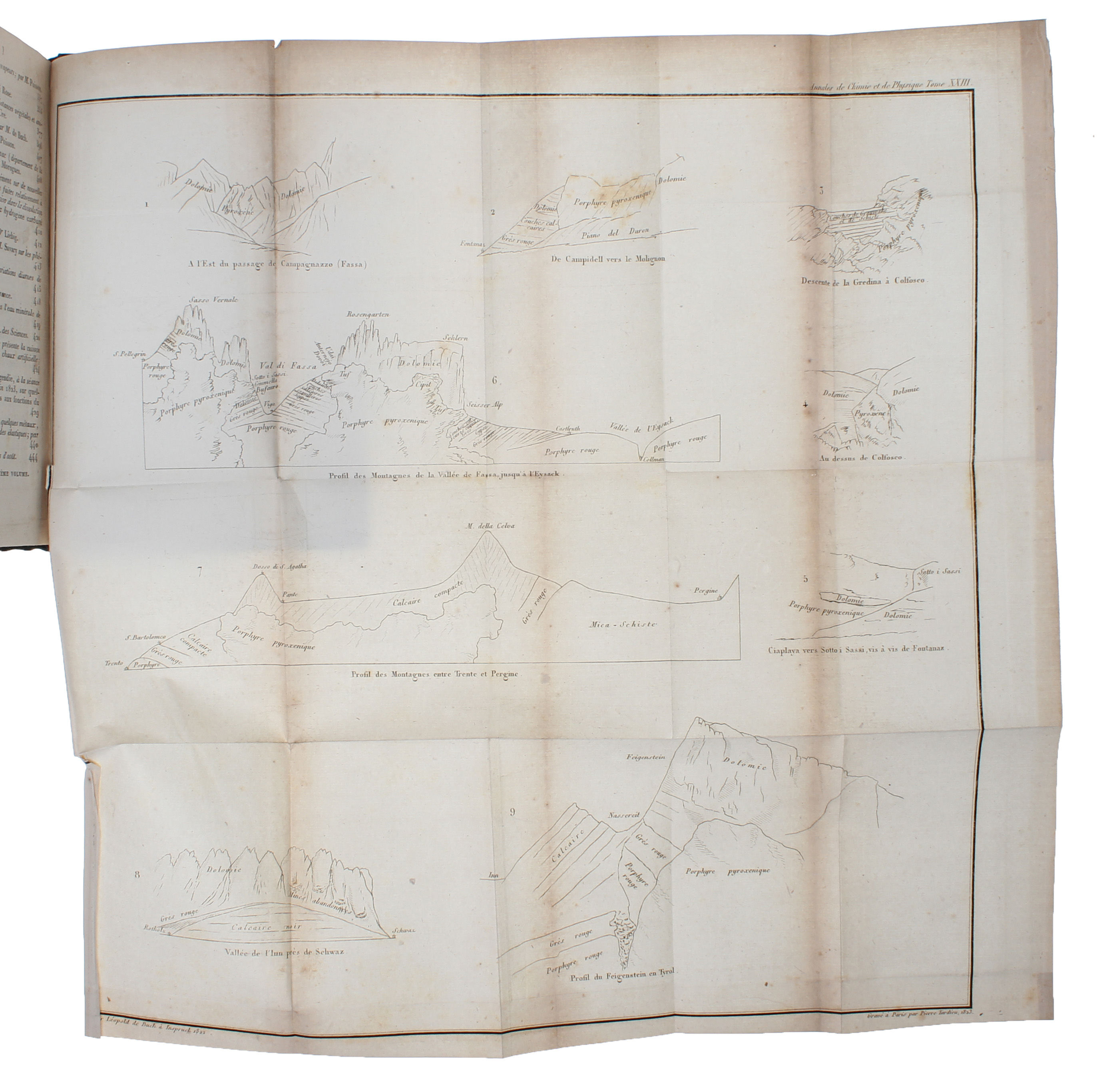 First printing of this important geological survey and description of the Alphs with the first geological mapping of the area."His (von Buch's) explorations in the southern Alps had suggested to Buch that the towering heigh of the Dolomites might be the result of upheaval, for which he thought the active agent in porphyry, including monozite. he concluded that the magnesia in which this rock is rich would also have been active in transforming the original limestone into dolomite. Buch thus came to vizualize great subterranean activities..."(DSB II, p. 555). _____________________ First appearance of Poisson's important paper on the mathematical treatment of "specific heats"."In "Sur la chaleur des gaz et des vapeurs," published in August 1823 in Annales de chimie et de physique, Poisson developed ideas published four months before by Laplace in Book XII of Mécanique céleste. Poisson introduced all the precautions needed to render the confused notion of quantity of heat susceptible to mathematical analysis. He called quantity of heat the magnitude that characterizes the transition of a given mass of gas from an arbitrary initial state of temperature and pressure to another state. This definition makes more abstract the quantitative aspect that naturally follows from the concept of heat as a caloric fluid. Poisson could thus deal comfortably with this magnitude, since for him it is simply a function q of p, p, and ø (pressure, density, and temperature). The equation of state p= ap(1+aø) was already classic, and the growing acceptance of the notions of specific heats, at constant pressure and constant volume, allowed him to write the simple partial differential equation of which should be the integral. He also showed that independently of any additional hypothesis, and whatever the arbitray function used in the integration, the adiabatic transformations (the term did not yet exist) correspond to the formulas p · py = constant and (?+266.67)·p1y= constant, y being the ratio of the specific heats, assumed constant."(DSB).