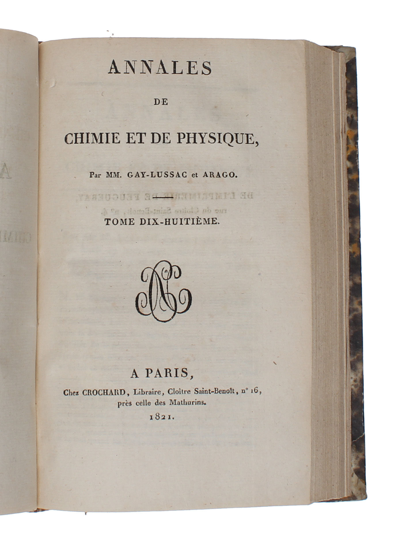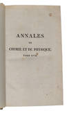 Paris, Crochard, 1821. 8vo. In contemporary half calf with gilt lettering to spine. Traces of paper label to lower part of spine. Light wear to extremities and small stamp to title page. In: "Annales de Chimie et de Physique, Par MM. Gay-Lussac et Arago.", tome 17 & 18 (Septembre Cahier). Entire volume offered. A fine copy. [Faraday's paper:] pp. 337-370 and 2 folded engraved plates (showing the experimental apparatus). [Ampère & Savary's Notes:] pp. 370-379. [Entire volume: 448 pp. + 1 plate; 448 pp. + 5 plates.