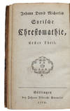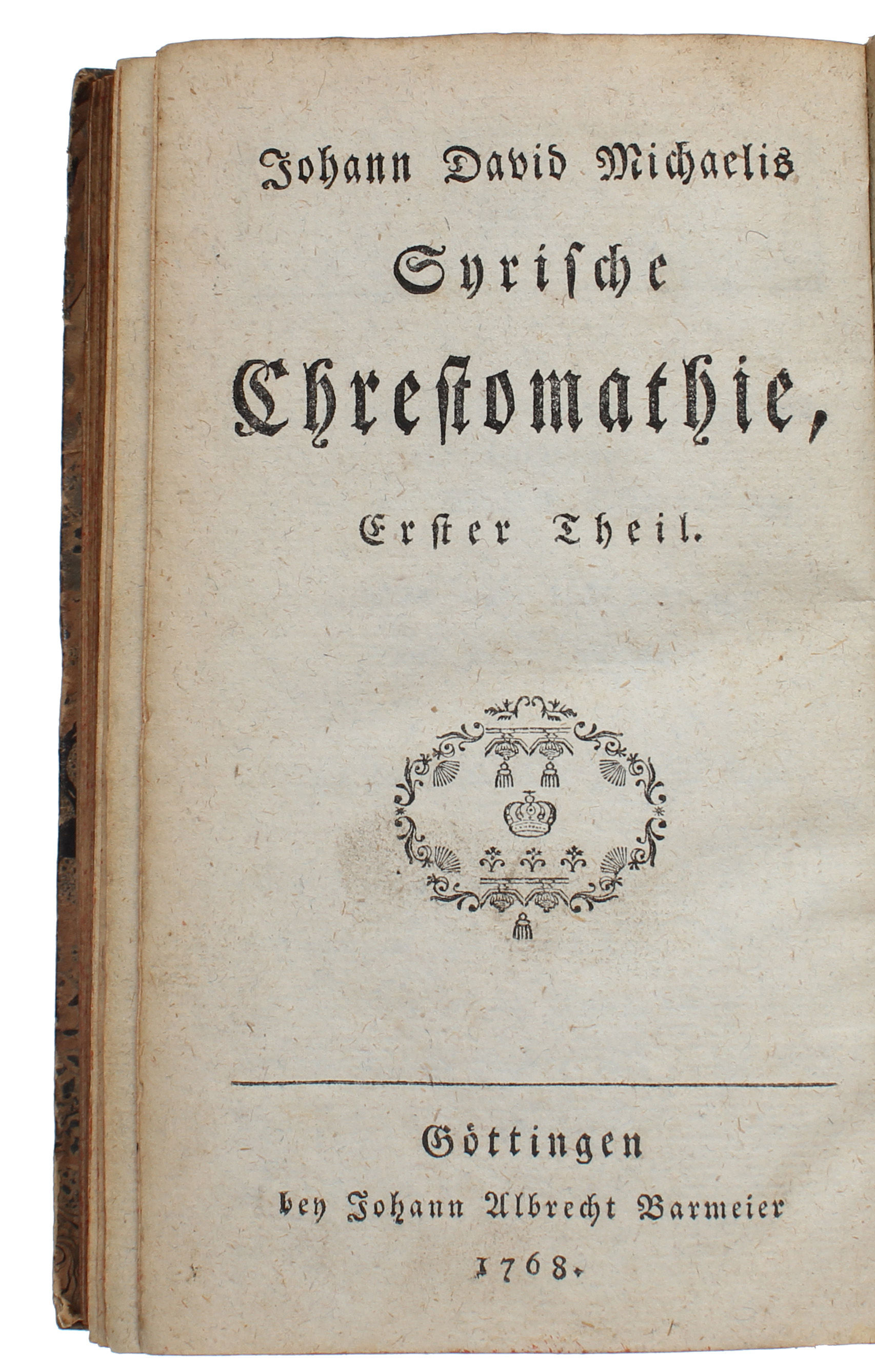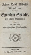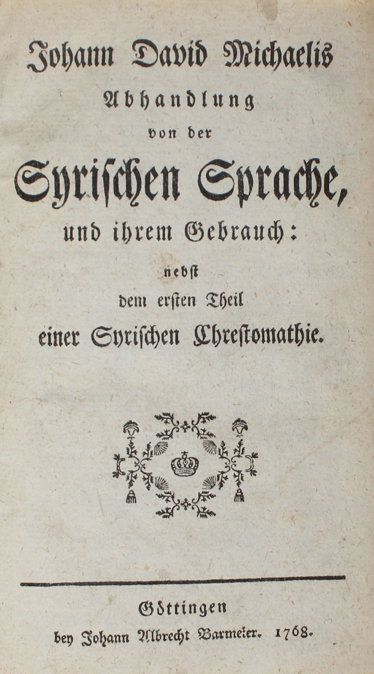 First edition of Michaelis work on the Syriac language. Johann Davis Michaelis (1717-19) was a theologian and orientalist, whose fame today rests upon the present work and upon the fact that he was responsible for the first scientific expedition to Arabia Felix, namely that of Niebuhr. As a theologian and an orientalist, many of Michaelis' questions have root in the Bible. But unlike many other theolgians of the time, Michaelis sought to shed light over biblical themes through sources outside of the Bible - especially from the Middle East, not least Arabia.