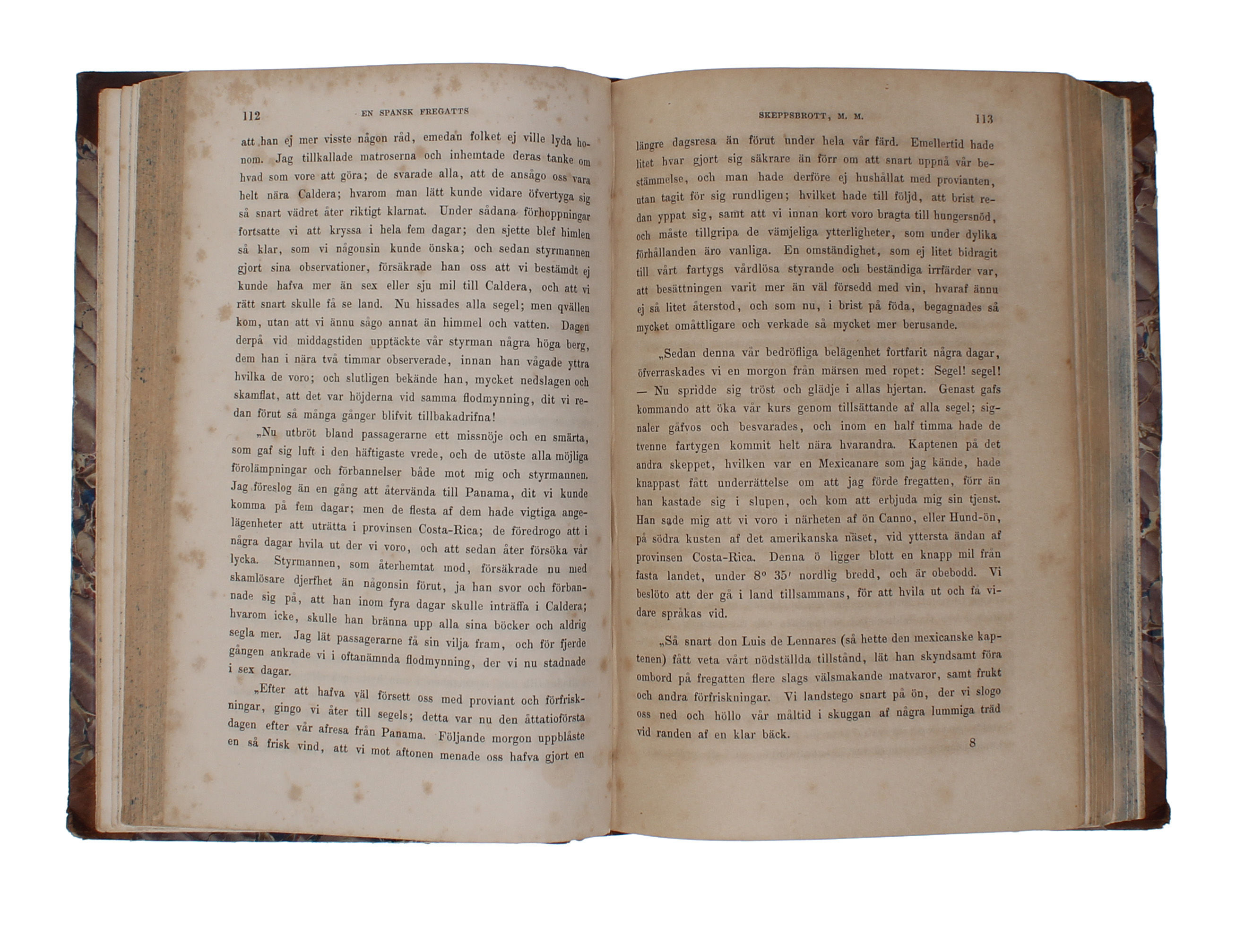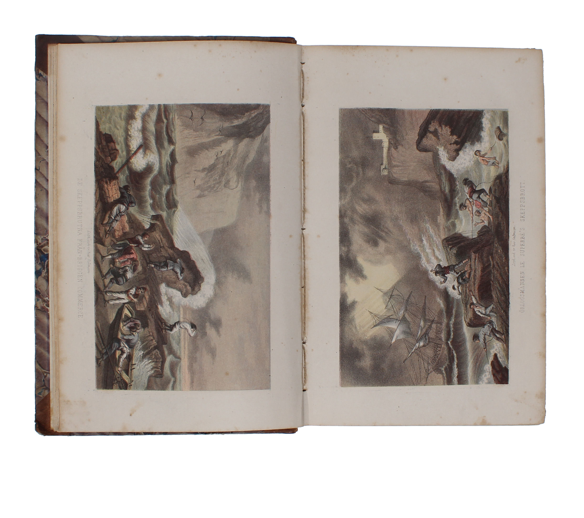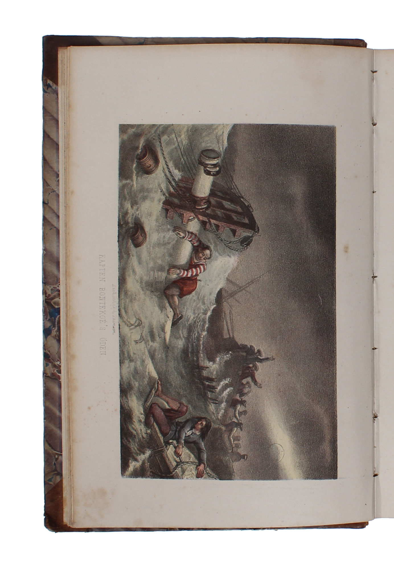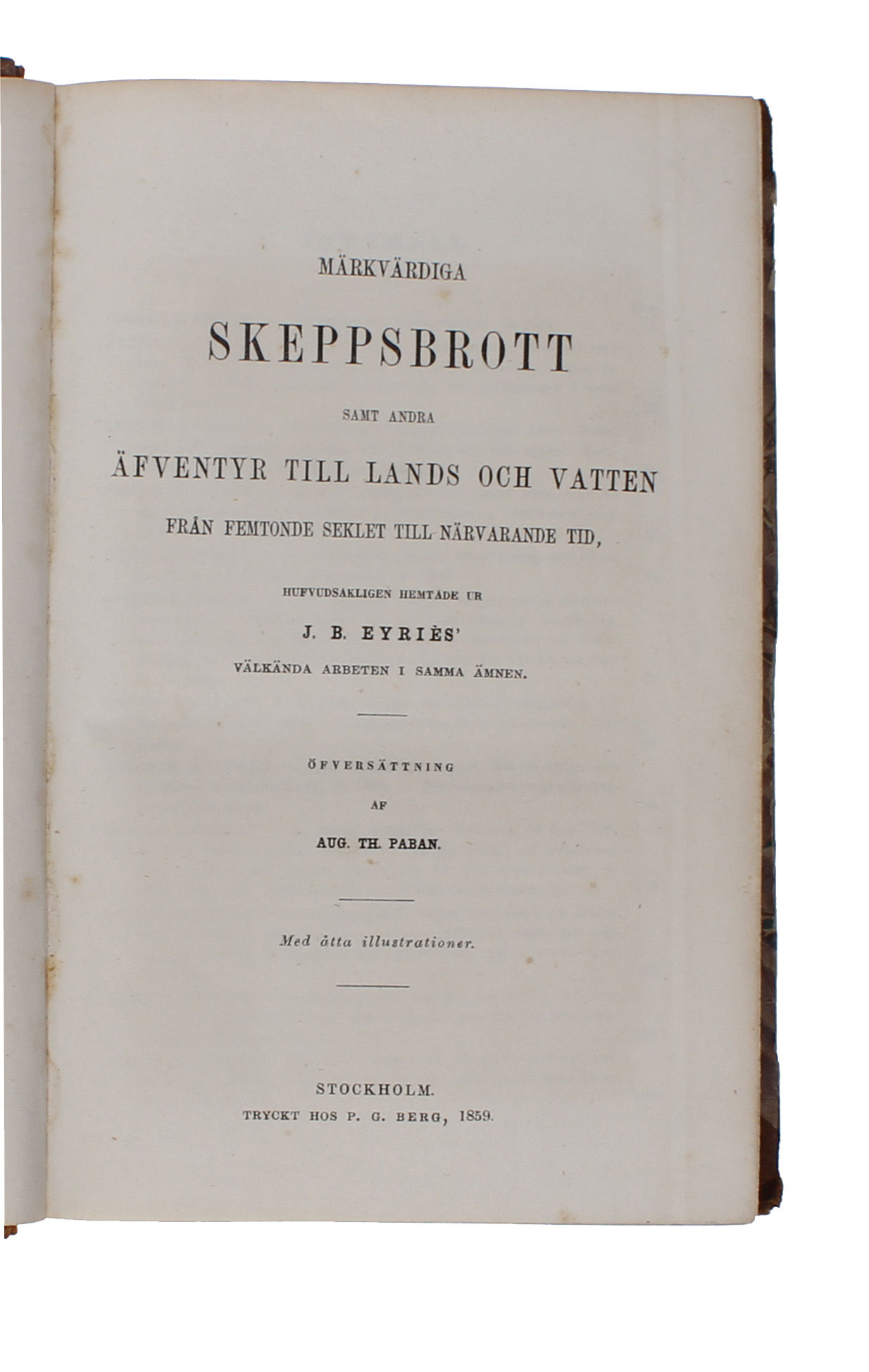 Märkvärdiga skeppsbrott samt andran äfventyr till lands och vatten från femtonde seklet till närvarande tid. Öfversättning af Aug. Th. Paban. Med åtta (kolorerade) illustrationer. (i.e. "Noteworthy shipwrecks").