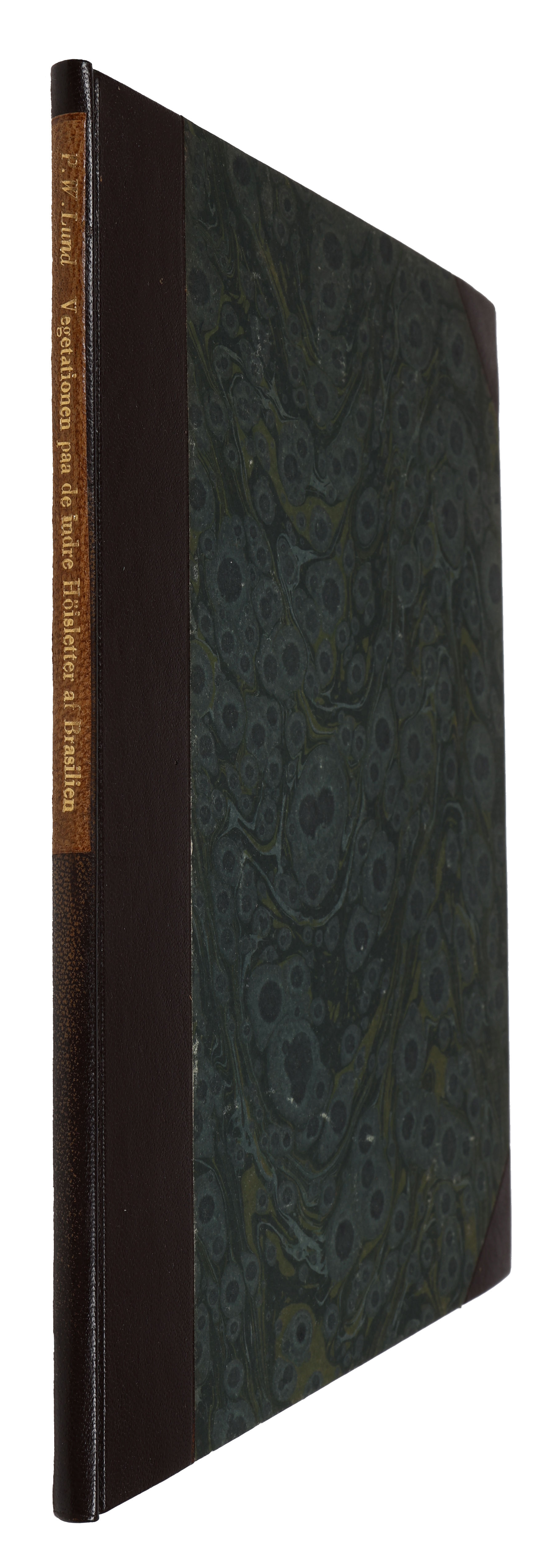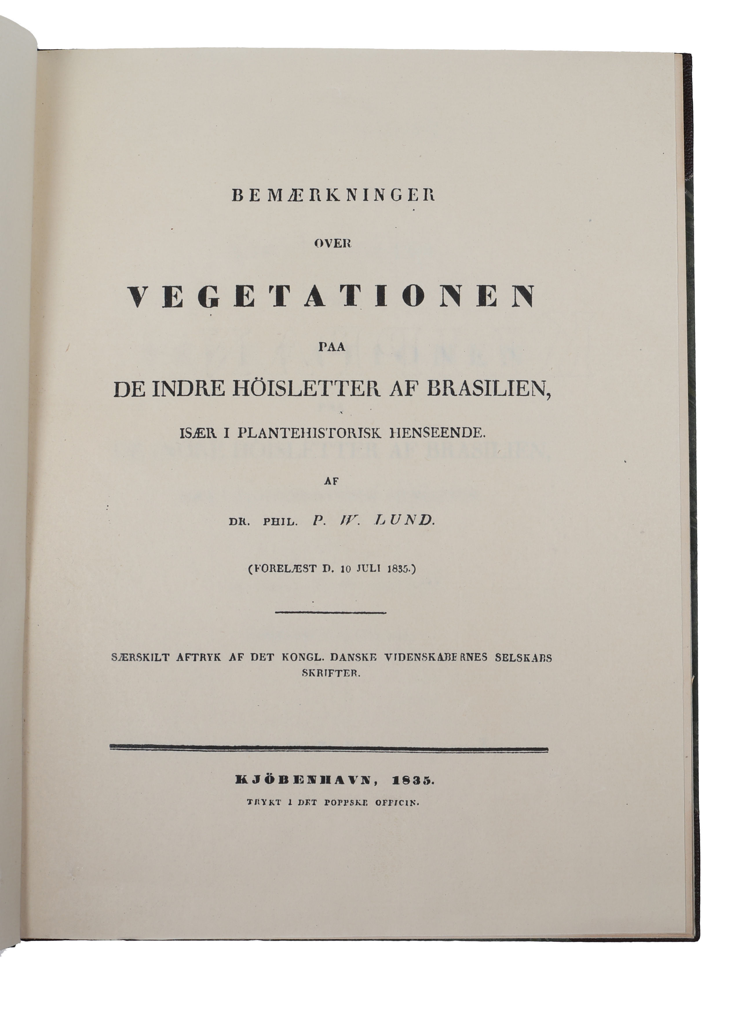 Offprint of Lund’s work on the vegetation in Brazil. Lund is today considered the father of Brazilian paleontology and archaeology. He was the first to describe dozens of species of pre-historic Pleistocene megafauna, including the fabled Saber-toothed cat Smilodon populator. He also made the then ground-breaking discovery that humans co-existed with the long-extinct animal species, something which possibly prompted him to terminate his scientific work. His comprehensive collections are today found at the Danish Natural History Museum in Copenhagen.