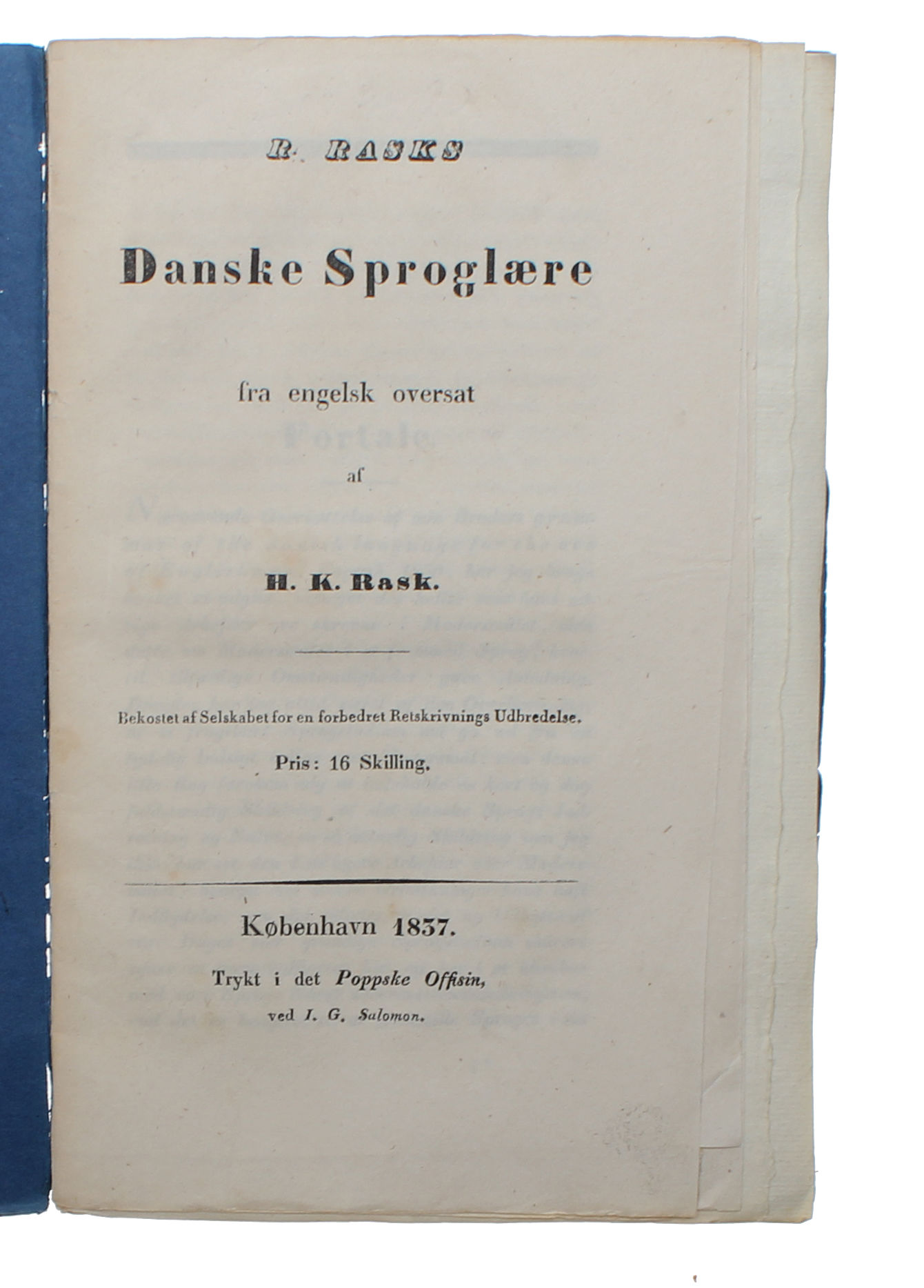 R. Rasks Danske Sproglære fra engelsk oversat af H.K. Rask. Bekostet af Selskabet for en forbedret Retskrivnings Udbredelse.