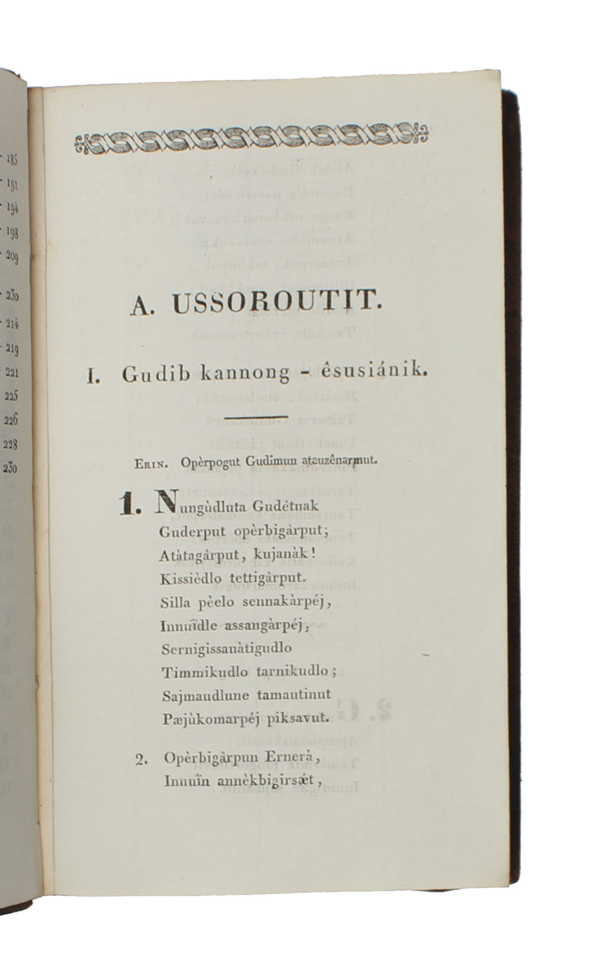 Odensime, Nakittarsimaput Hempel-ikunnit, 1834. 8vo. In a contemporary modest full calf binding with gilt lettering to spine. Binding with wear, internally fine and clean. (8), 237, (3) pp.