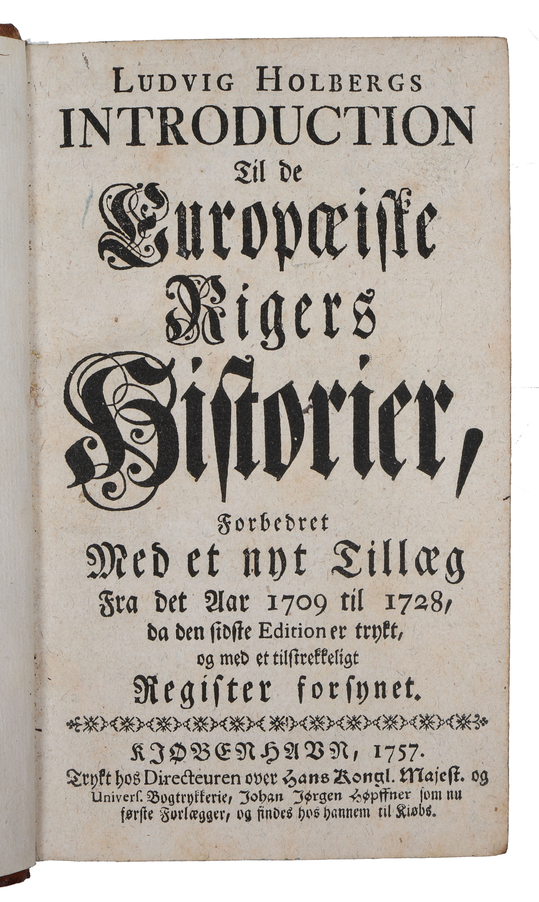 Kjøbenhavn, Höpffner, 1757. 8vo. In contemporary full calf with four raised bands and blind stamped ornamentation to spine. Small paper-label pasted on to top of spine. Miscolouring to upper margin of front board and scratches to back board. Internally with light occassional foxing. From pp. 779 with wormtract in lower margin, occassionally affecting text. 858, (21) pp.