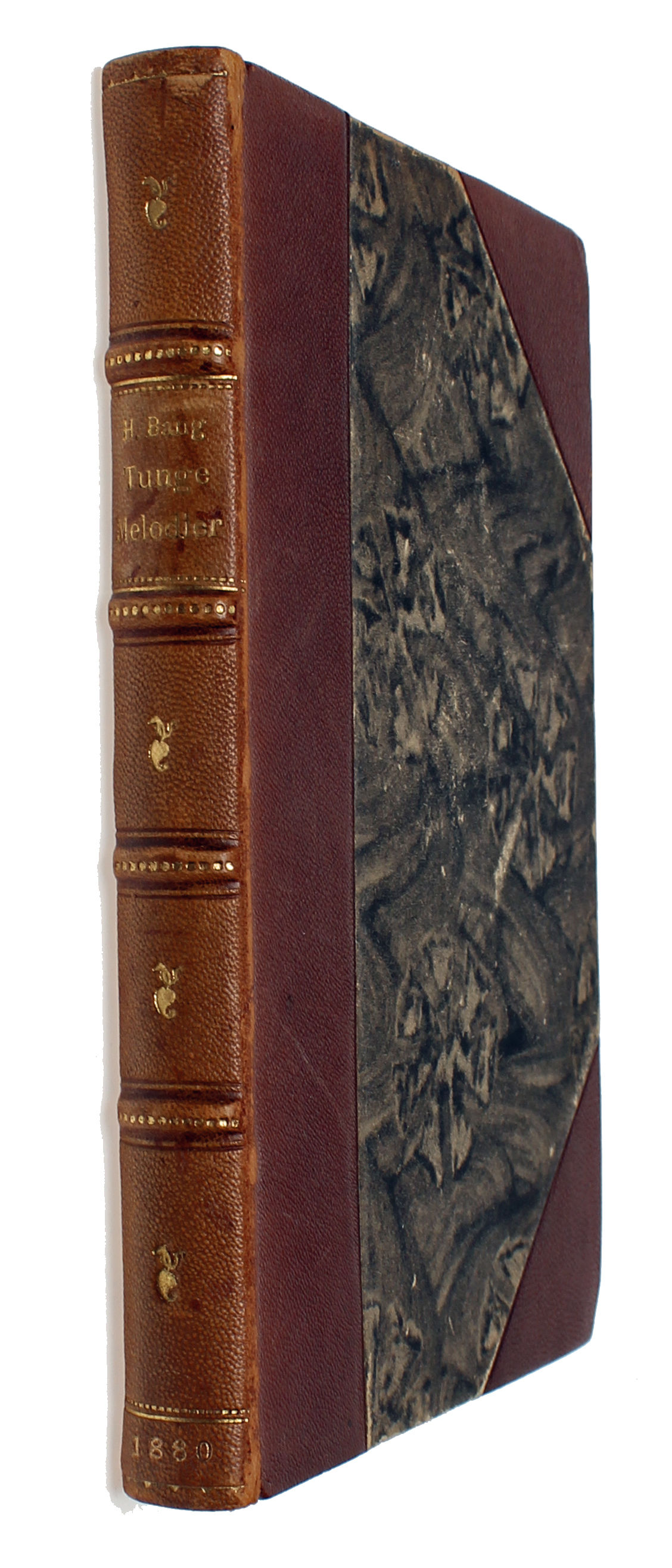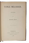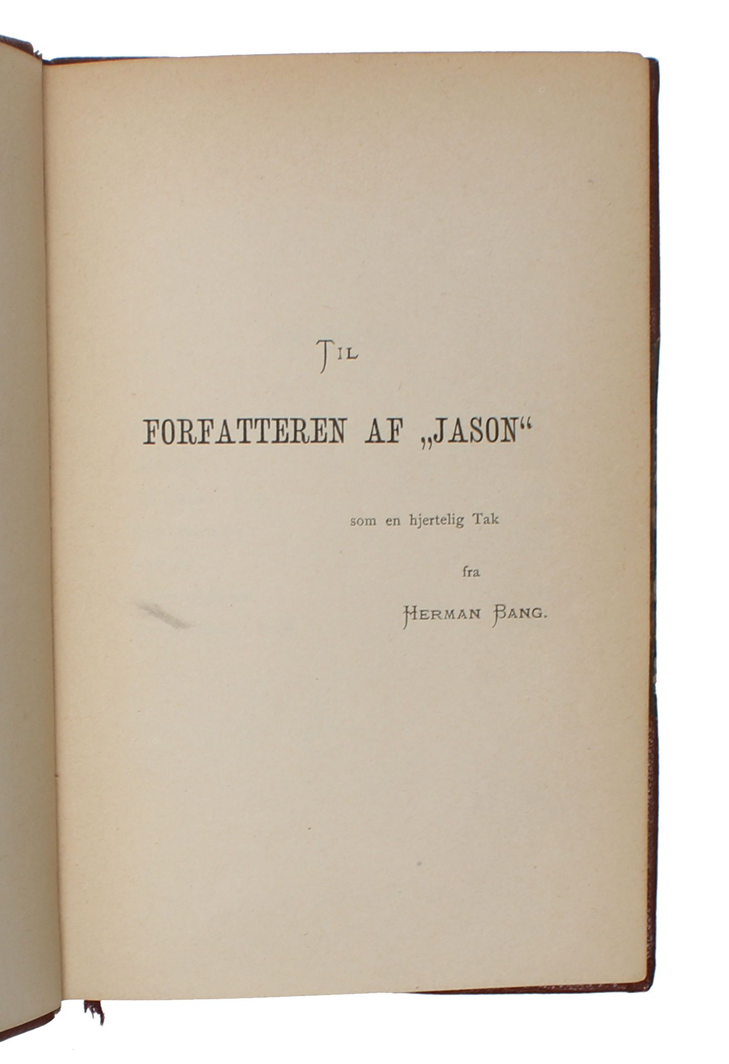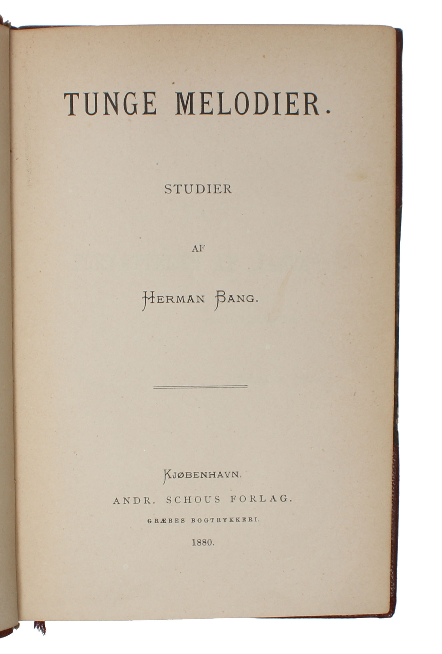 Kjøbenhavn, Andr. Schous Forlag, 1880. 8vo. Indbundet i et samtidigt halvlæderbind med rygforgyldning og fire ophøjede bind. Ryg falmet og false en smule slidte. Med Svend Krag-Jacobsens exlibris. Med dedikation fra den prominente danske litteraturhistoriker Hakon Stangerup og hustru på foromslaget: "Til Sven / den gloriøse Bang-kender, / vor gode Ven, / på hans Examensdag / fra Betty og Hakon." Ren og pæn indvendig. Med en illustration af Bang opklæbet på indersiden af bagpermen. (8),184 pp.