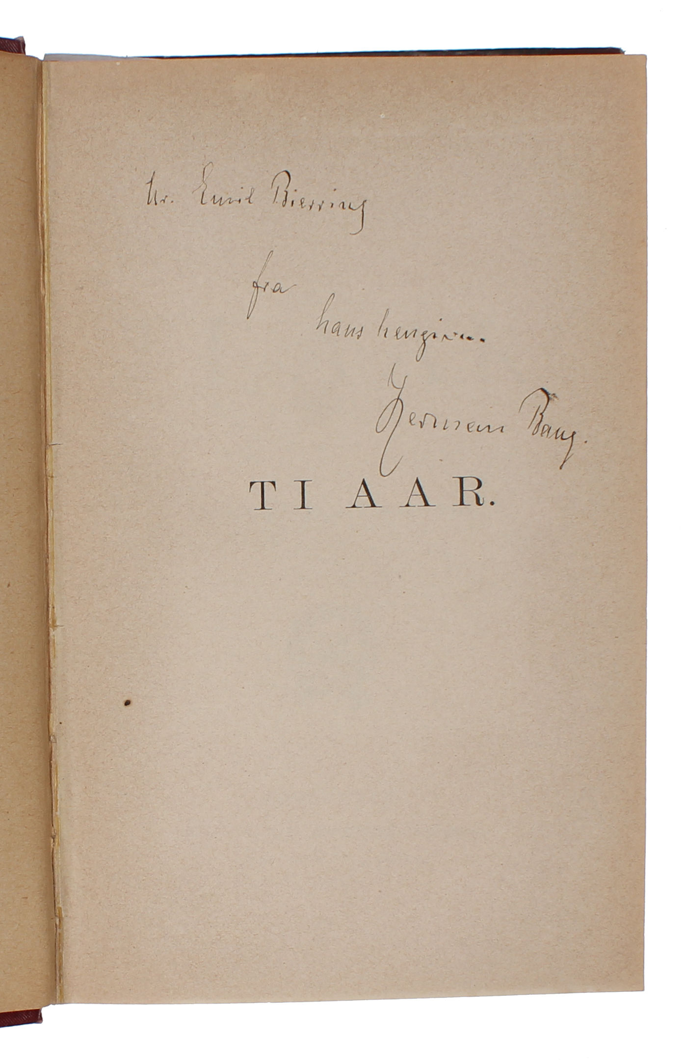 Nydeligt dedikationseksemplar af originaludgaven. Eksemplaret er dedikeret til Bangs kollega ved Nationaltidende Emil Bierring. Herring, 87.