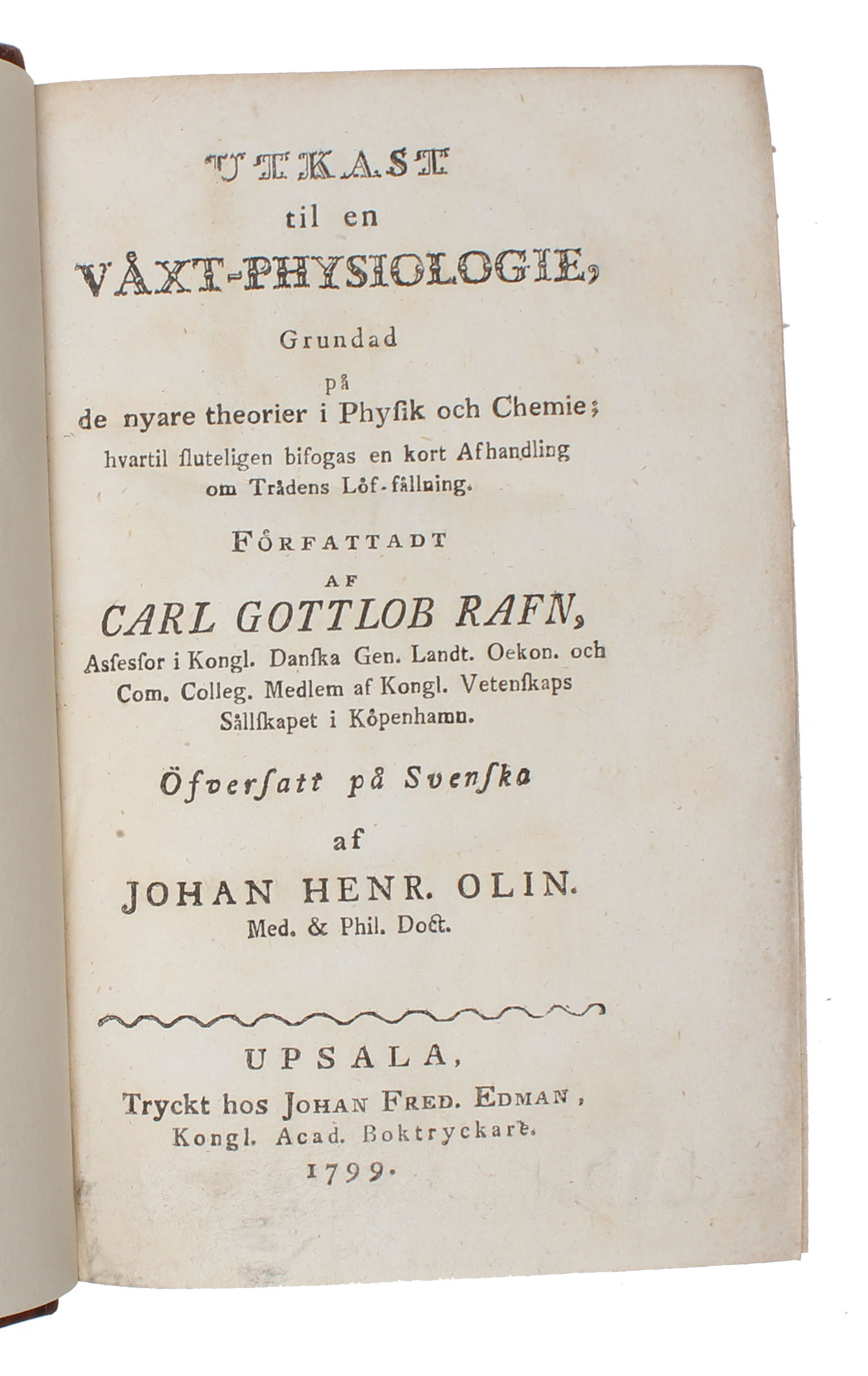 Utkast til en växt-physiologie, grundad på de nyare theorier i physik och chemie; hvartil sluteligen bifogas en kort afhandling om trädens löf-fällning. Öfversatt på svenska af Johan Henr. Olin.
