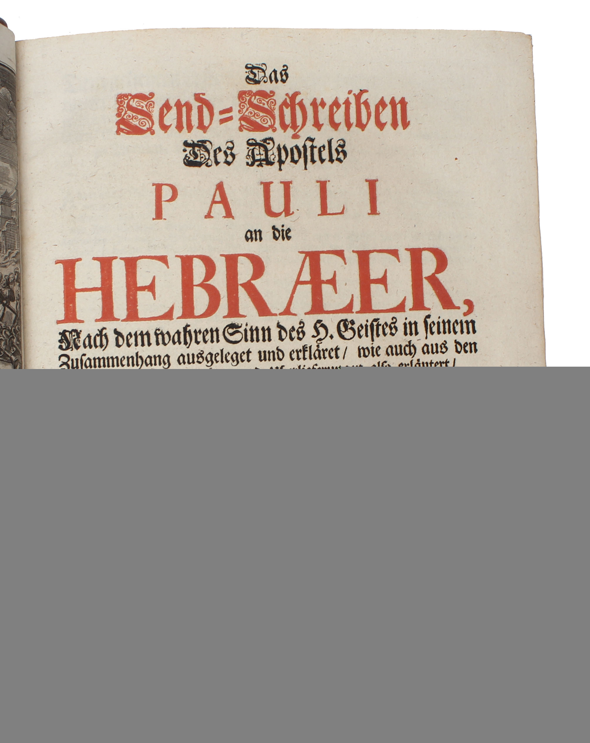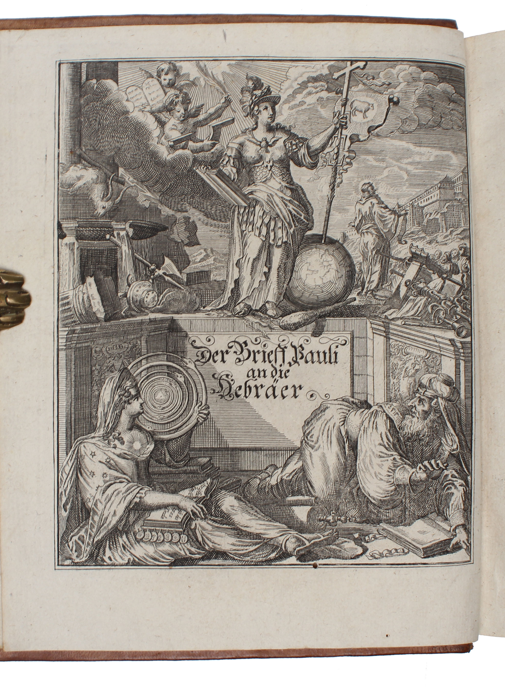 Bremen, Saurmann, 1714. 4to. In a nice contemporary Cambridge-style mirror binding with four raised bands. Small paper-label pasted on to upper part of spine. A few small holes to front board. A nice and clean copy. (6), 1096, (32) pp. + engraved frontispiece.