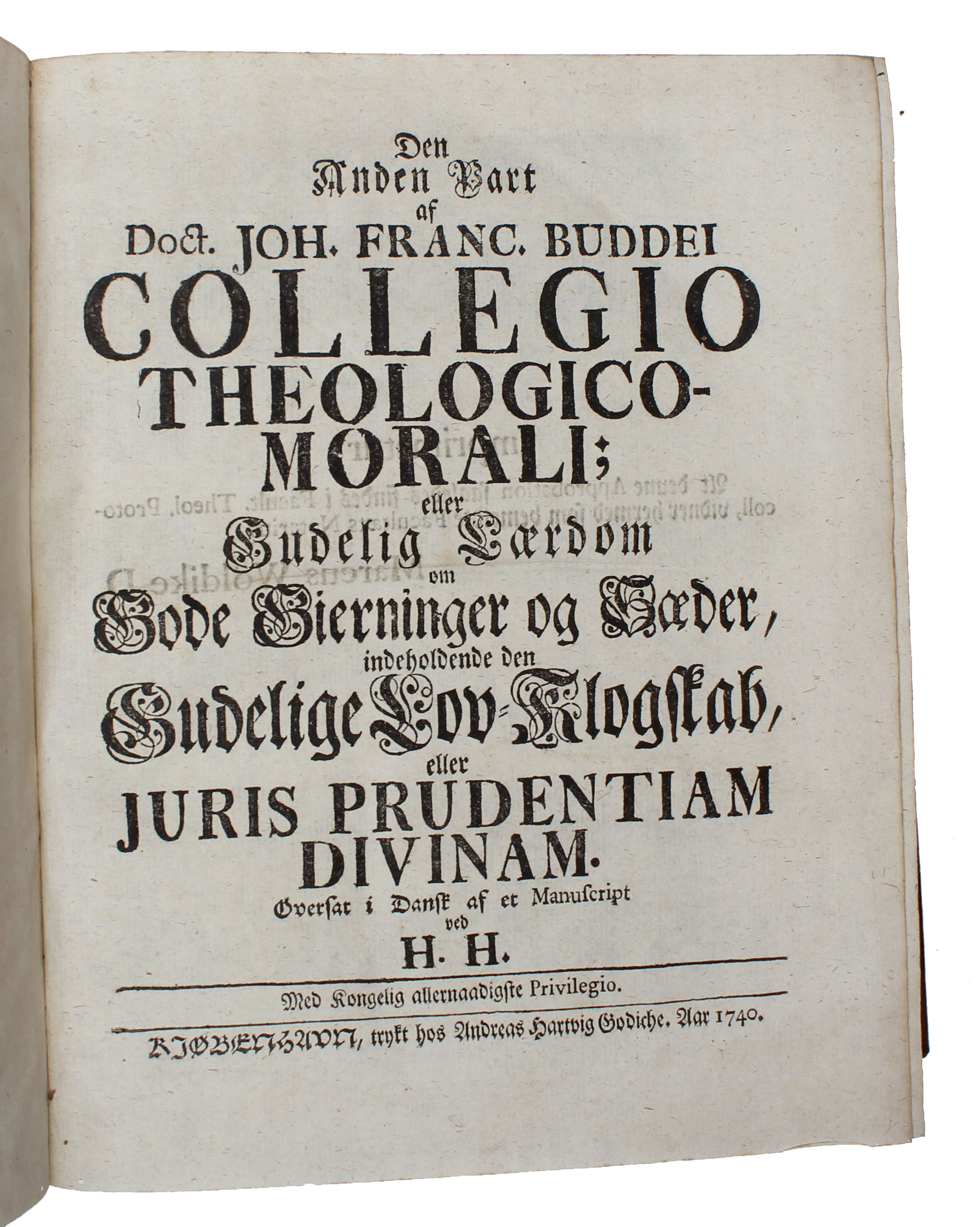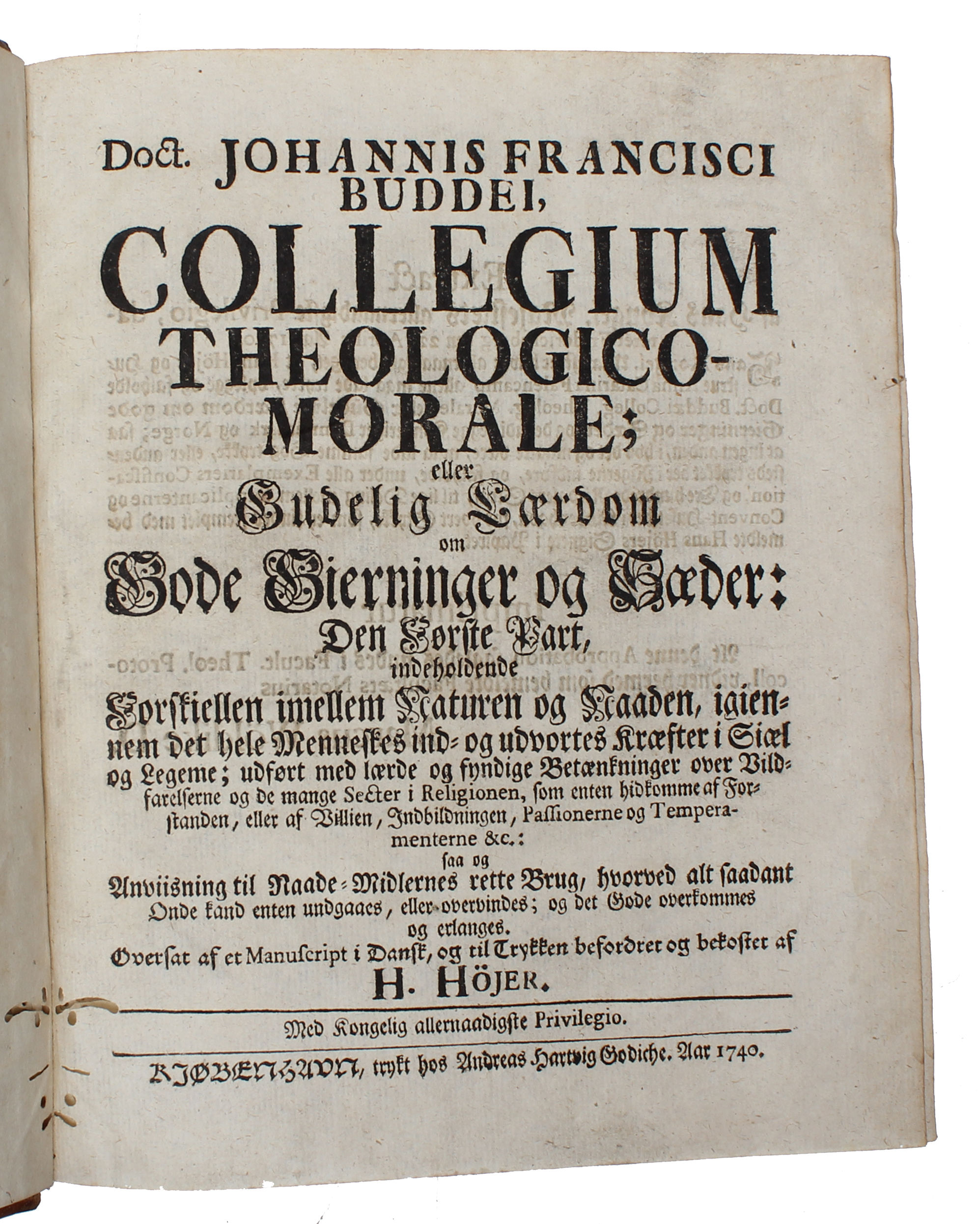 Rare first Danish translation of Buddeus's "Institutiones theologiae moralis" (1711) which in many aspects inaurated a new age of moral sensitivity among Lutherans of which Pietism became the most important theological tradition. Johann Franz Buddeus (1667-1729) born in Pomerania, was professor of Greek and Latin, moral philosophy and theology at Leipzig and Halle.