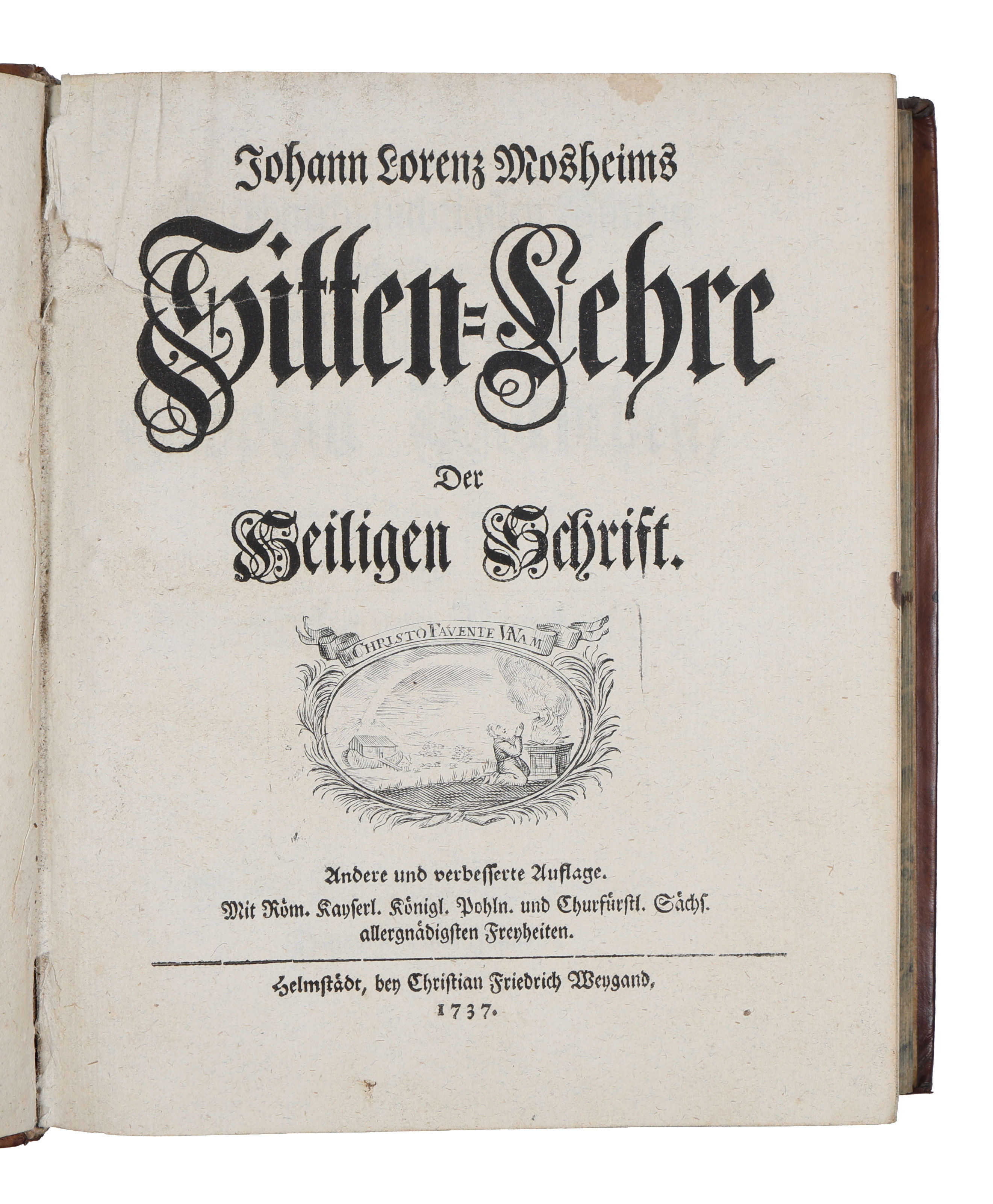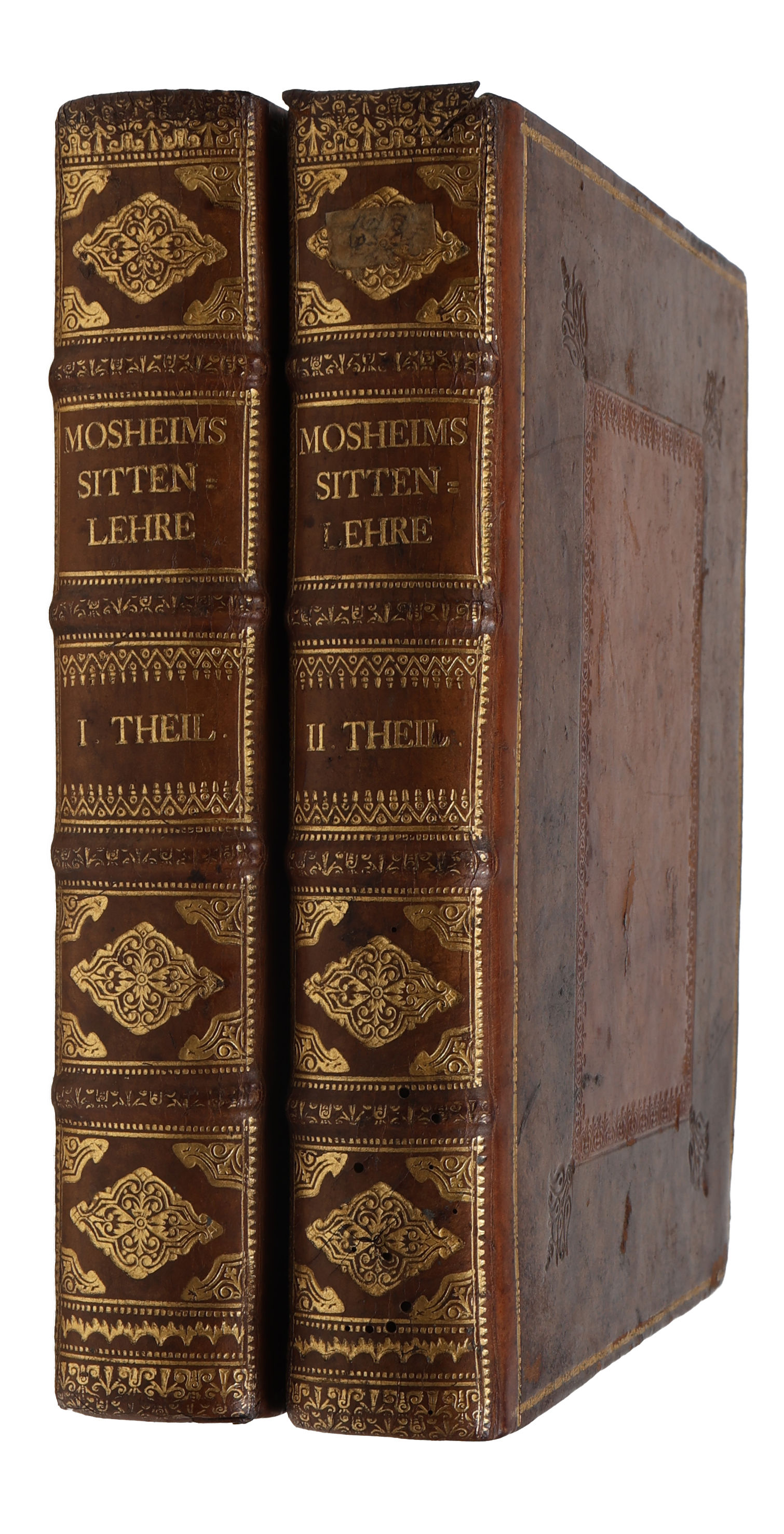 Helmstädt: Christian Friedrich Weygand, 1737 - 1738. 4to. Uniformly bound in two contemporary Cambridge-style mirror bindings with four raised bands and gilt lettering and ornamentation to spine. A few scratches to extremities, a few small holes to spine on vol. 2 and head of spine on vol. 2 with small tear. Internally fine and clean, a nice set. (26), 550, (32) pp.; (40), 538, (46) pp. Wanting the frontispiece.