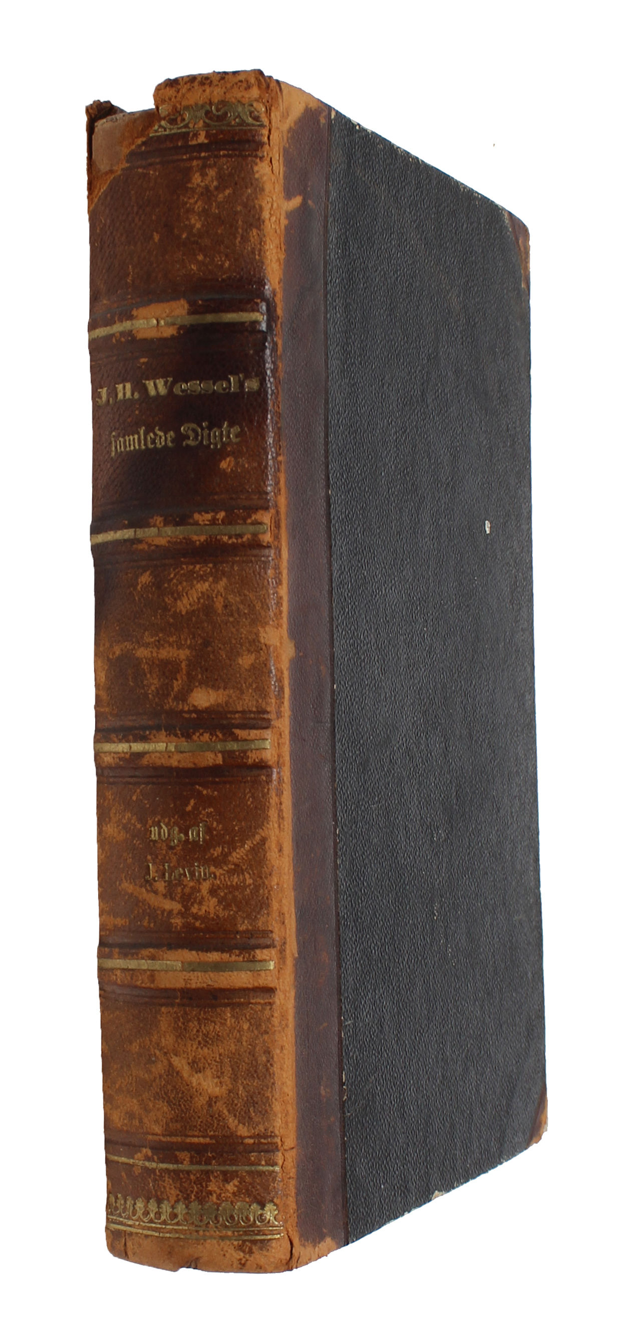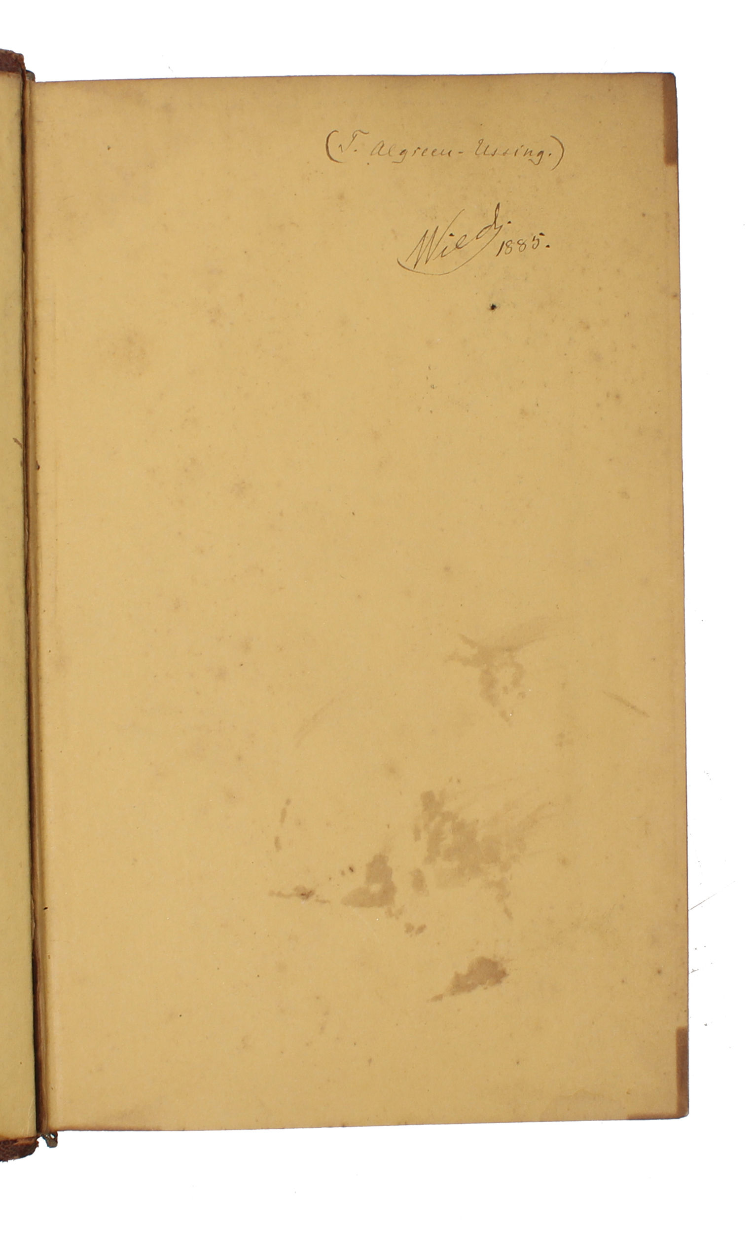 Kjøbenhavn, C. A. Reitzel, 1838. 8vo. X, (2), 79 pp. Lovely contemporary brown half calf with marbled paper over boards. Double gilt lines and gilt lettering to spine. Foot of spine with the gilt initials of H.P. Kierkegaard. A few brown spots to the margin of the first eight leaves, otherwise remarkably clean. An excellent, beautifully preserved copy. With the ownership signature of H.P. Kierkegaard to front fly-leaf. An exquisite copy of the first edition of Kierkegaard's first work, which has belonged to Kierkegaard's disabled cousin, who was a great source of inspiration to Kierkegaard. The relationship between the two cousins was very touching, and they both benefitted greatly from the other. Søren drew inspiration from his cousin, who was lame and unable to walk, and he cared a great deal for him. Hans Peter was one of the very few who had a standing invitation to visit Søren. He felt that his cousin might lead a truer and more meaningful life than most other people, who do not face the same hardships. Hans Peter, on the other hand, was greatly comforted by his famous cousin and his edifying writings. Søren helped him feel that, in spite of his hardships, his life was not wasted – he helped him believe in God. All copies of Kierkegaard's works belonging to his cousin denote a special significance, but it is especially lovely to find H.P. Kierkegaard's copy of his cousin's very first book. Kierkegaard's famous first work sews the seeds of his future career and initiates his philosophical production. It is in this famous review of Hans Christian Andersen as an author of novels, with a particular focus on his Only a Fiddler that Kierkegaard – the then 25 year-old theology student known only in a small academic circle, for his wit and sharp intelligence – puts forth his devastating criticism of Hans Christian Andersen – then 33 years old and already widely famous, Denmark's other national hero and world-famous fairy tale-author. Even though the book is written as a polemic review, we already here witness Kierkegaard's introduction of his emphasis on authentic individual existence will continue throughout his entire production; as thus, From the Papers of one Still Living serves as a highly important introduction to Kierkegaard's philosophical-ethical production. Kierkegaard points out that Hans Christian Andersen has not yet found himself and therefore cannot be a good author. This emphasis on authenticity and on the necessary first stage of the epic becomes an introduction to Kierkegaard's famous theory of stages that he develops in his later works. He rejects the notion that environment is decisive in determining the fate of genius – the genius is a shaping subject, not a passive one formed by circumstances. Not one that needs to be nurtured and sheltered in order not to perish. The work was originally meant to be published as an article in the literary periodical Perseus, of which Johan Ludvig Heiberg was the editor. But the article grew too extensive, and the intended columns in the periodical were given to H.L. Martensen instead. Martensen's article took up 70 pages and was about the idea of Faust, which vexed Kierkegaard, who had wanted to write about that subject himself. Kierkegaard, Hans Peter (1815-62) is always referred to as Kierkegaard's cousin, also by Kierkegaard himself, but if one is to be precise, he was Søren's half-cousin. H.P. was the son of M.P. Kierkegaard's (Søren's father) cousin, M.A. Kierkegaard. H.P. was one of the few people Kierkegaard was personally very close to. As Søren writes in a letter to H.P. (SKS letter no. 27) "you are one of the exceptions". He cared a great deal for his cousin, who was disabled. He was lame, completely paralyzed on one side of the body, and unable to walk. Intellectually, however, he was gifted, and the two cousins grew very close. Søren saw in him a purity that he did not see in other people, an ability to lead a truer and more meaningful life than others, who did not have to suffer in the same way. Søren was also a great comfort to H.P, who read the works of his famous cousin with enthusiasm. He probably owned every single work Kierkegaard wrote, and he drew great comfort from several of them. As Brøchner recalls in his recollections about Kierkegaard (Erindringer om Søren Kierkegaard – no. 43), H.P. "read his cousin's writings with the greatest of interest, occasionally visited him in his home, and drew much spiritual awakening from these visits." Brøchner continues to recall how he once told Kierkegaard what a great impression one of his works, Opbyggelige Taler i forskjellig Aand, had made upon H.P. In the confessional discourse, Søren portrays a person, who due to his bodily disposition is unable to practice anything physically or outwardly, and goes on to beautifully describe how this person too is subject to the same ethical demands as everyone else and what particular form this life-assignment takes on for him. To this, Søren replied "yes! To him, that work is a blessing". And so it was. Reading his cousin's upbuilding works provided the disabled Hans Peter with the power to overpower gloomy thoughts about his life having no meaning. Søren gave him, not only through his writings, but also through his meetings and conversations with him, the feeling of being as important as everyone else, as those who were physically blessed. There is no doubt that Kierkegaard drew inspiration from his admirable cousin, who had to overcome so much. And there is no doubt that H.P. was close to Søren's heart. Apart from Boeson, H.P. was the only person who had a standing invitation. He writes how he admires H.P., who, reconciled with his fate, with patience and devotion solves a task that is just as great as the one everyone else has to solve, whether they do big business, build houses, write great books, etc. – "when all is heard, everything, after all, mainly comes down to fervor – and when all is forgott