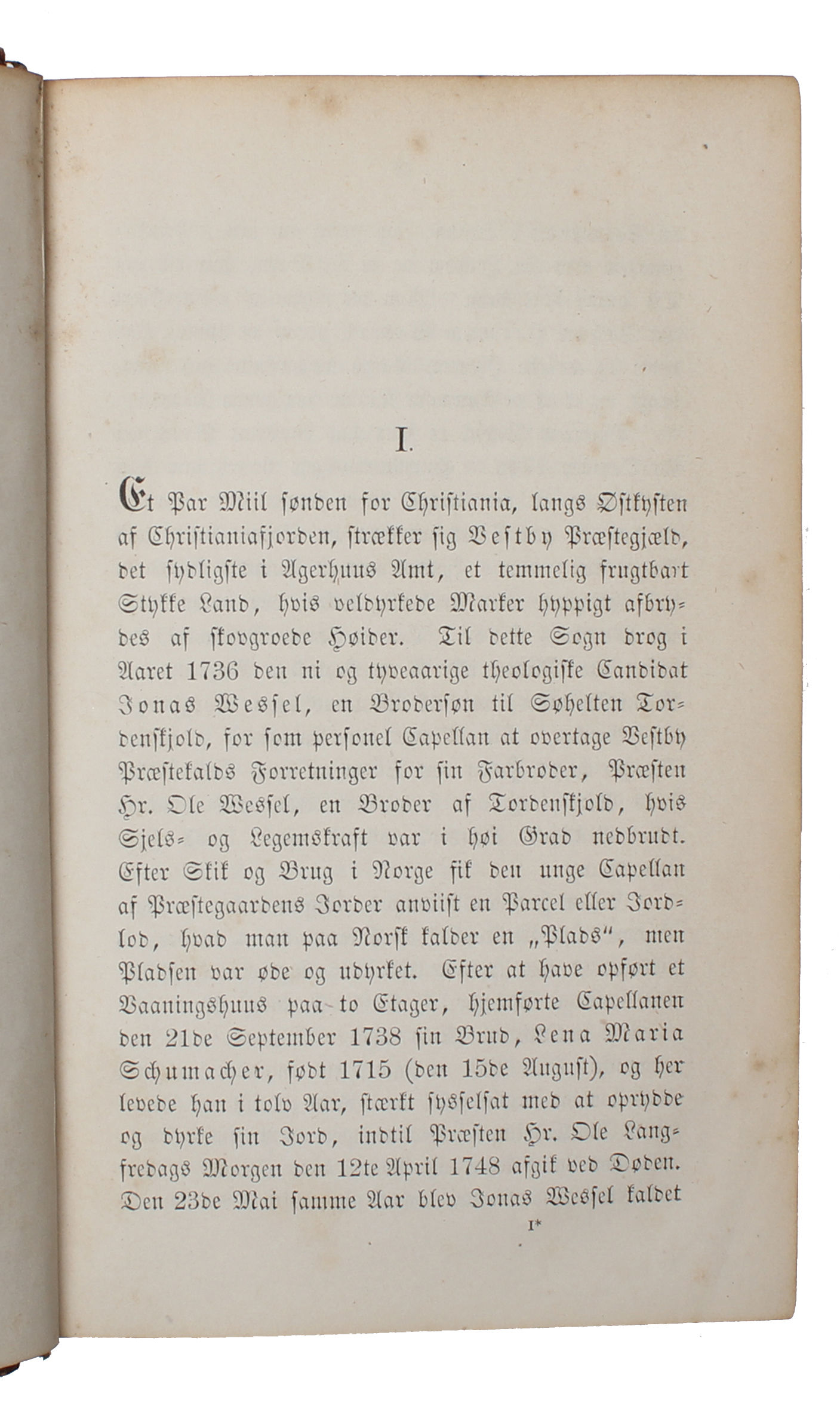 Kjøbenhavn, C. A. Reitzels Forlag, 1862. 8vo. Indbundet i et noget slidt samtidigt halvlæderbind med rygforgyldning. Fire ophøjede bind på ryg. Ryg falmet og øvre kapitæl delvist bortslidt. Kanter slidte og hjørner stødte. De første par blade noget brunplettede. Med Gustav Wieds daterede (1885) navnetræk på forsats- og titelbladet samt noten 'Indf'. (8),CXLII,394,(2) pp. + frontispieceportæt og udfoldelig planche.