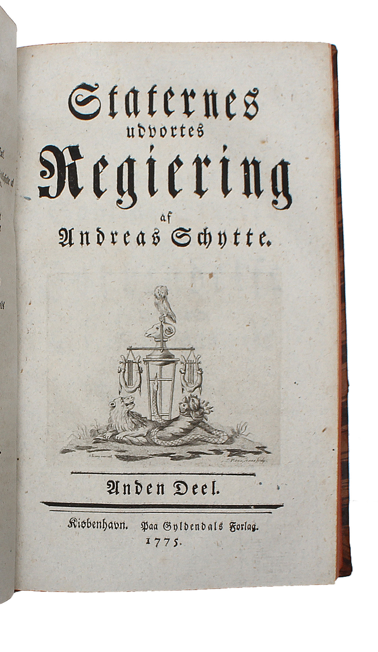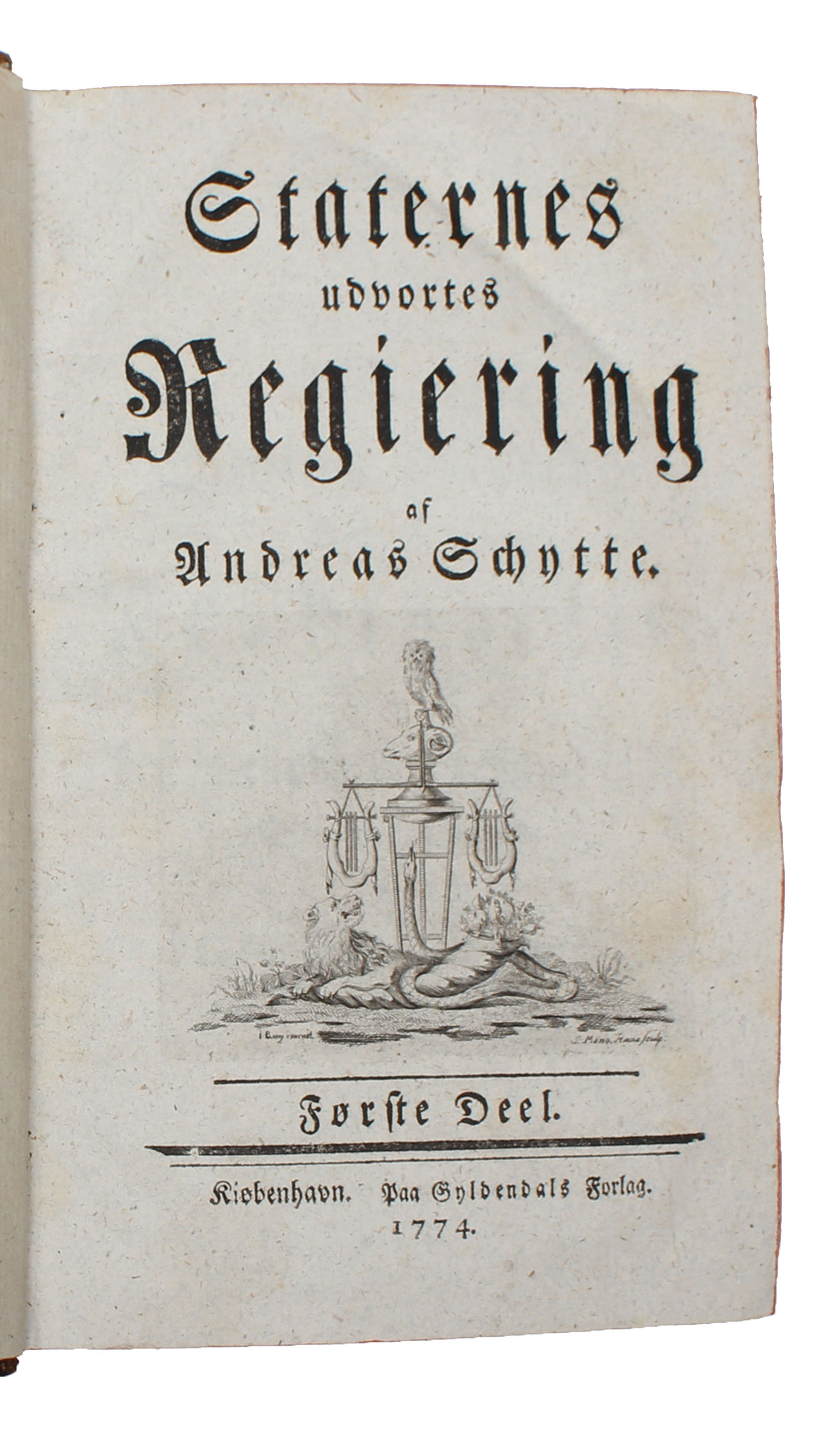First edition of one of Schytte’s most famous work, the first extensive coherent exposition of constitutional law, political and economic matters relating to Denmark. Schytte was much influenced by Montesquieu. Biblioteca Danica II, 485.