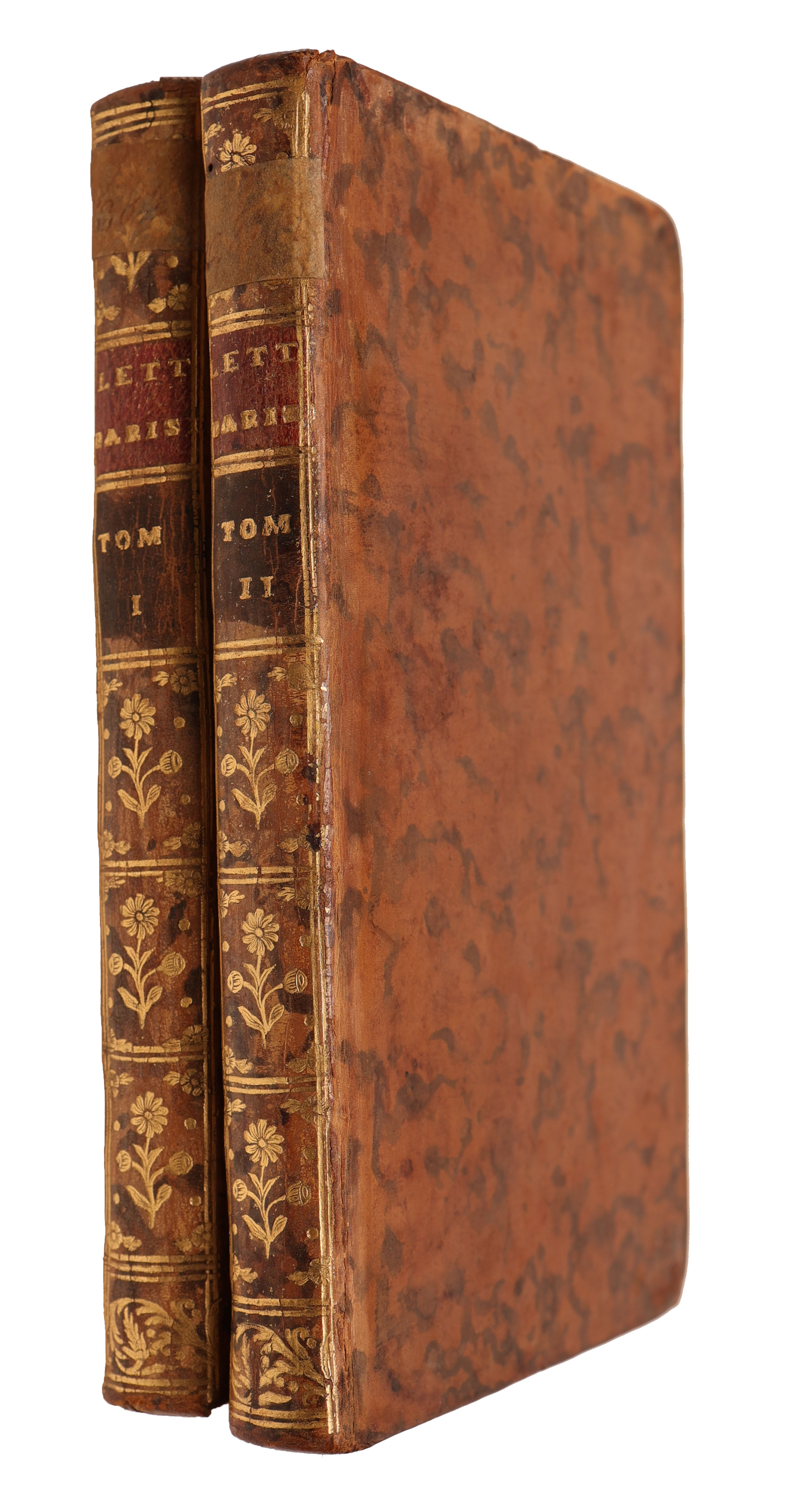 Genève & Paris, Duchesne, 1758. 8vo. Uniformly bound in two full mottled calf bindings with richly gilt spines. Edges of boards gilt. All edges coloured in red. Ex-libris (Jens Juel) pasted on to pasted down front end-paper. Small paper-label pasted on to spines. Front-board on vol. 1 with miscolouring to upper margin. A few small holes to boards. A nice set. 240 pp.; 207, (5) pp.