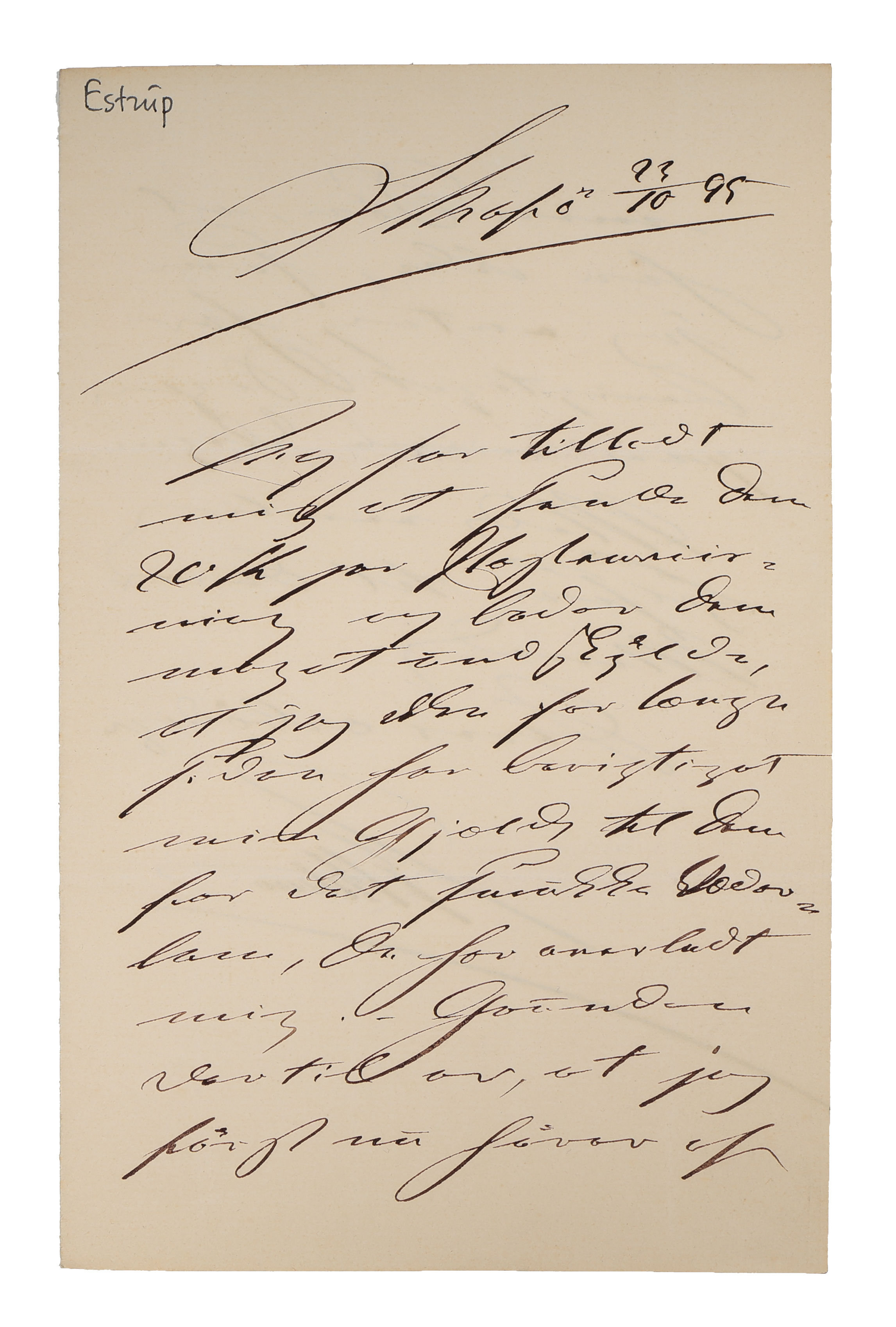 Skafø, 27/10, [18]95. 2 sider 8vo. "Jeg har tilladt / mig at sende Dem / 80 Kr paa Postanviis- / ning og beder Dem / mig at undskylde, / at jeg ikke for længe / siden har berigtiget / min Gjæld til Dem / for det smukke Væder- / lam, De har overladt / mig. Grunden / dertil er, at jeg / først nu hører af / min Søn, at / han ikke, som / jeg antog, har / berigtiget Sagen / paa mine Vegne. / Med venlig / Hilsen til Deres / Mand / Deres ærbødige / JBS Estrup."