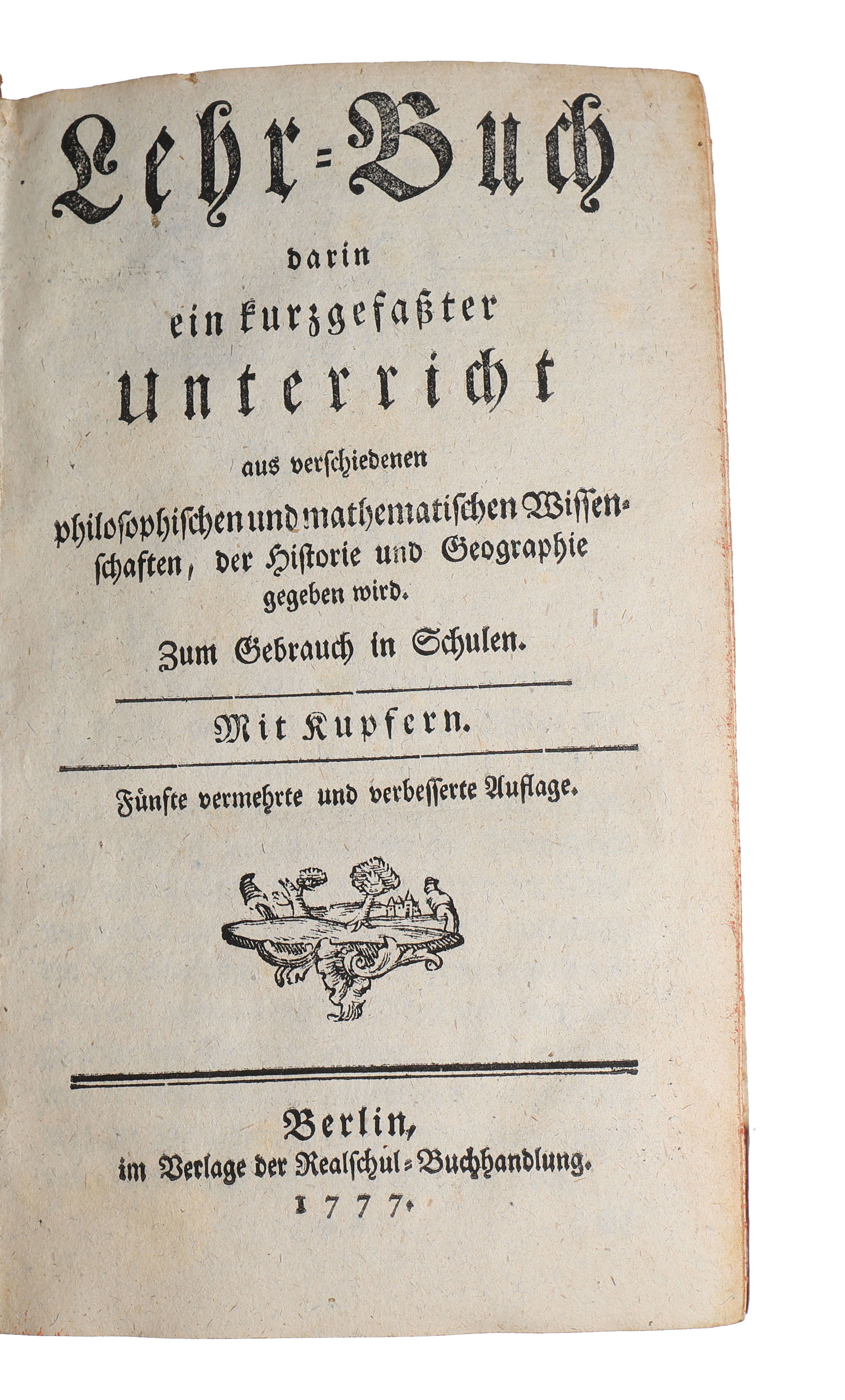 Lehr-buch, darin ein kurzgefasster unterricht aus verschiedenen philosophischen und mathematischen wissenschaften, der historie und geographie gegeben wird Zum gebrauch in schulen. Fünfte vermehrte und verbesserte Auflage.