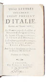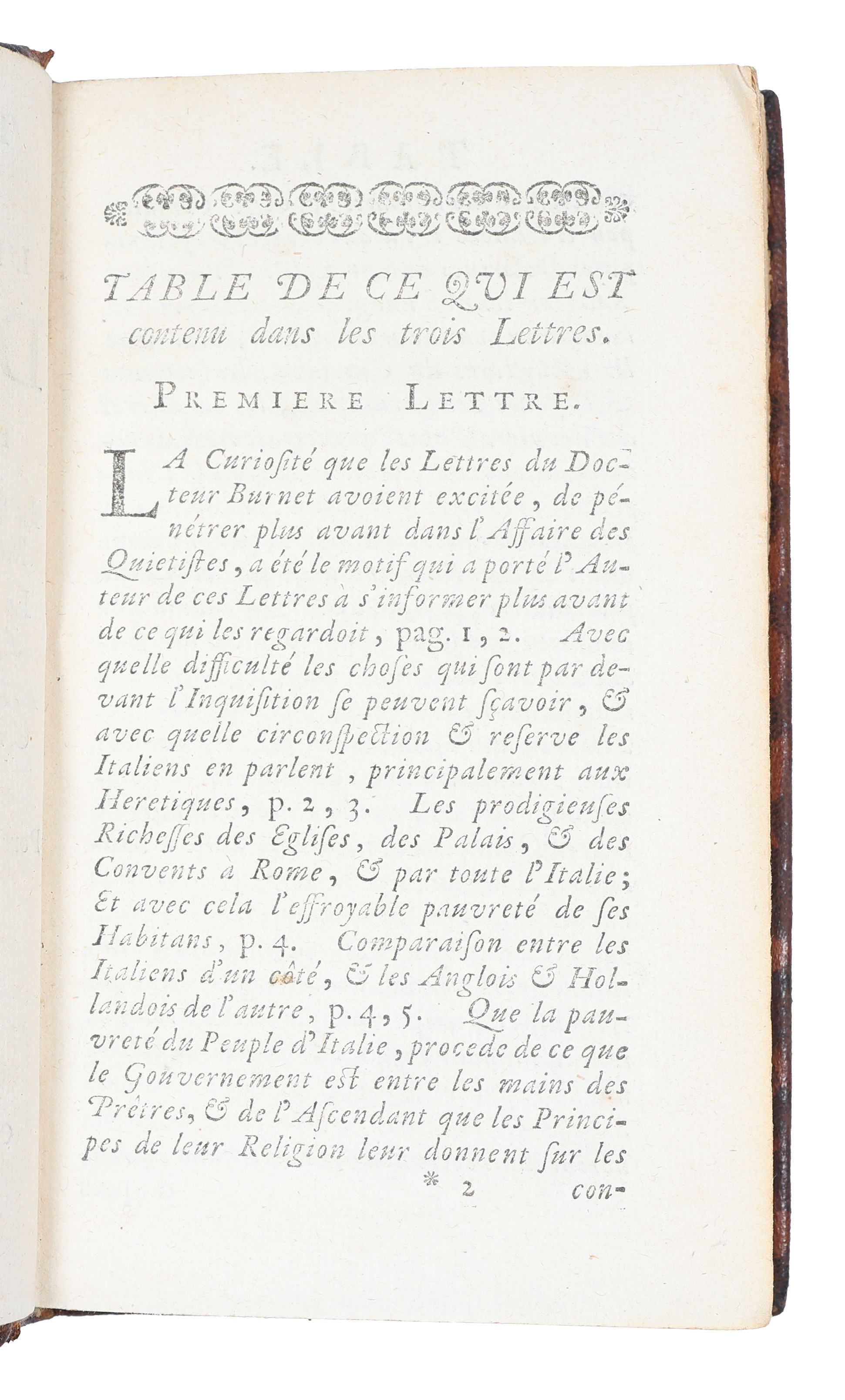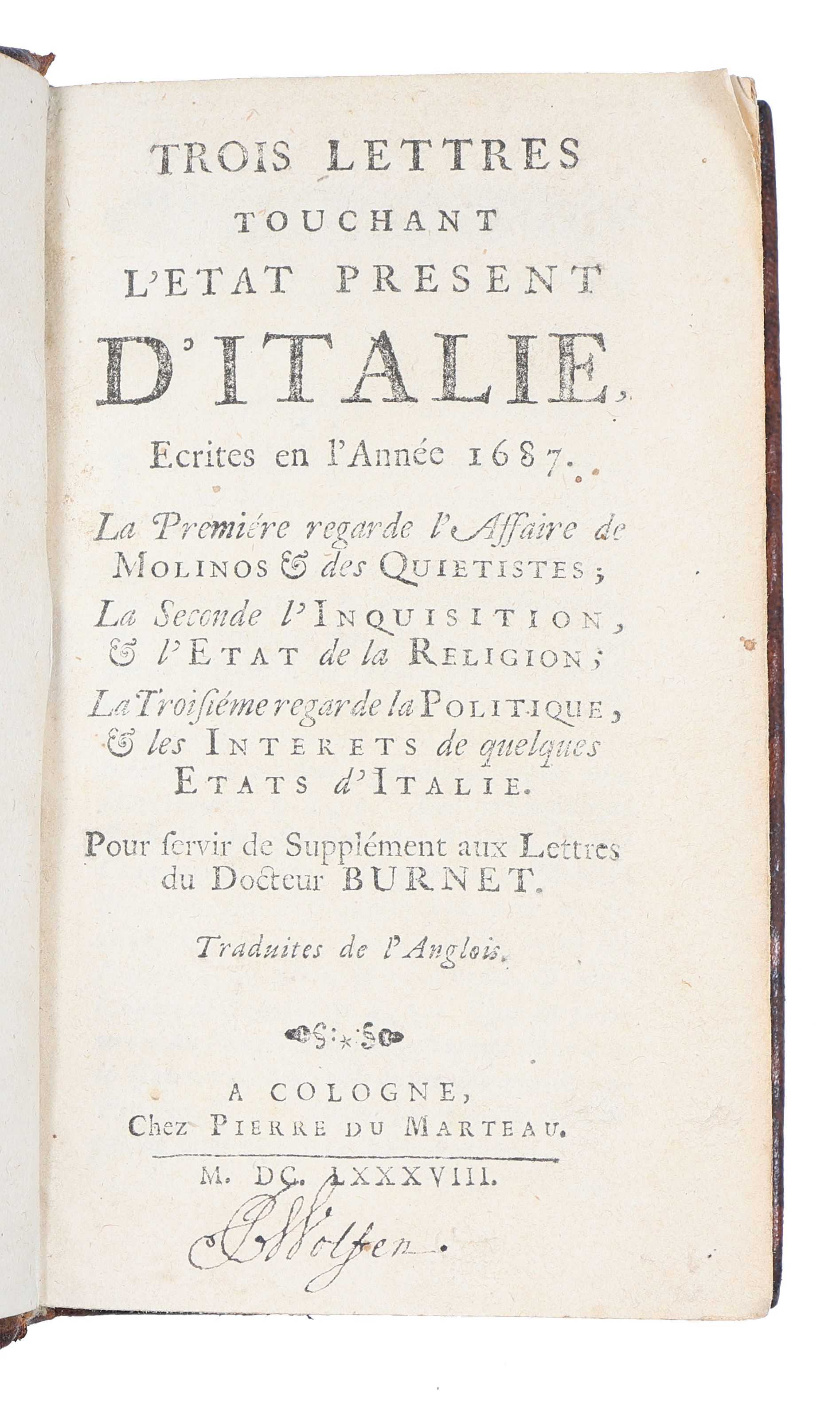 Uncommon first French transation, published the same years as the original English of Burnet’s “Three letters concerning the present state of Italy”. Here Burnet is offering a detailed account of his travels in Italy where Pope Innocent XI offered him an audience, which Burnet declined on account of his poor knowledge of the Italian language. Gilbert Burnet (1643 –1715) was a Scottish philosopher and historian and later Bishop of Salisbury. He was fluent in Dutch, French, Latin, Greek and Hebrew.