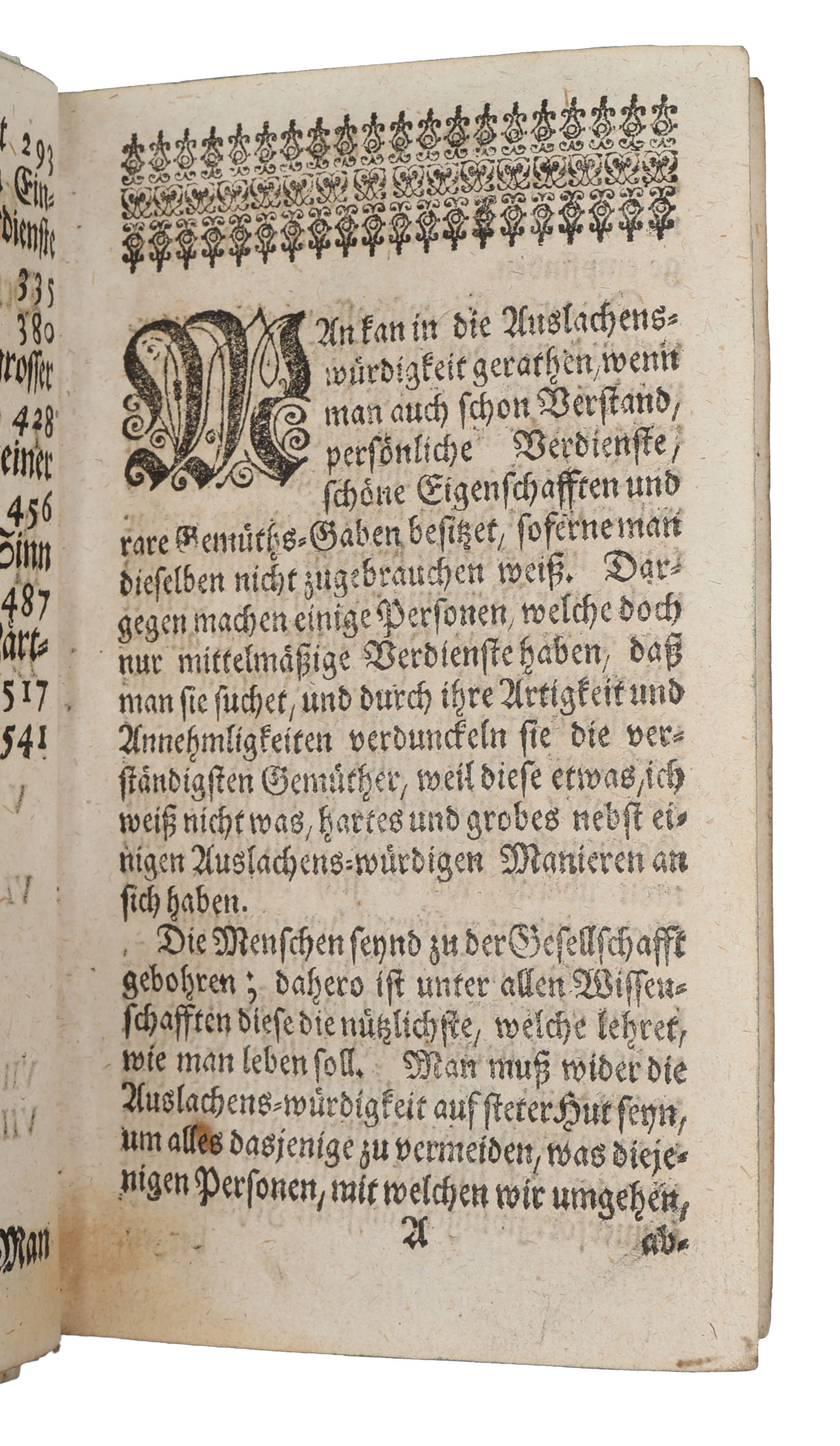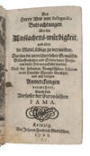 The rare first German translation of Jean-Baptiste Morvan de Bellegarde "Réflexions sur le ridicule" in which he reflects on the behaviors, attitudes and social customs of the that make people subject to ridicule or contempt.