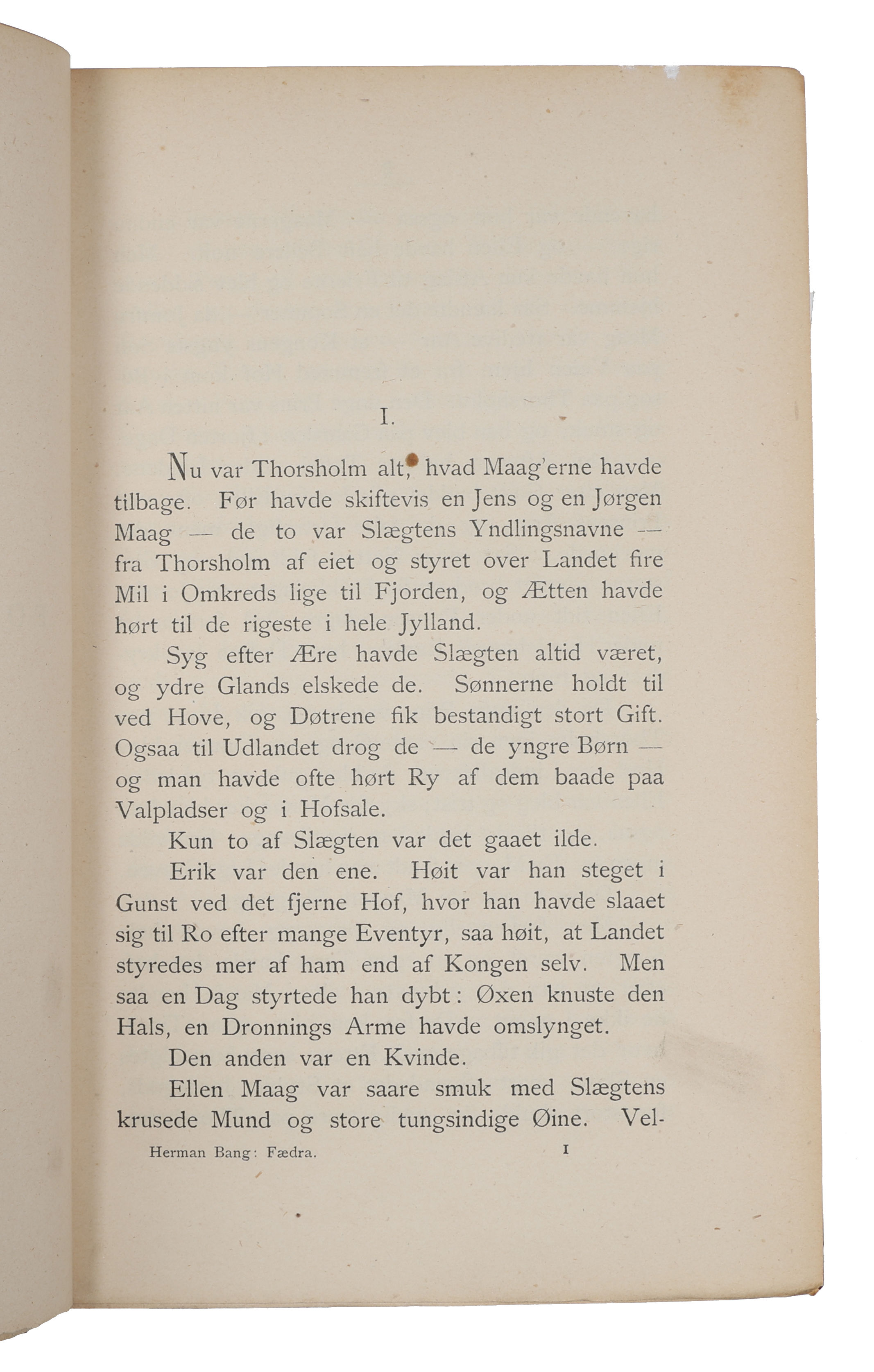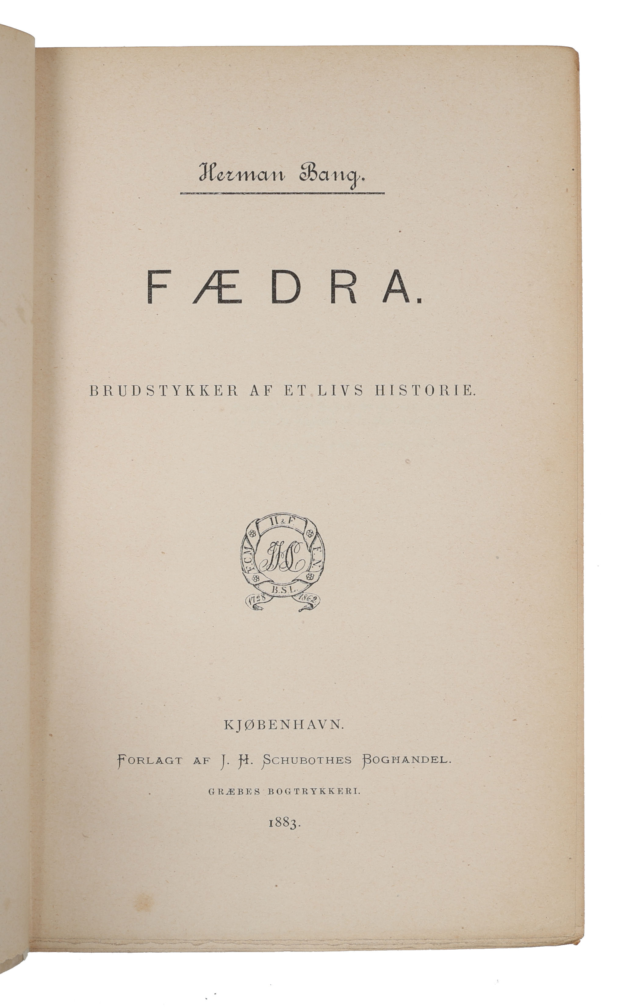 Kjøbenhavn, J. H. Schubothes Boghandel, 1883. 8vo. Indbundet ubeskåret med de originale omslag og rygstrimmel i et nydeligt senere marmoreret helpapbind. Topguldsnit. Forgyldt skindtitel på ryg. Skindforstærkede kapitæler og hjørner. (Agnete With). Med egenhændig dedikation fra Bang på smudstitelbladet: "Marie Astrup / fra / Herman Bang. / 28.11.83." En smule spredte brunpletter, ellers ren og pæn indvendig.