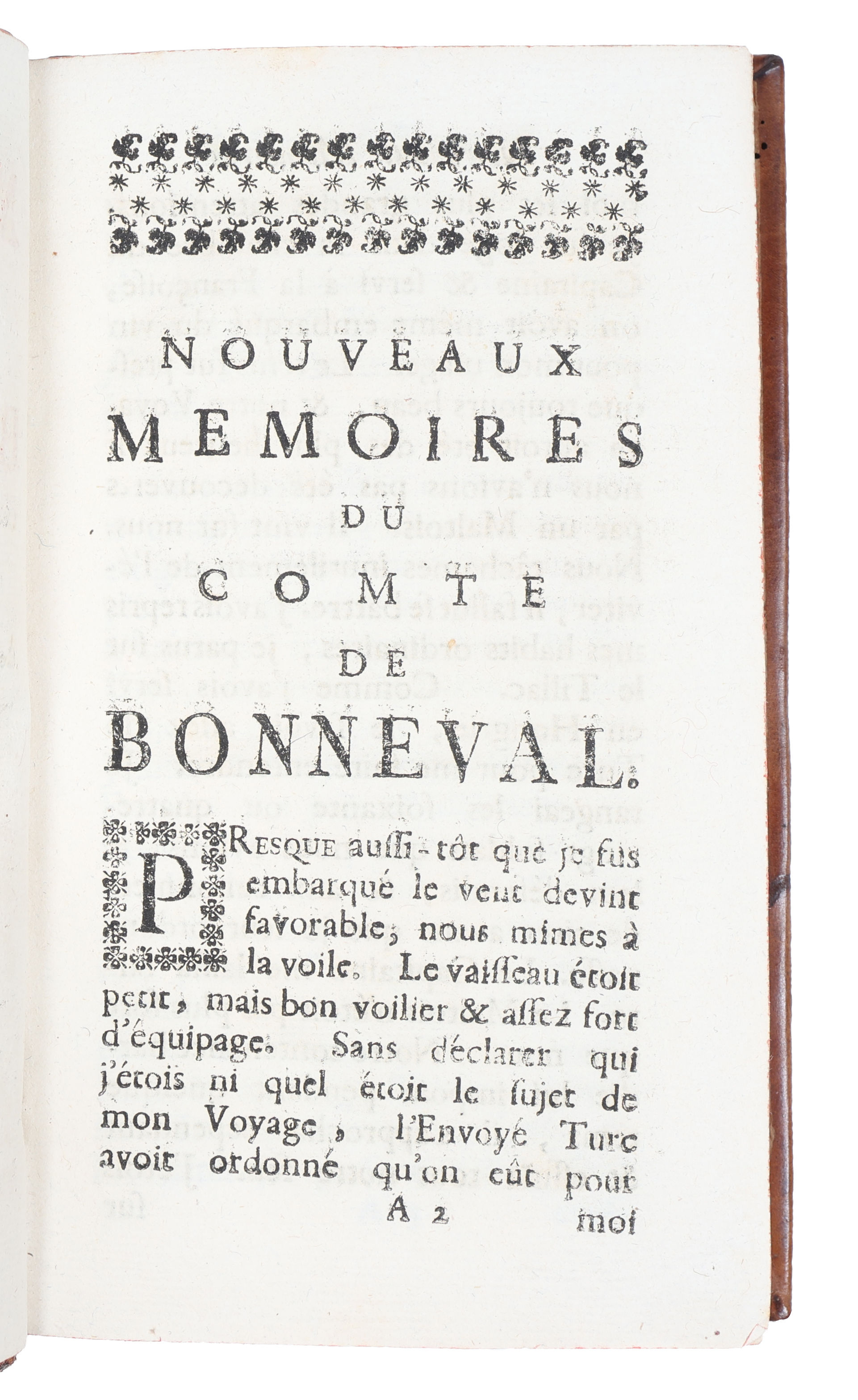 Londres (i.e. Amsterdam), Depens de la Compagnie, 1737. 8vo. In a contemporary Cambridge-style mirror binding with five raised bands and richly gilt spine. All edges coloured in red. Old paper-label pasted on to top of spine. A few scratches with some loss leather to boards. Internally very nice and clean. 269 pp.