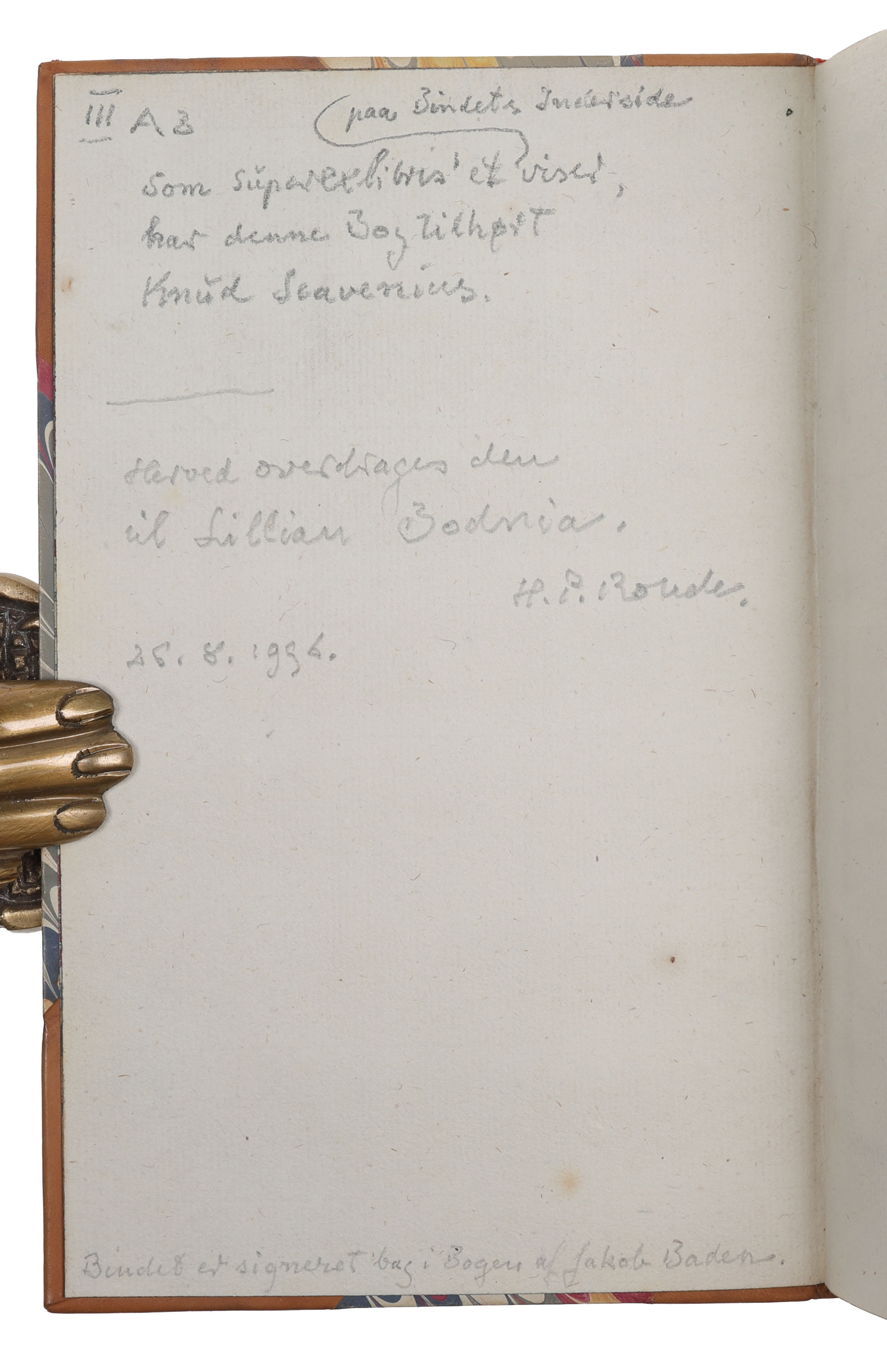 Kjøbenhavn, Thieles Bogtrykkerie, 1817. 8vo. Indbundet i et smukt senere halvlæderbind med rig rygforgyldning. Forgyldt titel på forperm (Jakob Baden). En smule ubetydeligt slid ved øvre kapitæl. Med Knud Scavenius' forgyldte exlibris præget på indersiden af forperm. Længere note af H.P. Rohde på verso af forsatsblad. Særdeles ren indvendig. 24 pp.