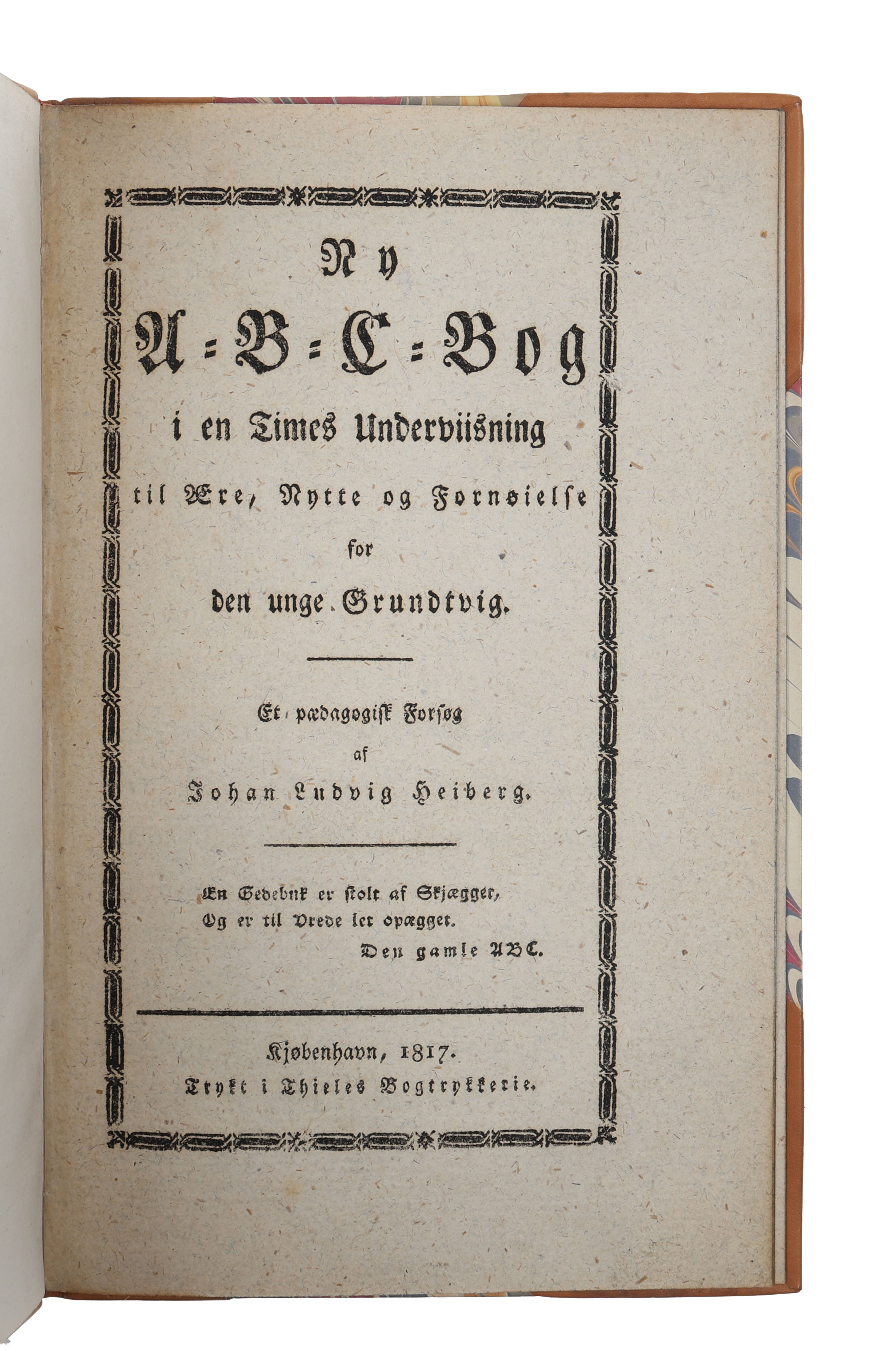 Særdeles nydeligt eksemplar af den ualmindelige originaludgave af Heibergs satiriske ABC-parodi. Eksemplaret har tilhørt de to prominente danske bogsamlere Knud Scavenius og H.P. Rohde.