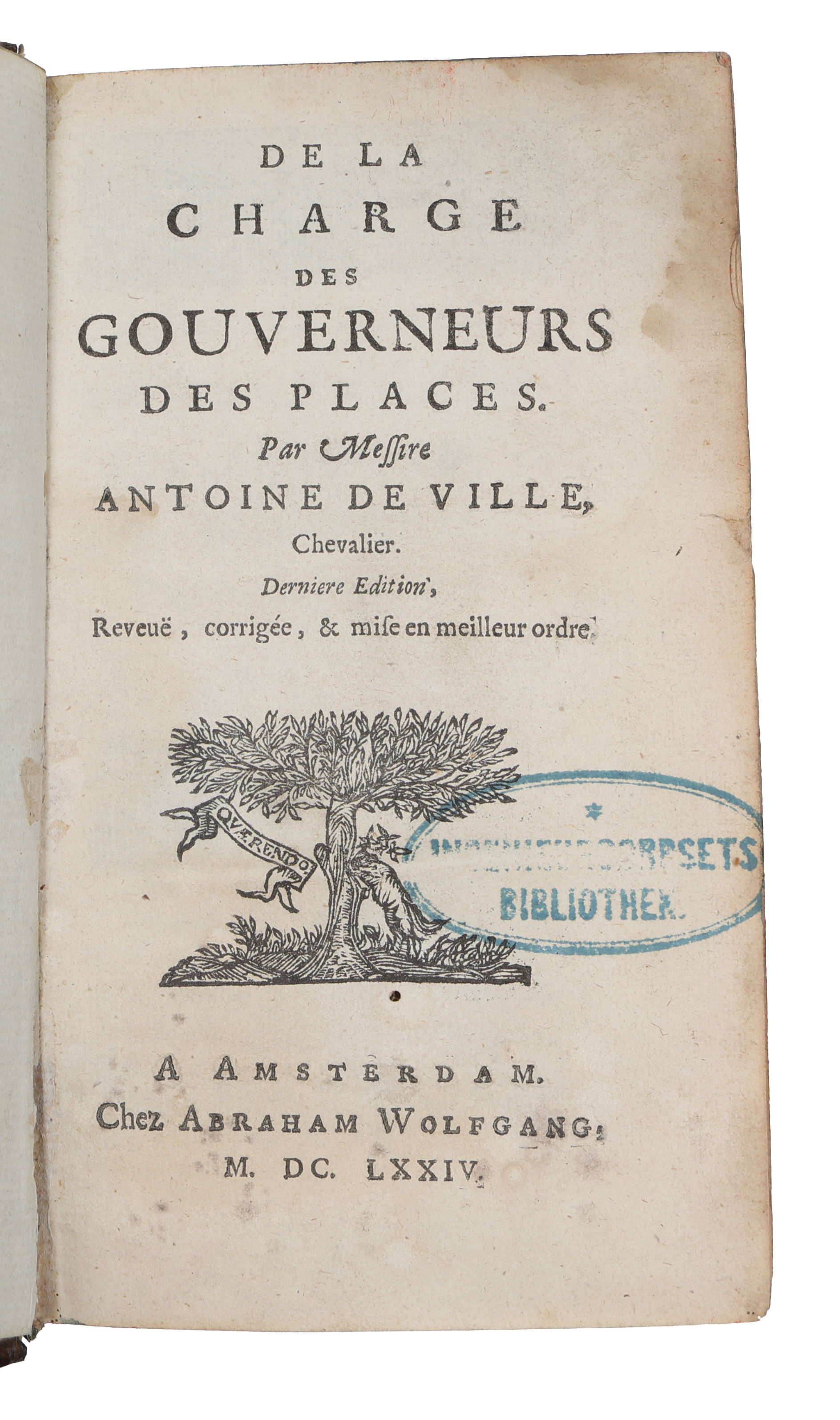 Final edition, corrected and improved, of Ville’s work dedicated to Cardinal Richelieu, describing in detail the management of a fortress, how to correct its defects and places significant emphasis on the quality of the personnel: governor, cavalry, commander etc. This work had a great influence on Vauban.