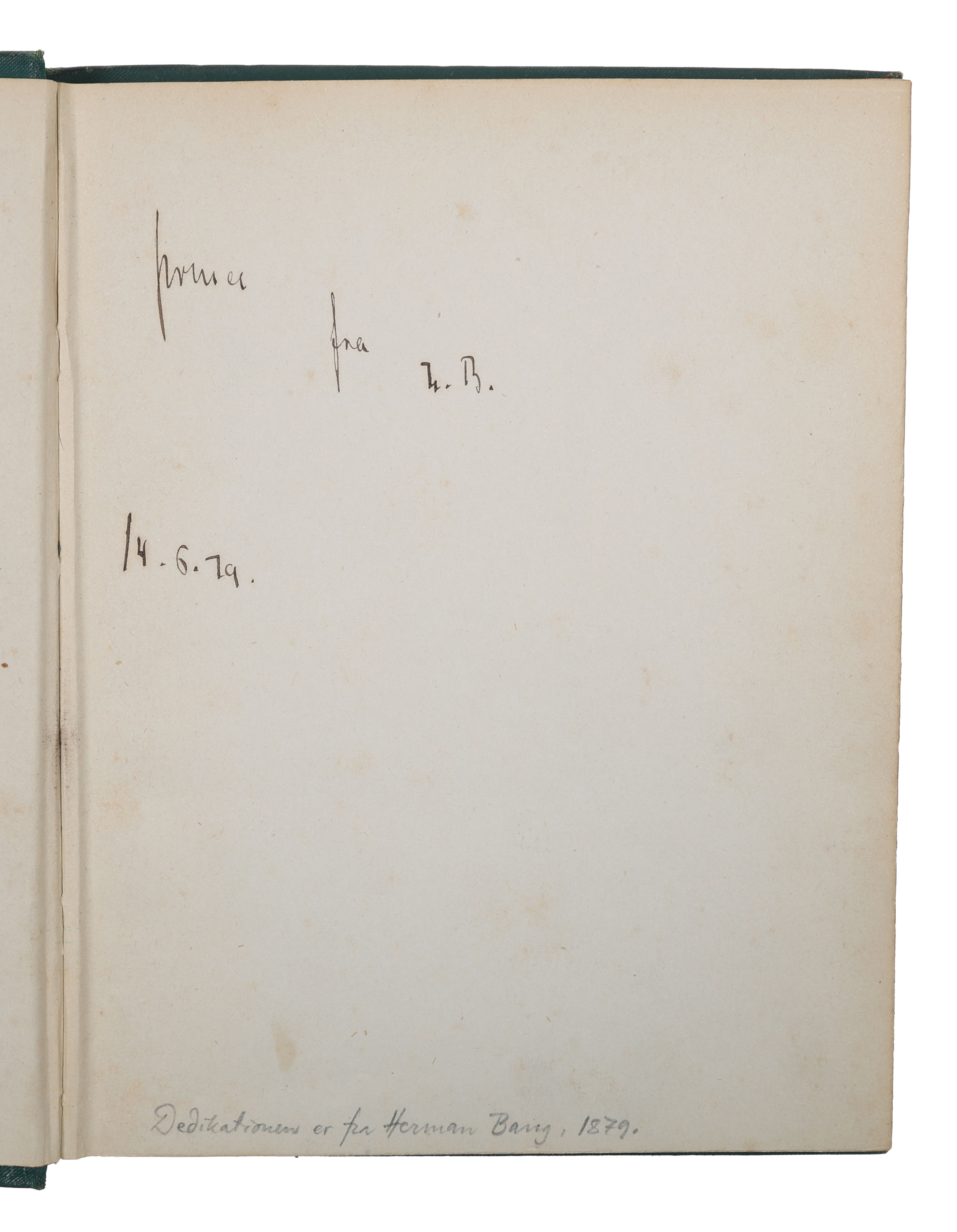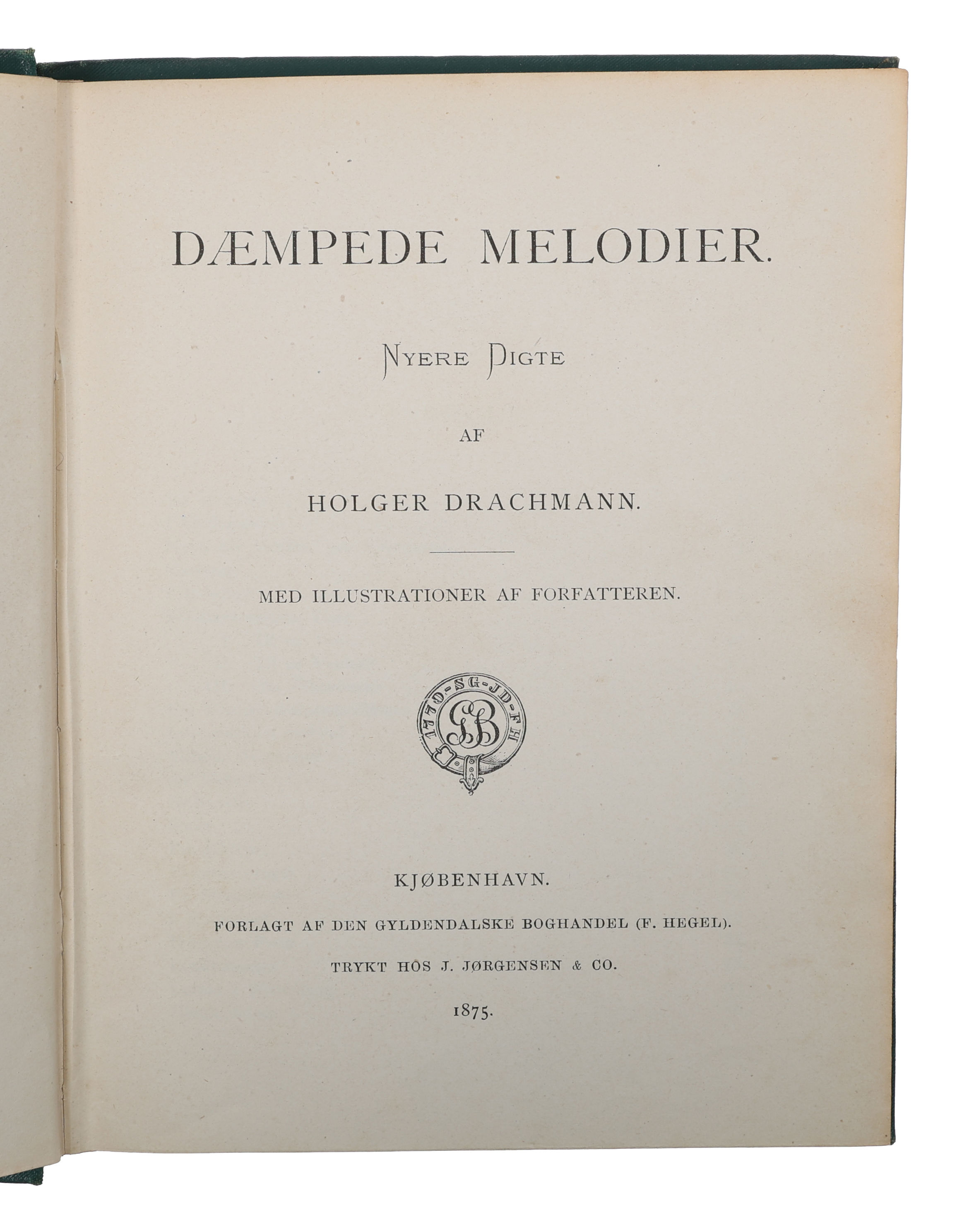 Kjøbenhavn, Den Gyldendalske Boghandel (F. Hegel), 1875. 8vo. Indbundet i det originale komponerede helshirtingbind med forgyldt rygtitel og rigt dekorerede permer. En smule ubetydeligt slid ved kapitæler og kanter. Helt guldsnit. Bogblok en smule skæv. Med kortfattet, egenhændig tilskrift fra Herman Bang på fribladet. Med frontispieceportræt af Drachmann. En smule brunet, ellers ren og pæn indvendig.