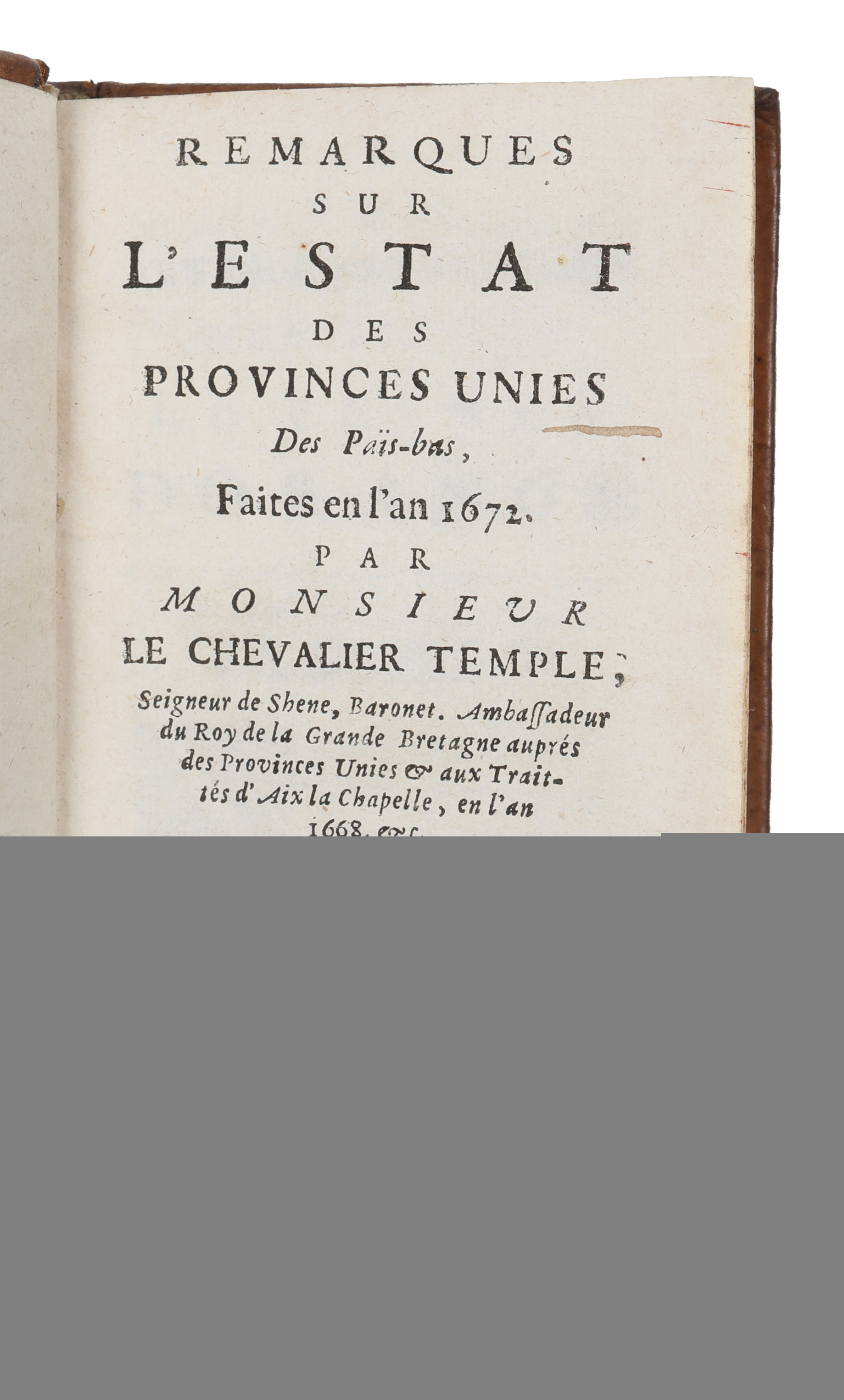 Later edition, first published in 1673, of Temple’s exposition on the tumultuous events of 1672, often referred to in Dutch history as the Rampjaar ("Disaster Year"), the book examines the internal and external challenges facing the Dutch Republic. The year 1672 was marked by a coordinated attack on the Dutch Republic by France, England and the German areas of Münster and Cologne.It is regarded as being one of the most significant crises in Dutch history, a time when the Republic’s survival was under threat. Sir William Temple, 1st Baronet (1628 –1699) was an English diplomat, politician and writer. An important diplomat, he was recalled in 1679, and for a brief period was a leading advisor to Charles II of England, with whom he then fell out.