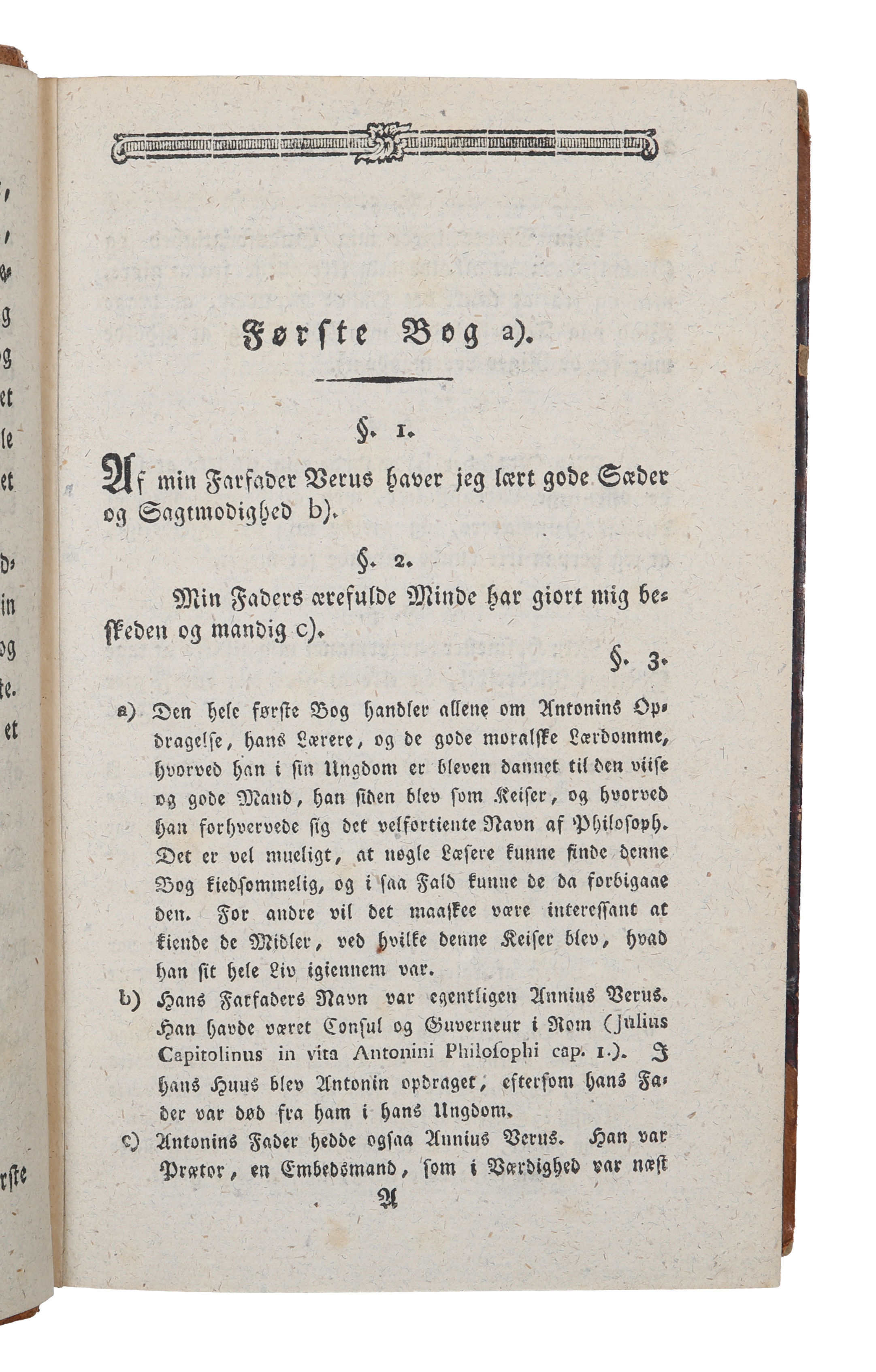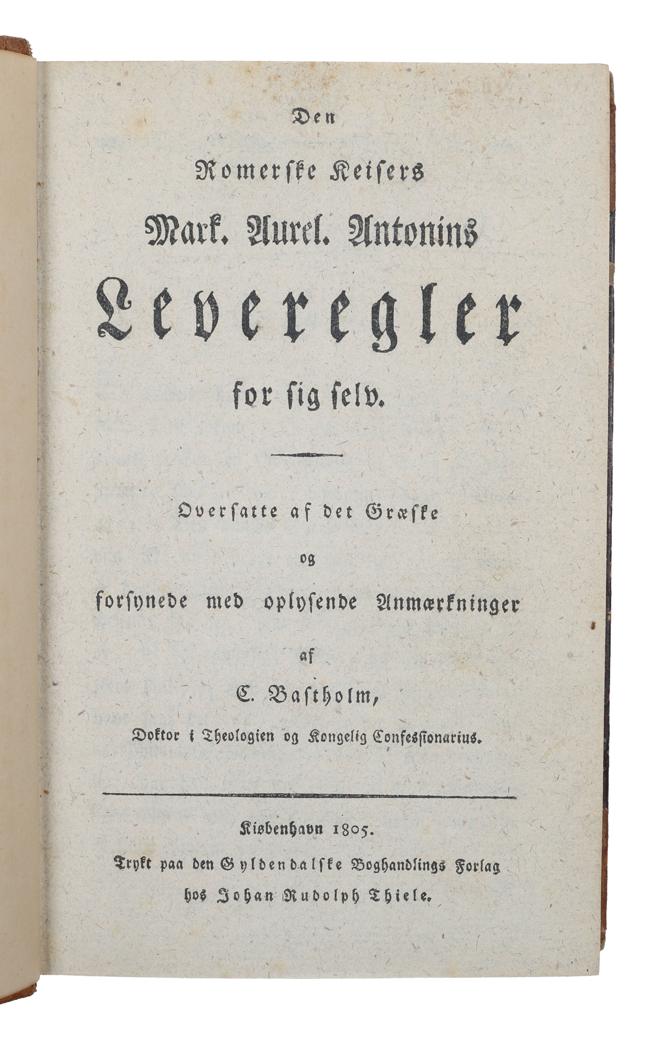 Særdeles nydeligt eksemplar af Bastholms oversættelse af Marcus Aurelius, der udgør den første egentlige oversættelse af værket til dansk. En dansk oversættelse udkom ganske vist i Odense i 1752, men da denne blot var en oversættelse af en tidligere tysk oversættelse (Hoffmann, 1723), kan denne næppe anses for at være den første.